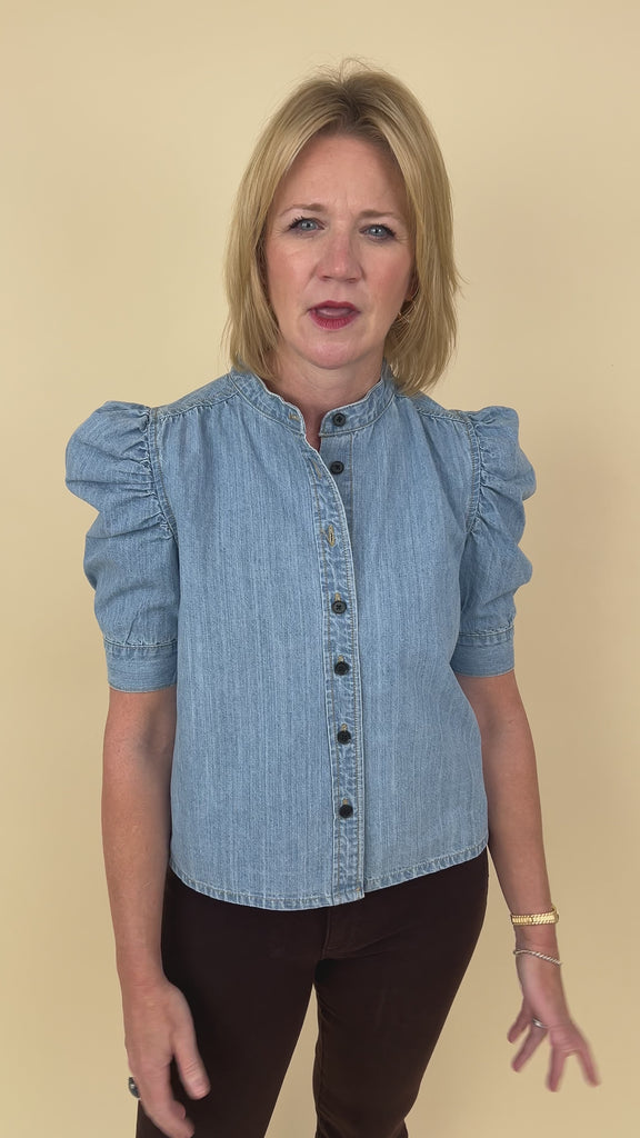 Woman wearing a short sleeve printed blouse in blue tones with an easy, relaxed fit