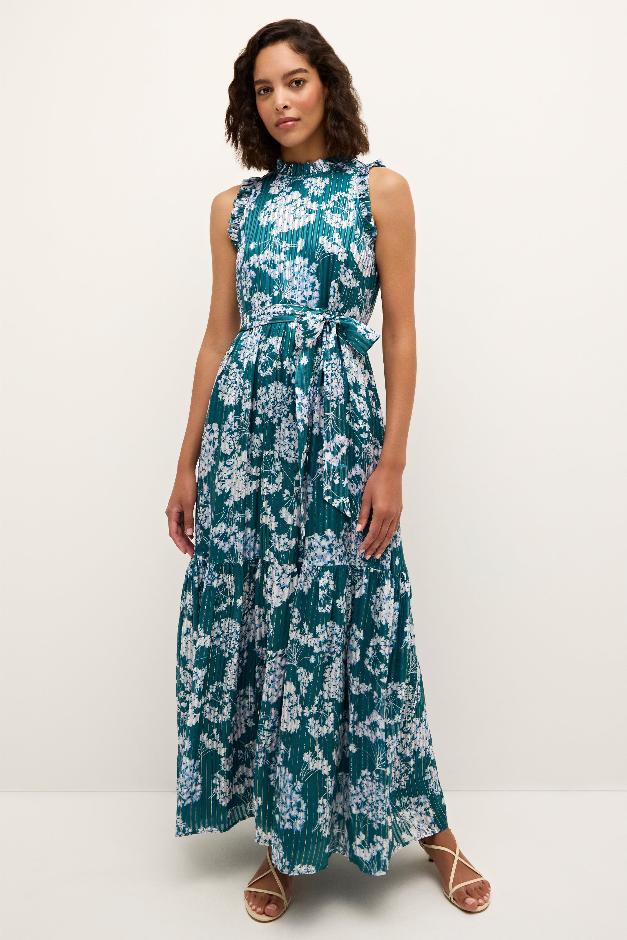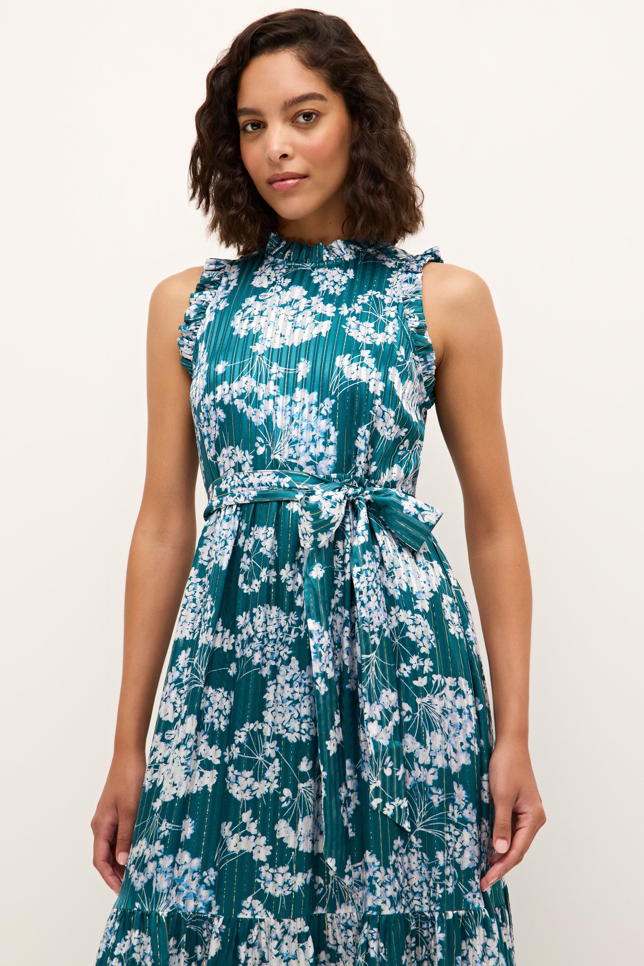 Woman wearing a neutral midi dress with soft pleating and a relaxed, polished silhouette