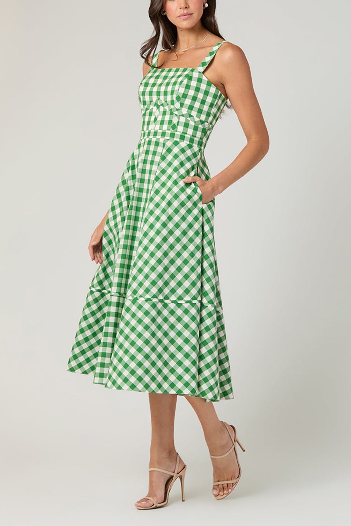 Elegant red dress with a fluid silhouette, styled for an evening setting.