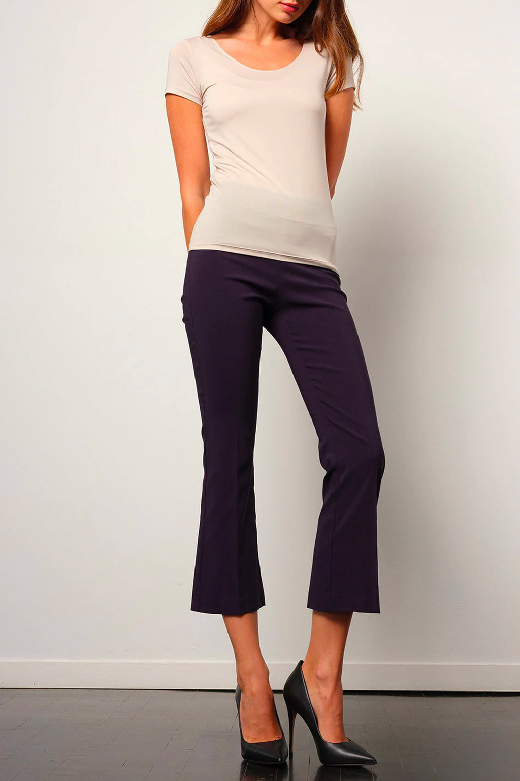 Woman wearing mid-wash flared jeans with a slim fit through the hip and gentle flare at the hem.