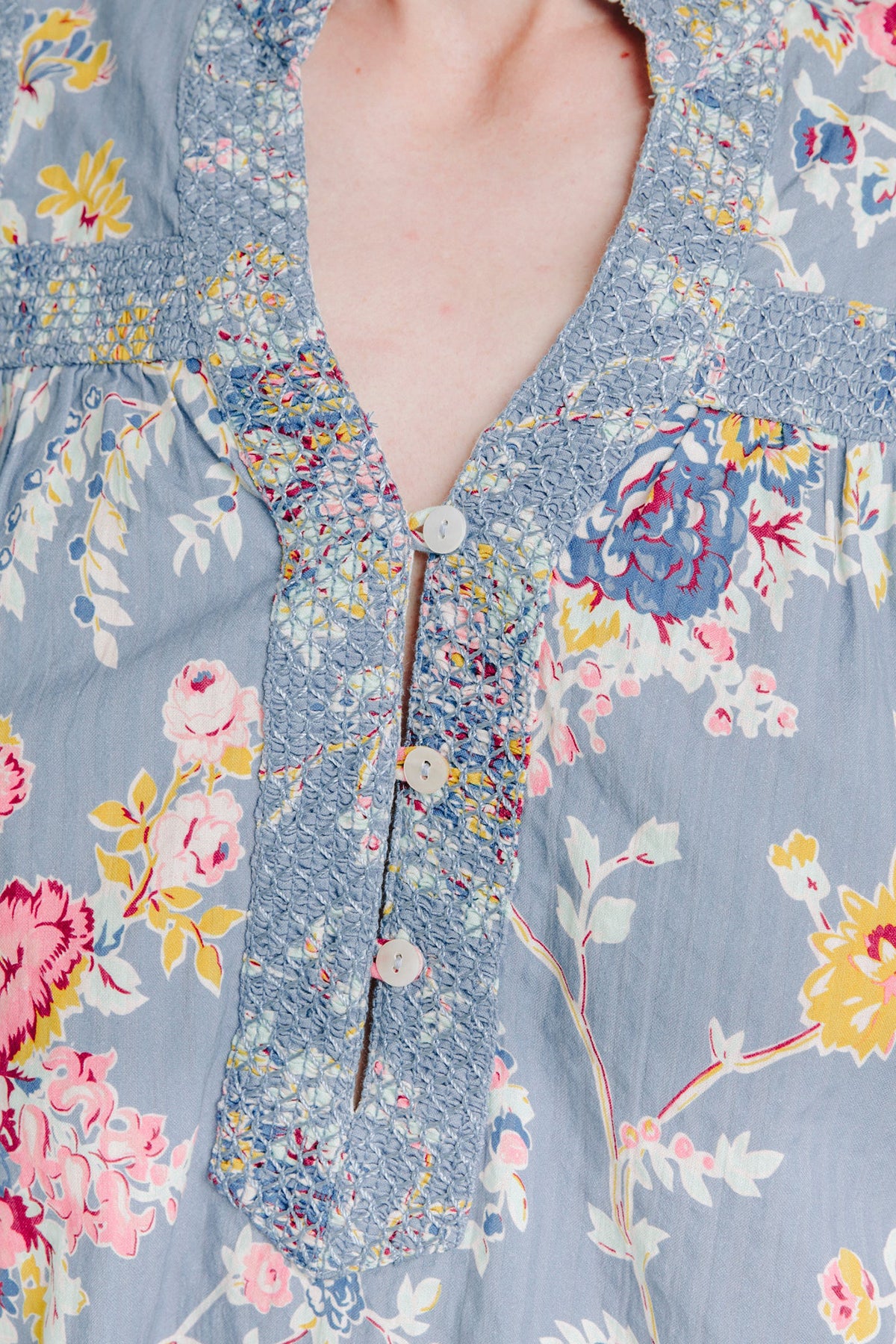 Woman wearing a short sleeve printed blouse in blue tones with an easy, relaxed fit