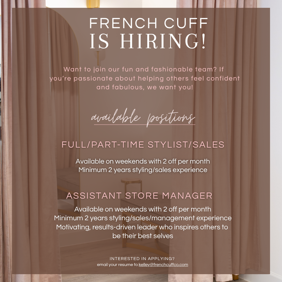 French Cuff Boutique is looking for passionate, fashion-forward individuals to join our team. We’re currently hiring Stylists and Assistant Store Managers for our Houston locations. If you have an eye for style, a love for customer connection, and thrive in a boutique environment, we’d love to hear from you! Apply by emailing your resume to kelley@frenchcuffco.com or through the link below.