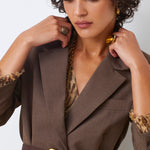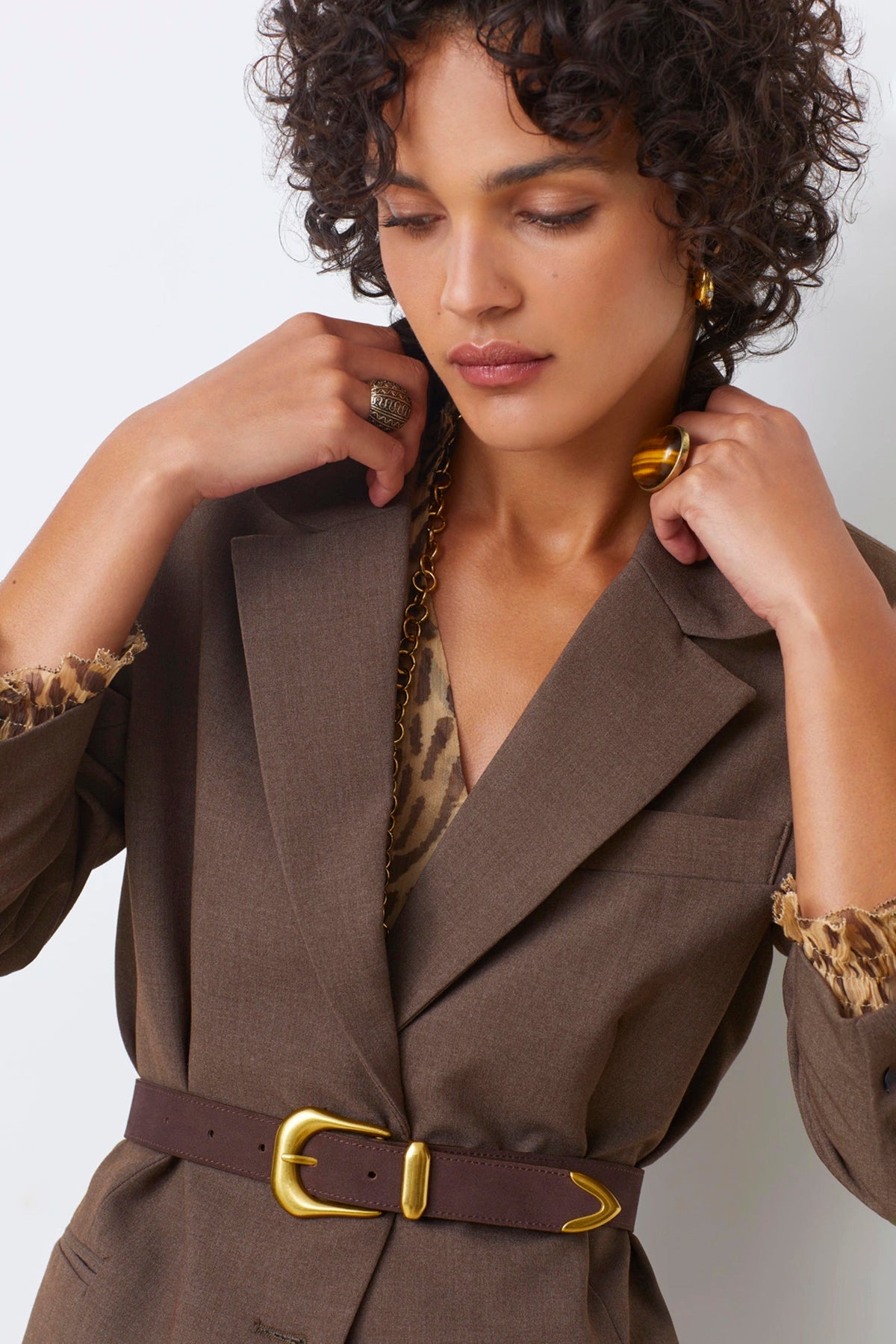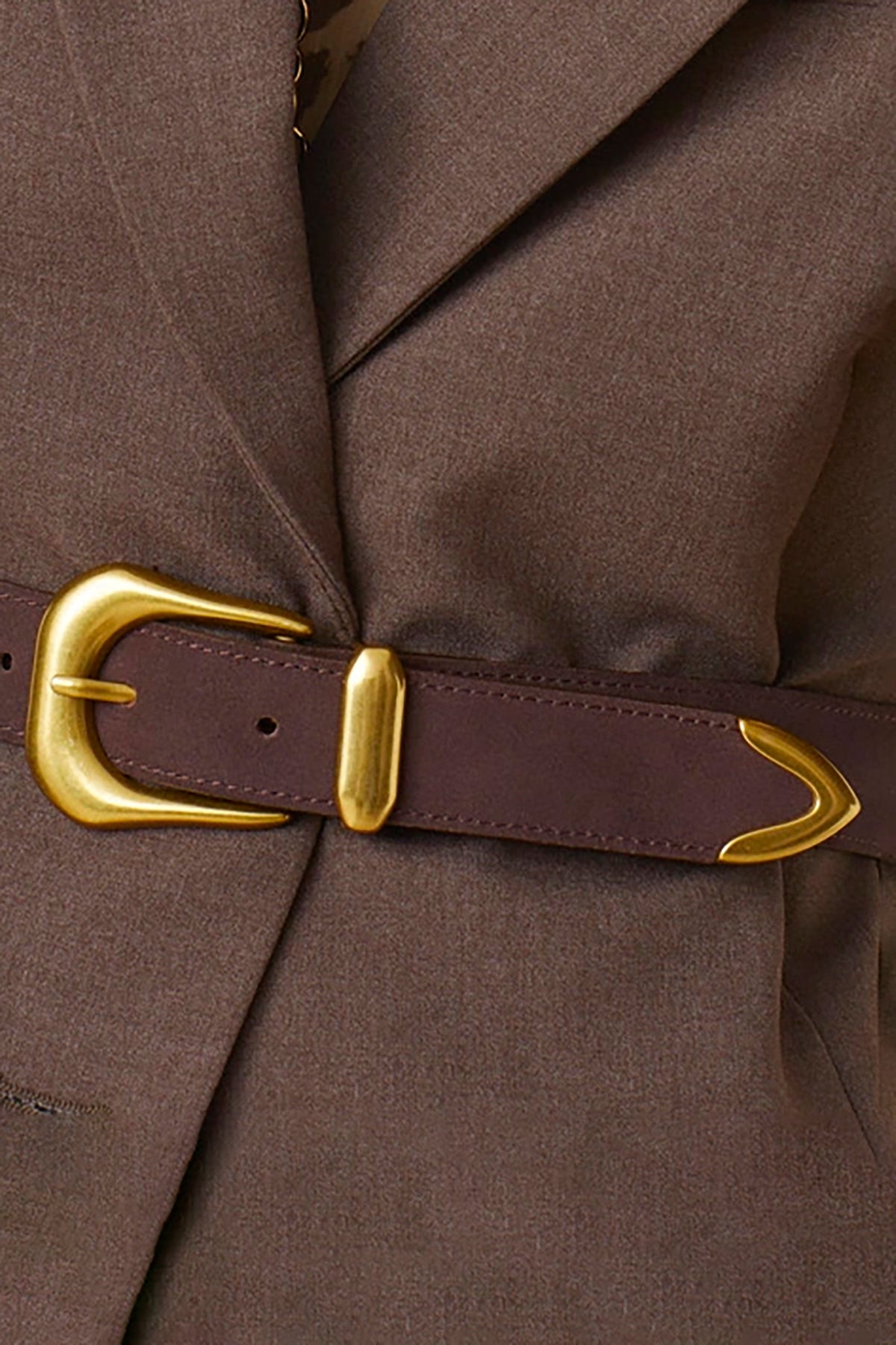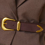 The Aila belt features brown leather with a gold buckle and detailing, adding a stylish and elegant touch to any outfit.
