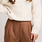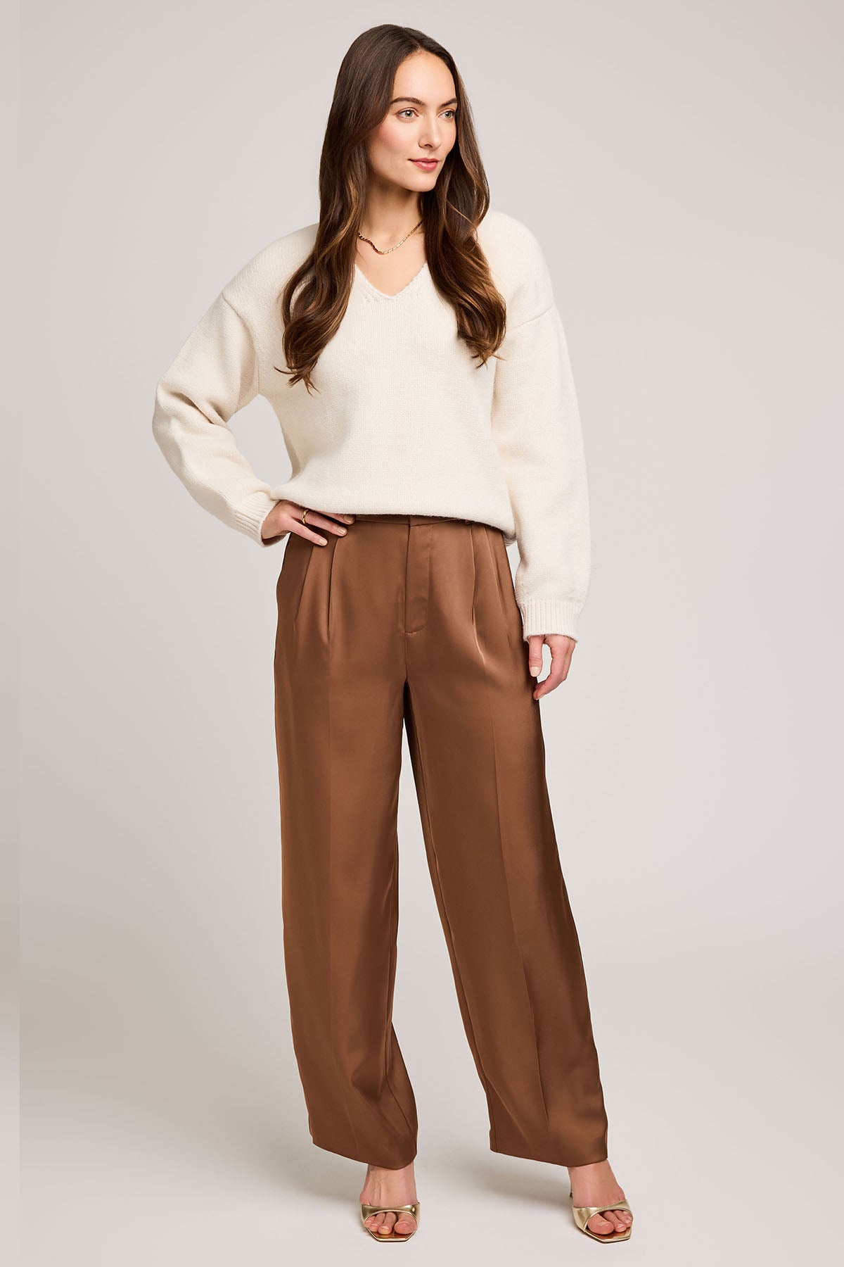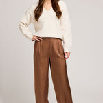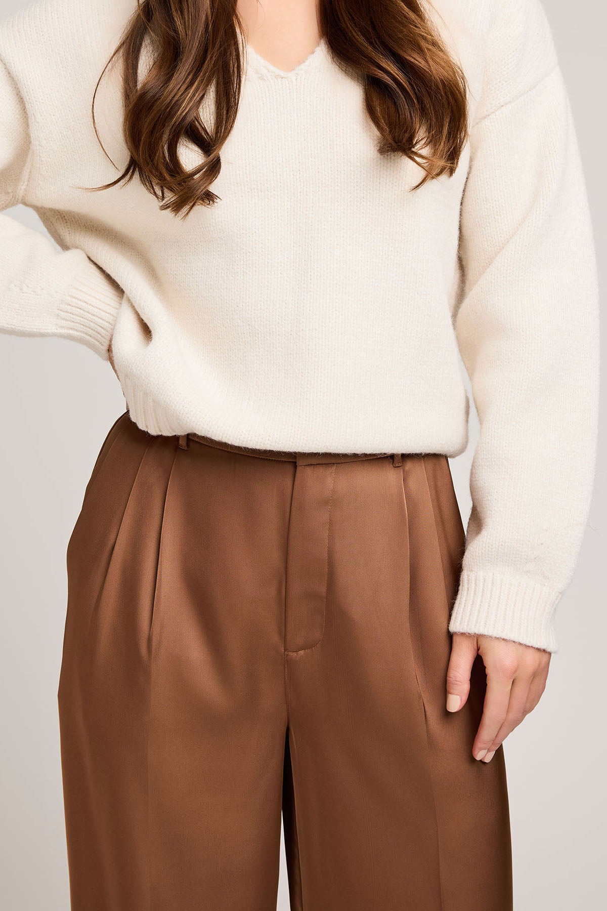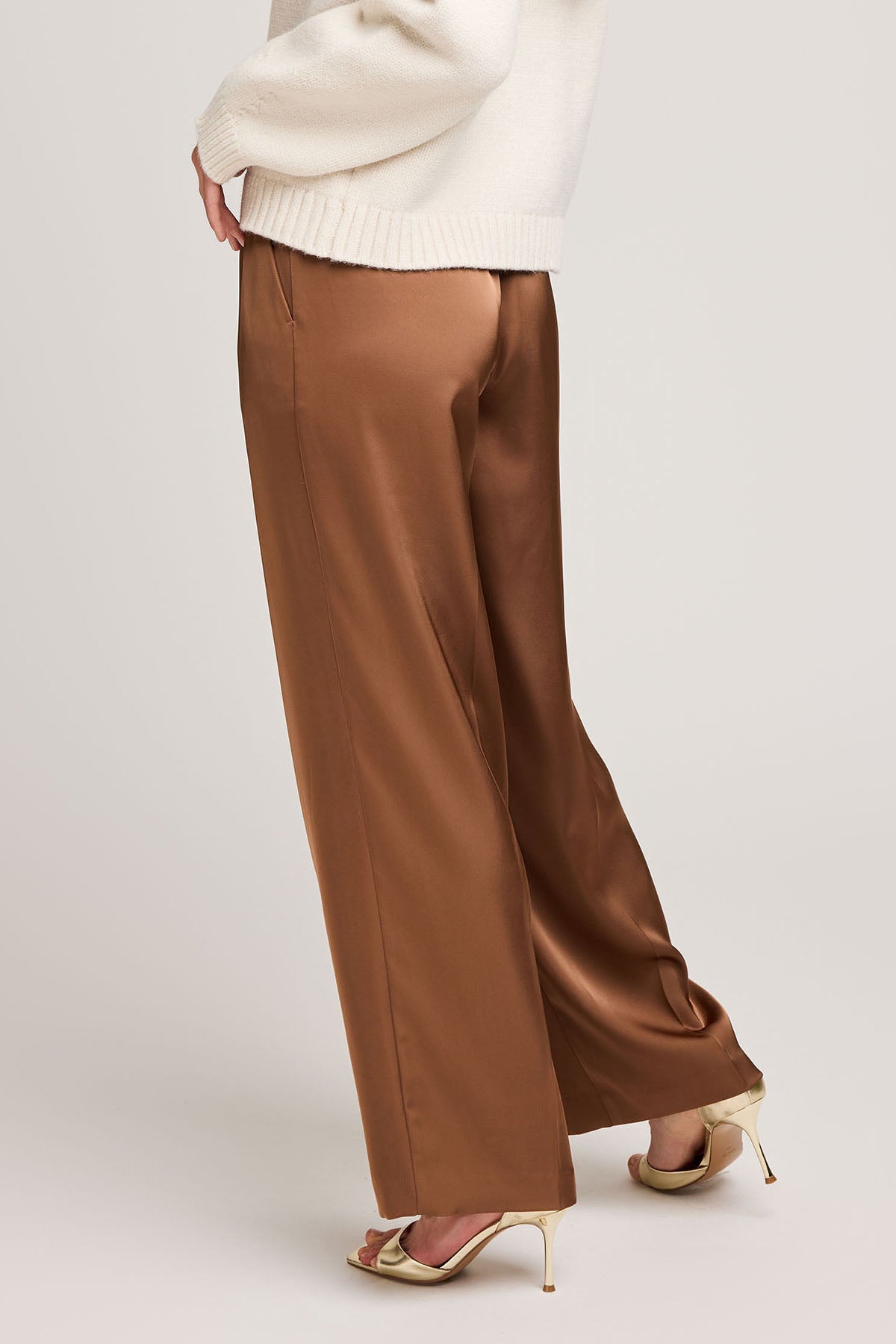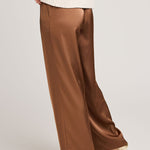 The Amelie chestnut satin trousers combine smooth fabric and a tailored fit for a stylish, polished look. Their rich chestnut color and subtle sheen make them perfect for both casual and formal occasions.