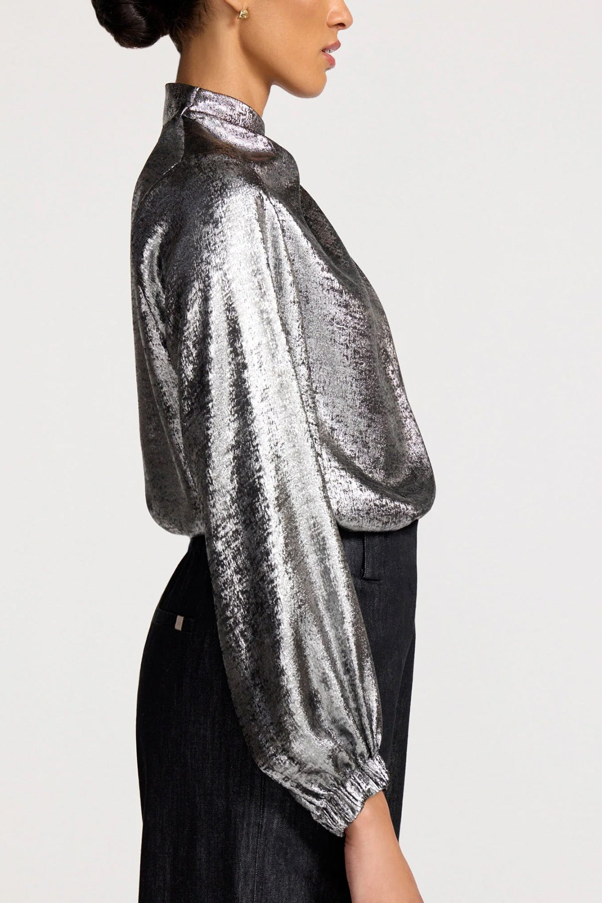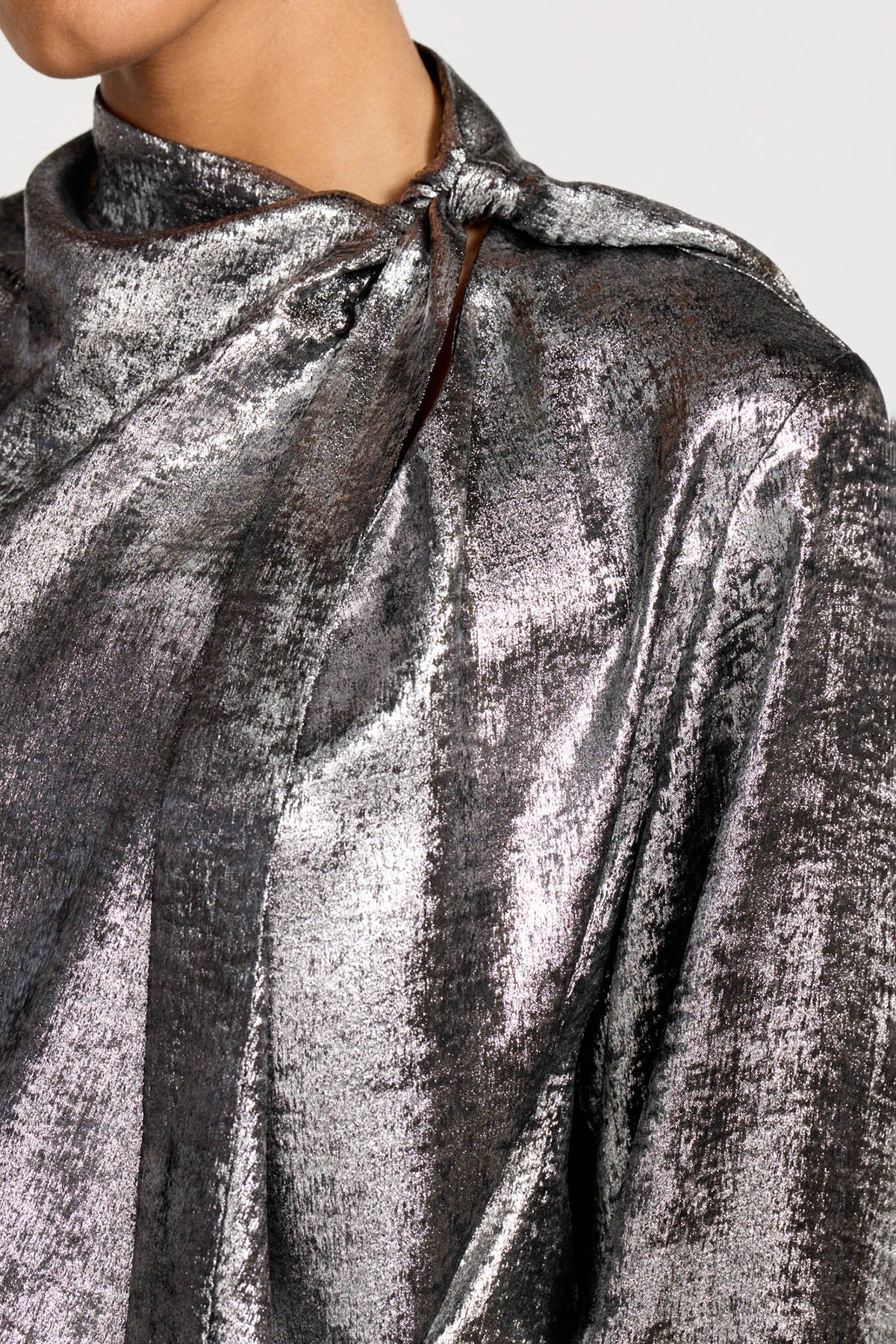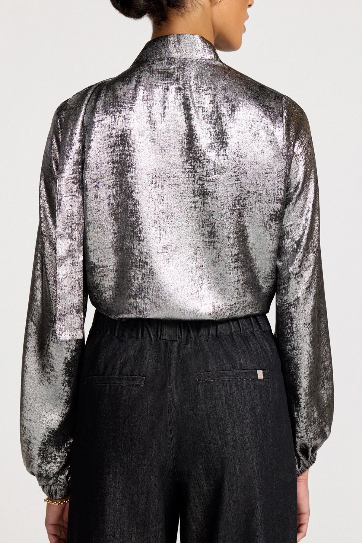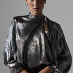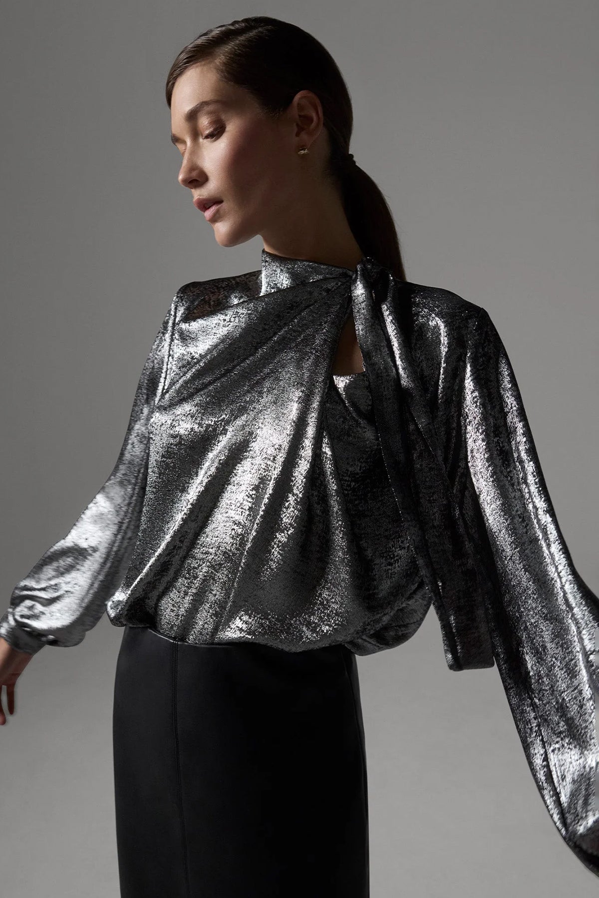 Featuring elegant long sleeves and a distinctive tie neck detail, this blouse transitions seamlessly from office to evening wear. The lustrous fabric and refined neckline create a polished silhouette that pairs beautifully with tailored trousers or a sleek skirt.