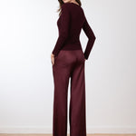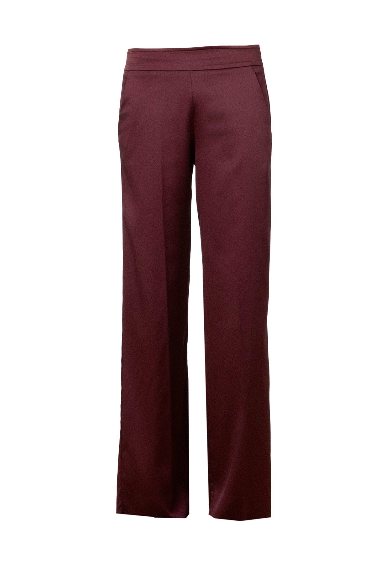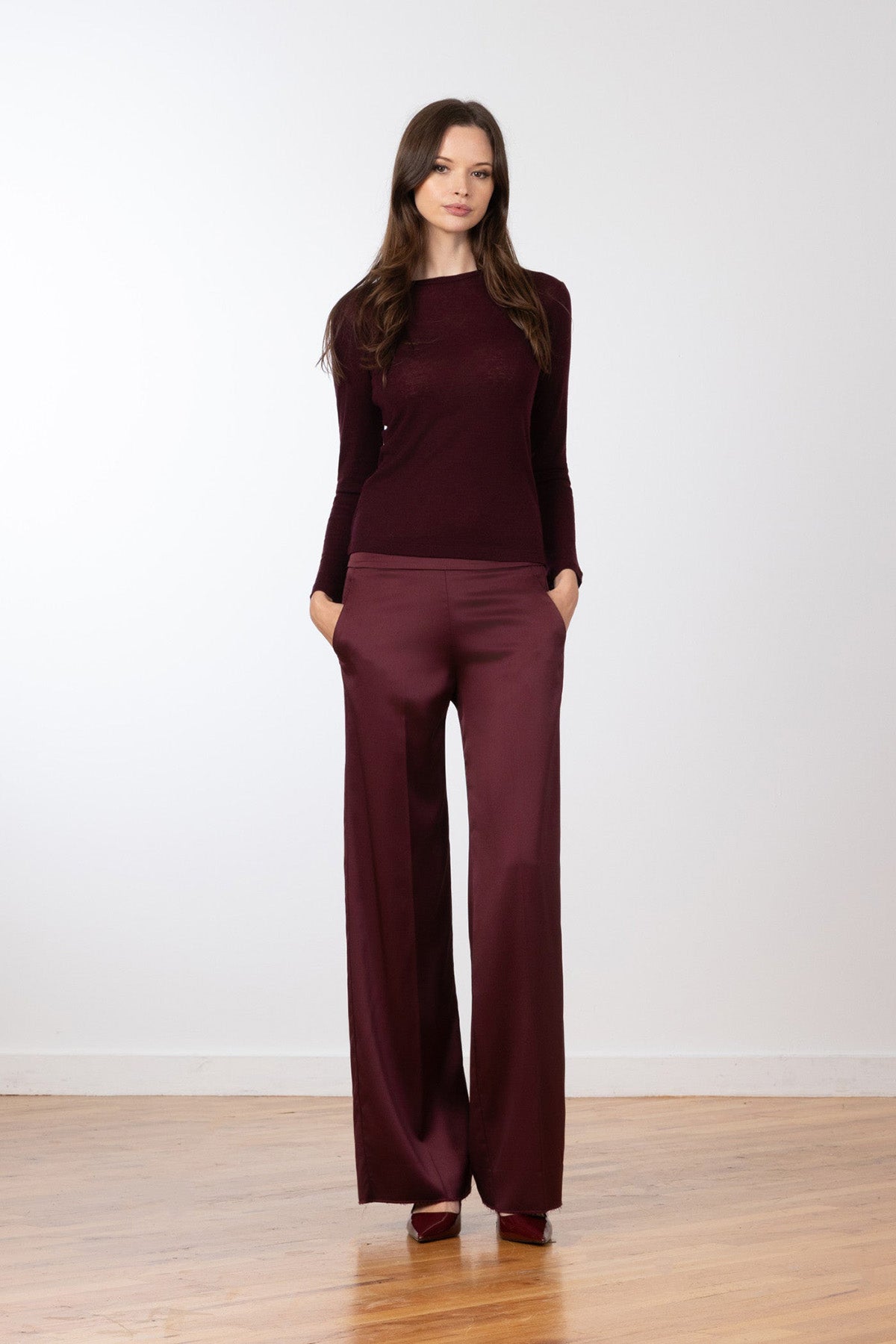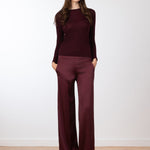The Carla pants offer a rich burgundy hue with a comfortable pull-on style and wide-leg silhouette, combining ease and elegance for a polished, fashion-forward look.