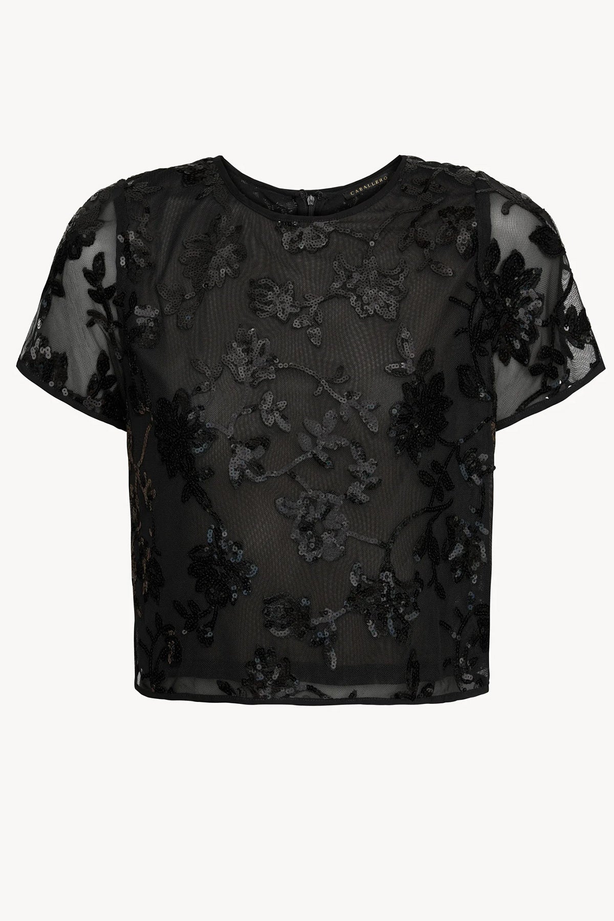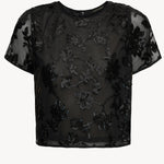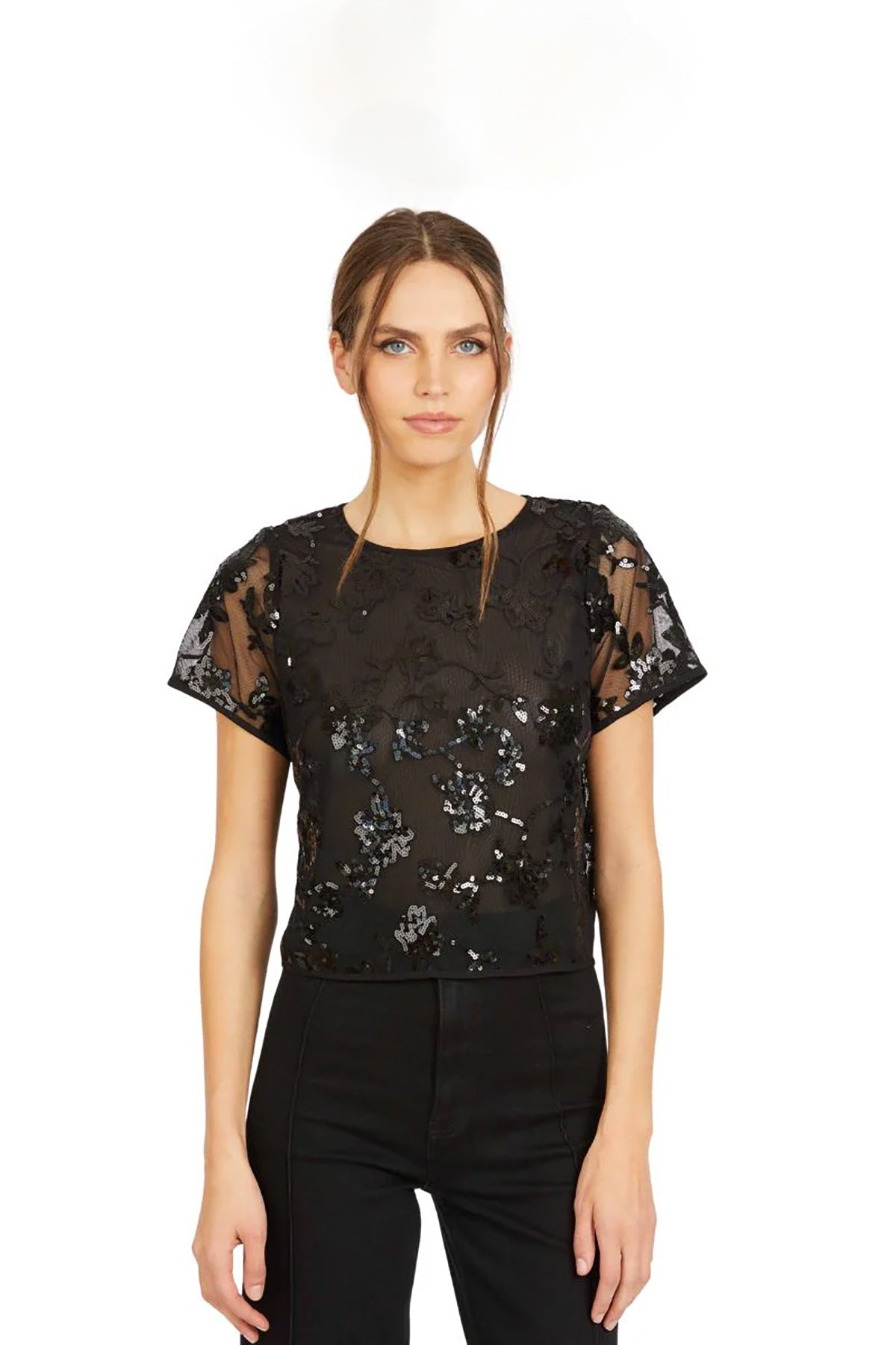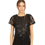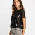 The Carmen Top is a striking black blouse featuring delicate cutouts and shimmering sequins, perfect for adding a glamorous edge to your evening wardrobe