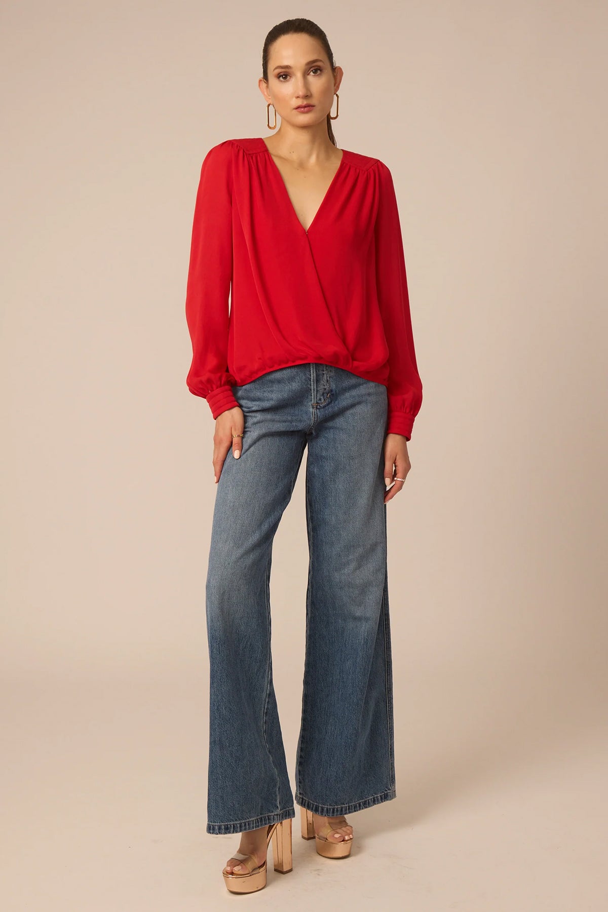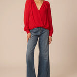 A red wrap blouse with long sleeves and an easy fit that flatters your shape. Perfect for work or weekend wear, it pairs effortlessly with trousers, skirts, or denim!