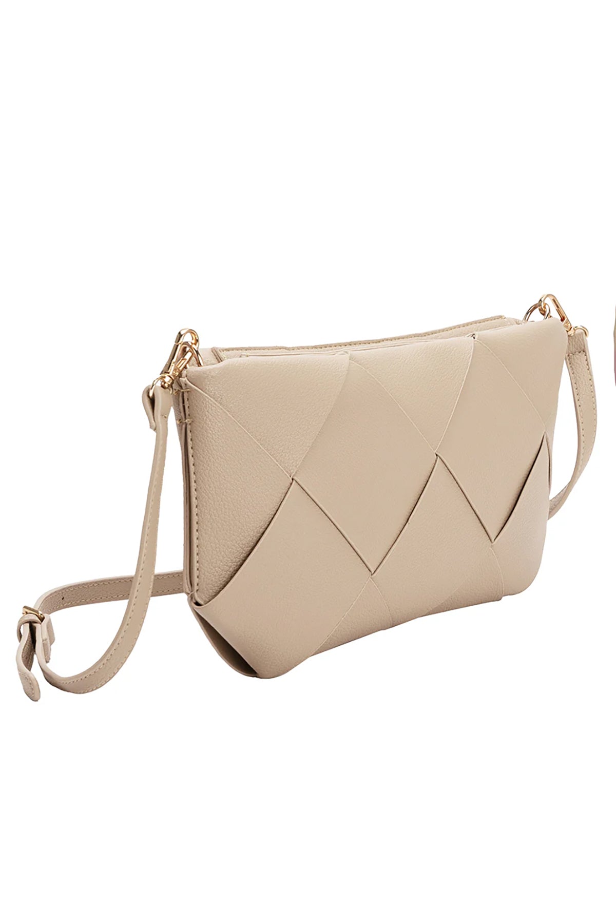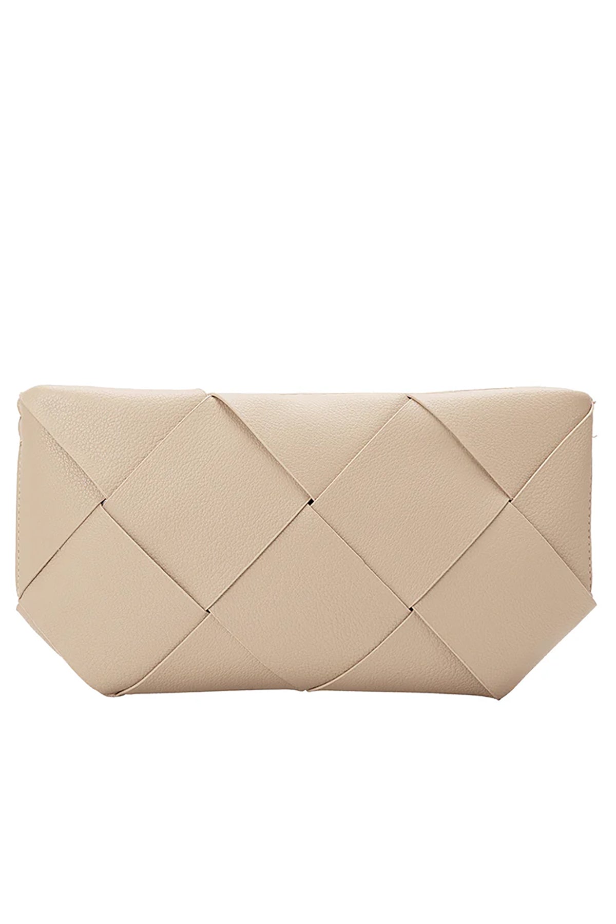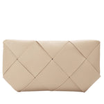 The Connie Bone Crossbody Bag features a stylish woven design made from recycled vegan leather. Handcrafted for quality, it can be carried by hand or worn with the adjustable strap.