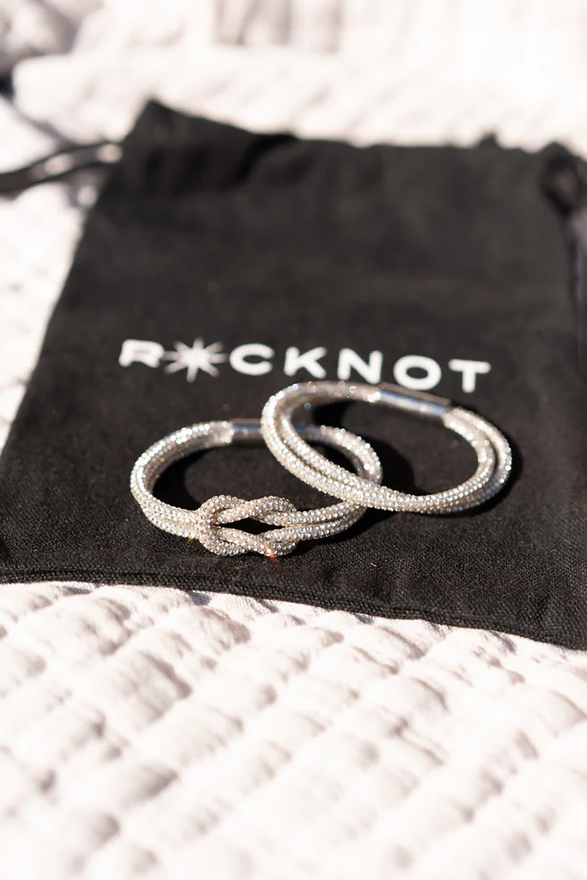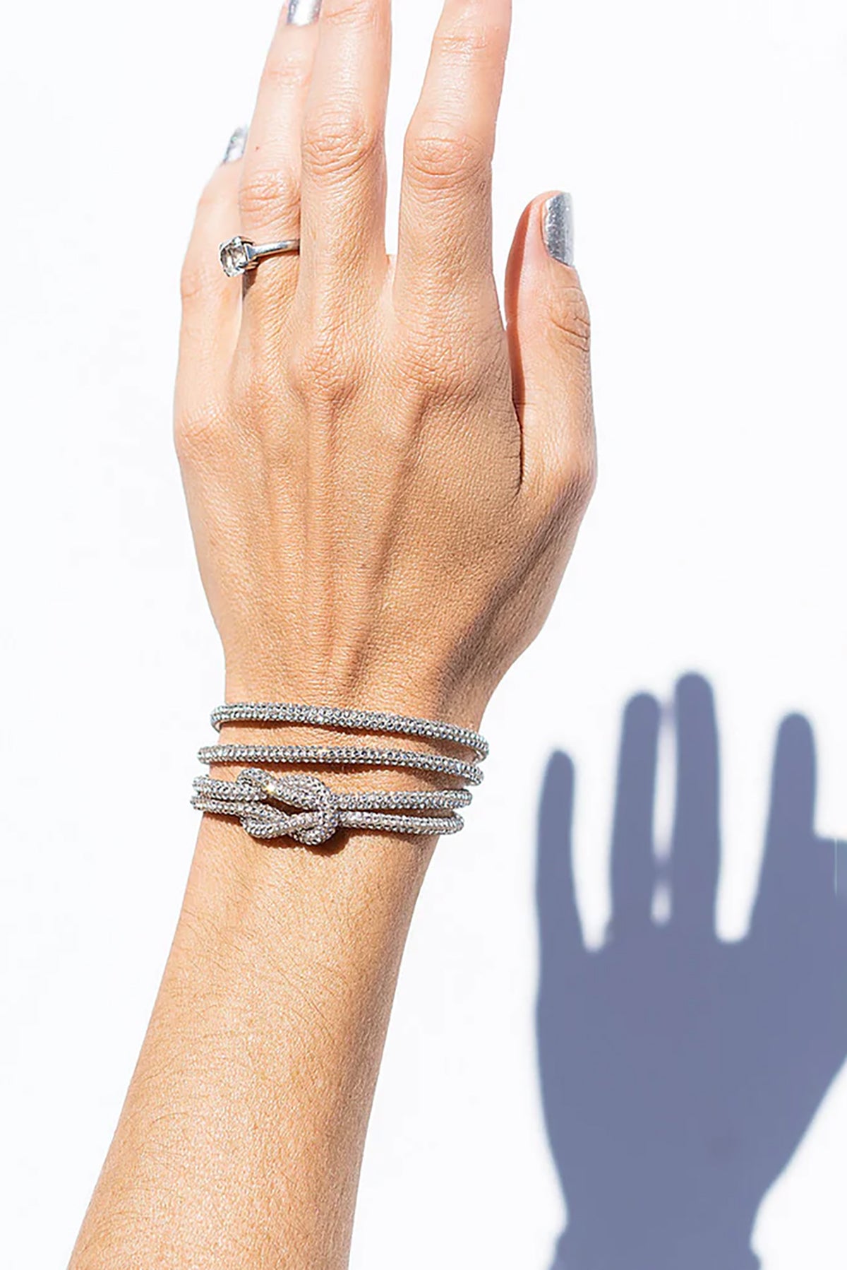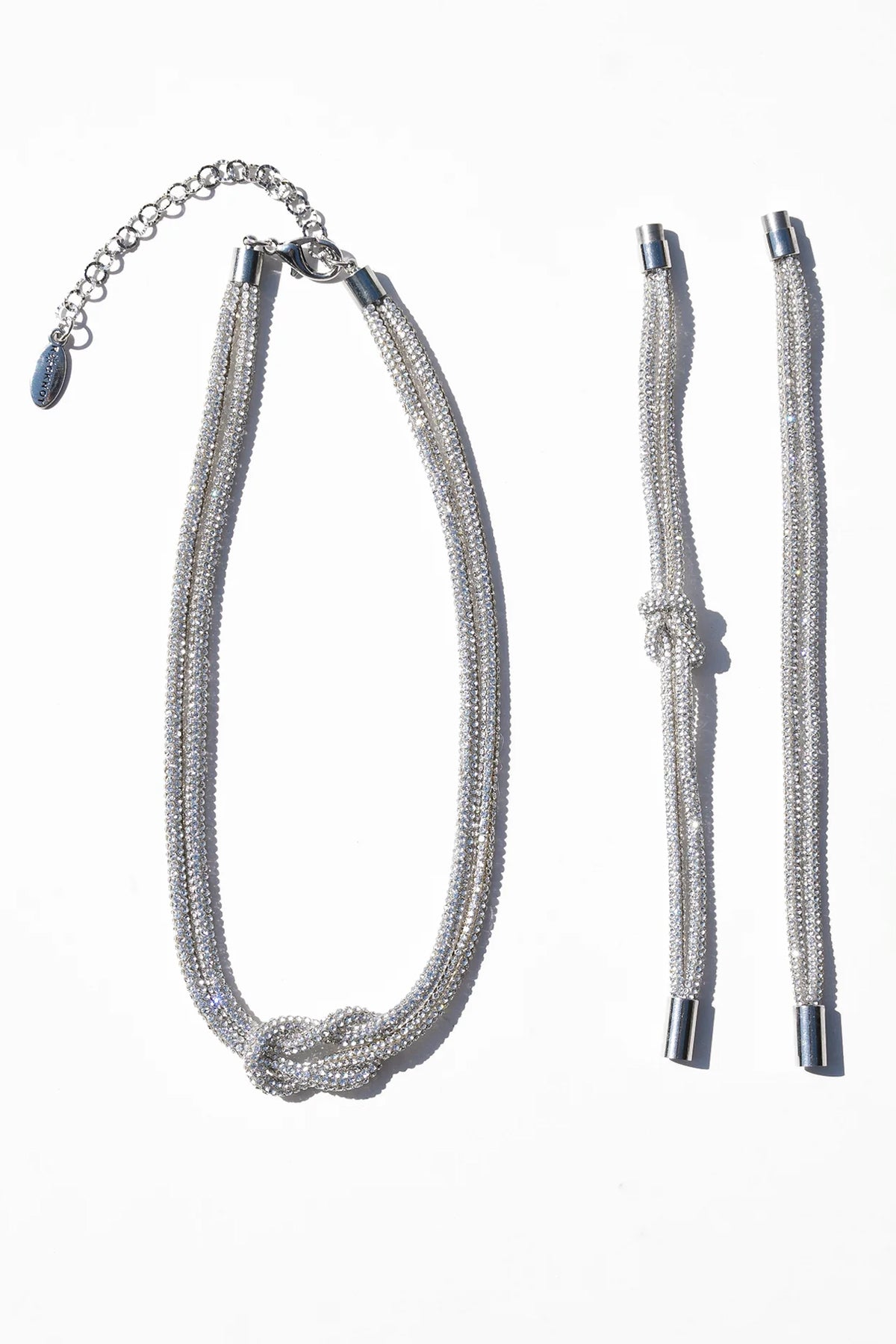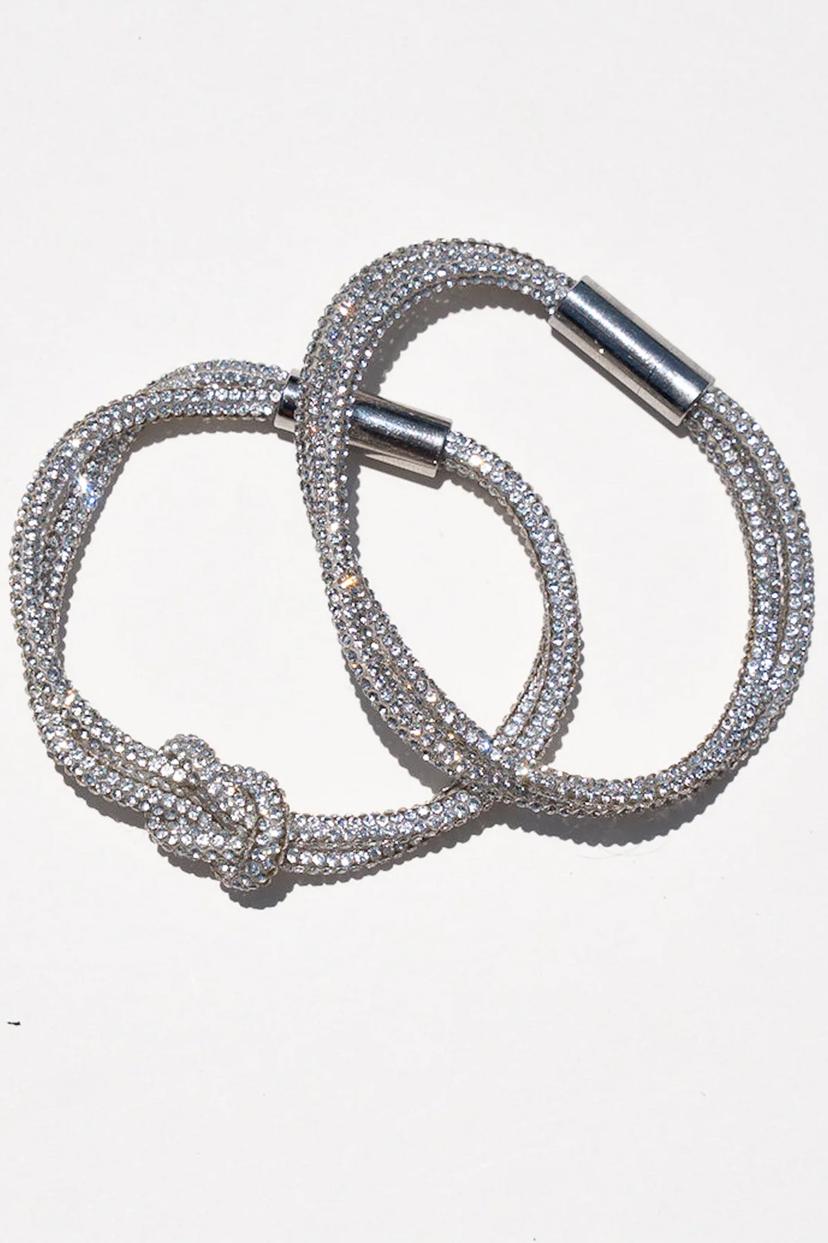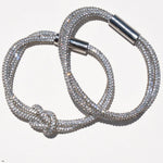Crystal knot bracelets designed for layering. Mix and match the set pieces for versatile wrist styling with sparkle and elegance.