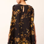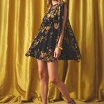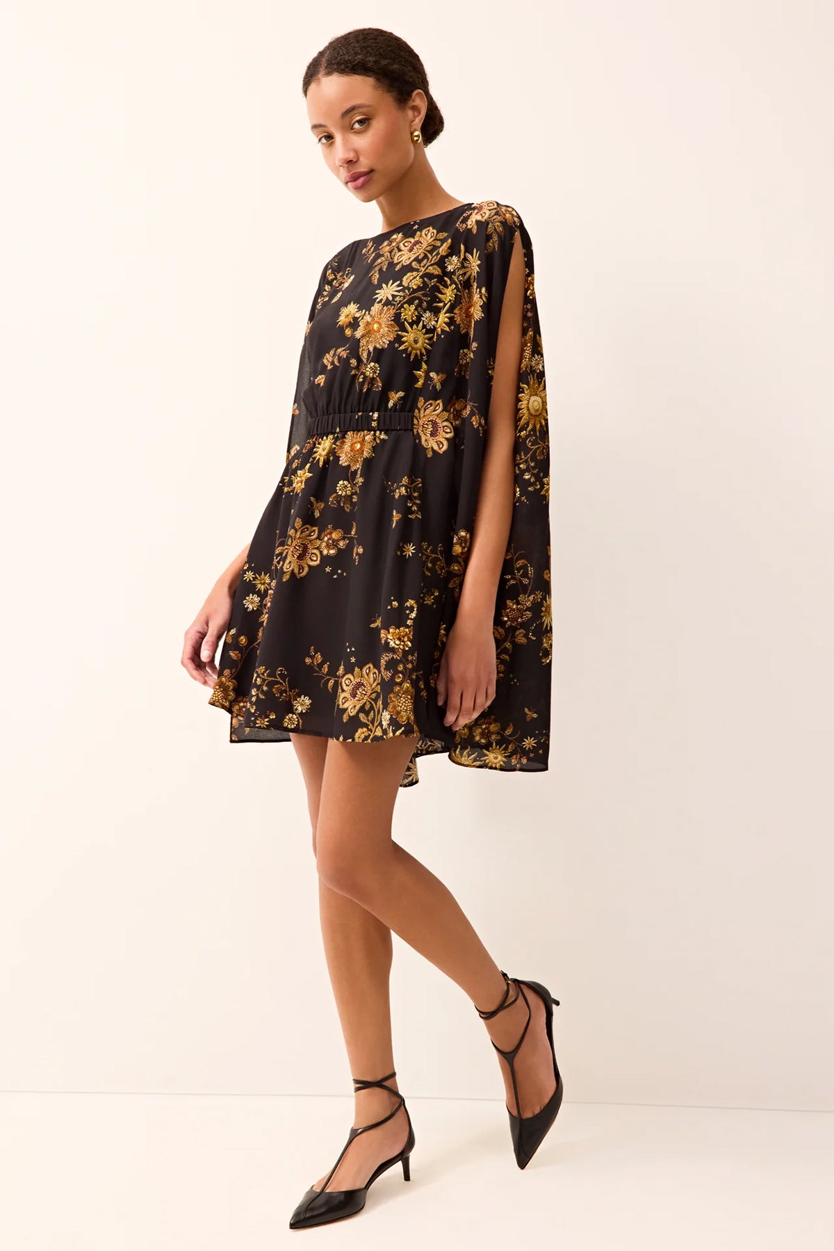 The Cyrus Dress is a luxe silk mini with a gold and black print, featuring an attached cape and flattering elastic waist. The slip-on design includes a secure button and loop closure at the back neck for an elegant, polished look.