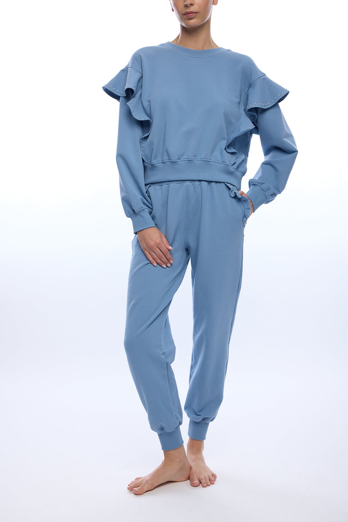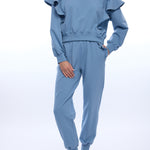 Elevate your casual wardrobe with the Devona Studded Ruffle Sweatshirt! In a rich denim blue, this sweatshirt features eye-catching silver studs and delicate ruffled detailing that adds dimension and movement. Perfect for layering or wearing solo, it's an effortless way to elevate your wardrobe while maintaining that cozy, relaxed vibe you love!