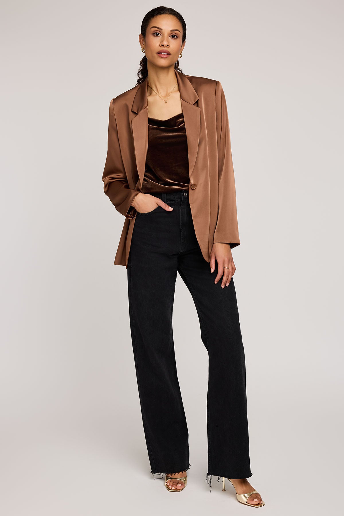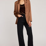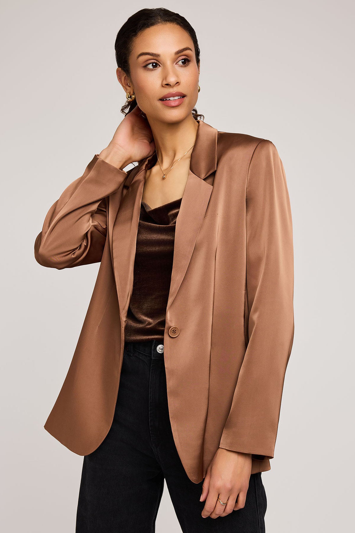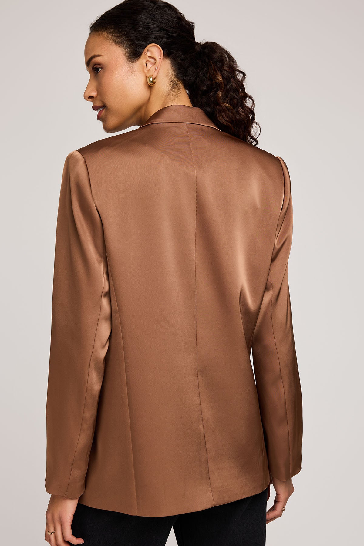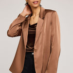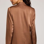 The Dione chestnut satin blazer features a smooth satin finish and tailored fit, adding a polished touch to any outfit.