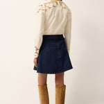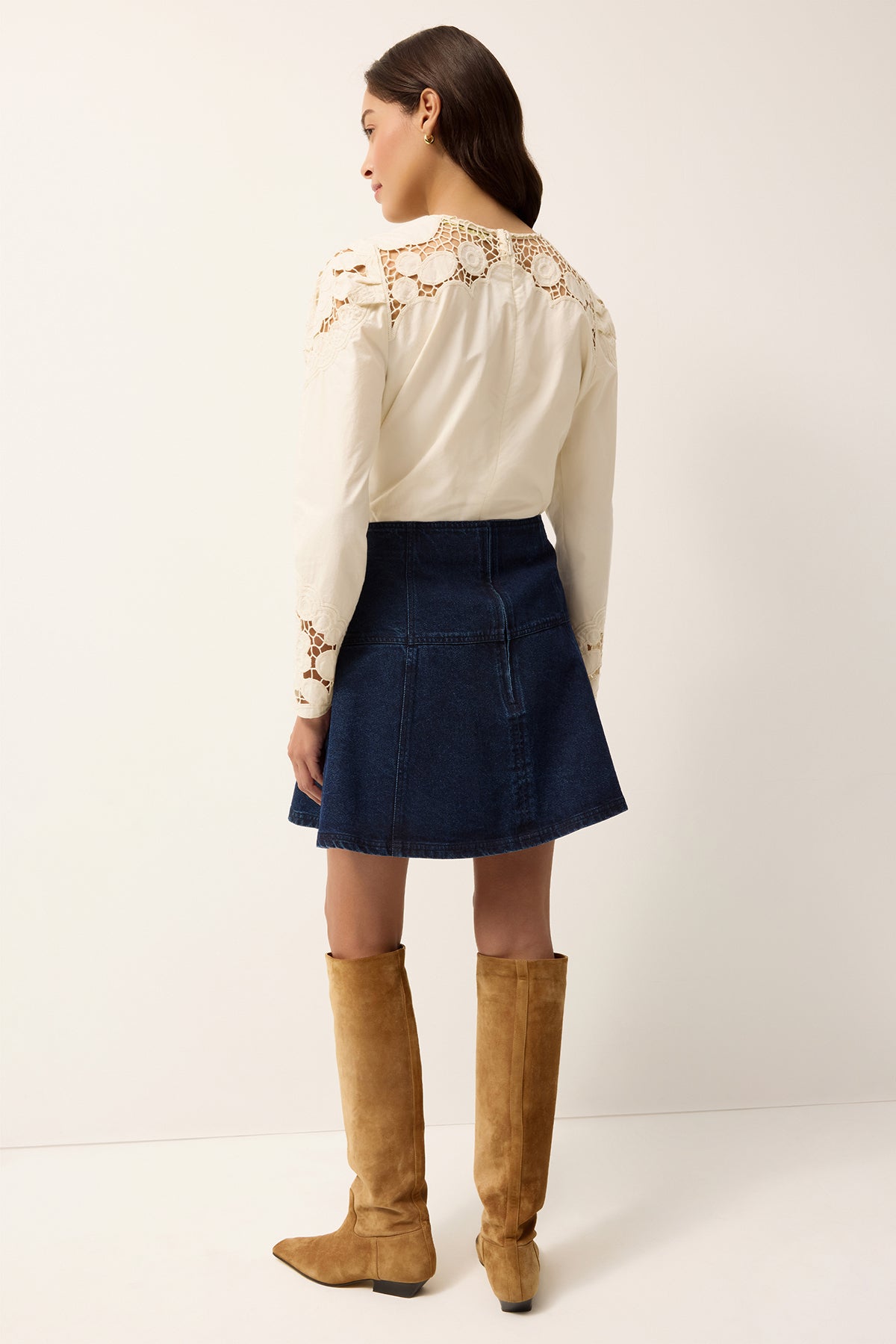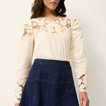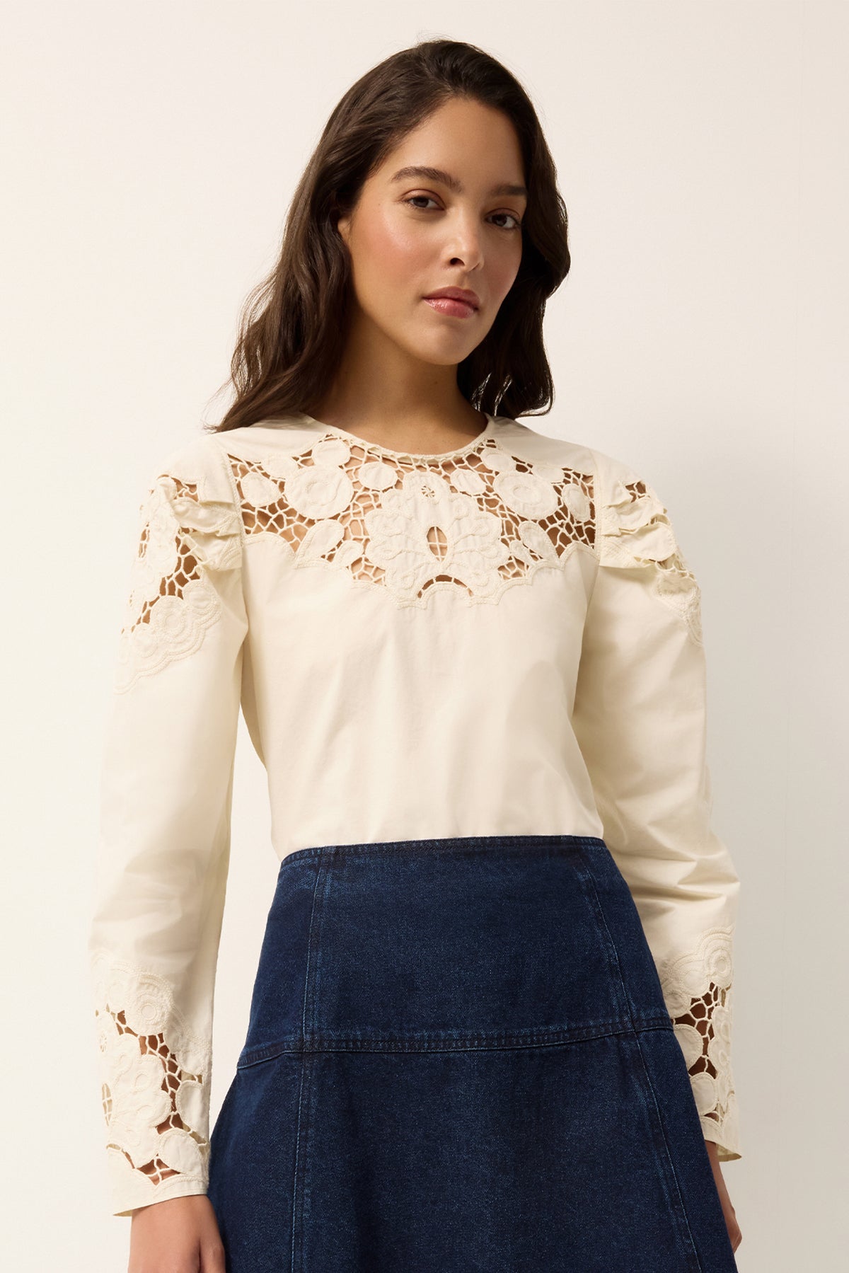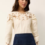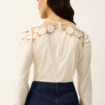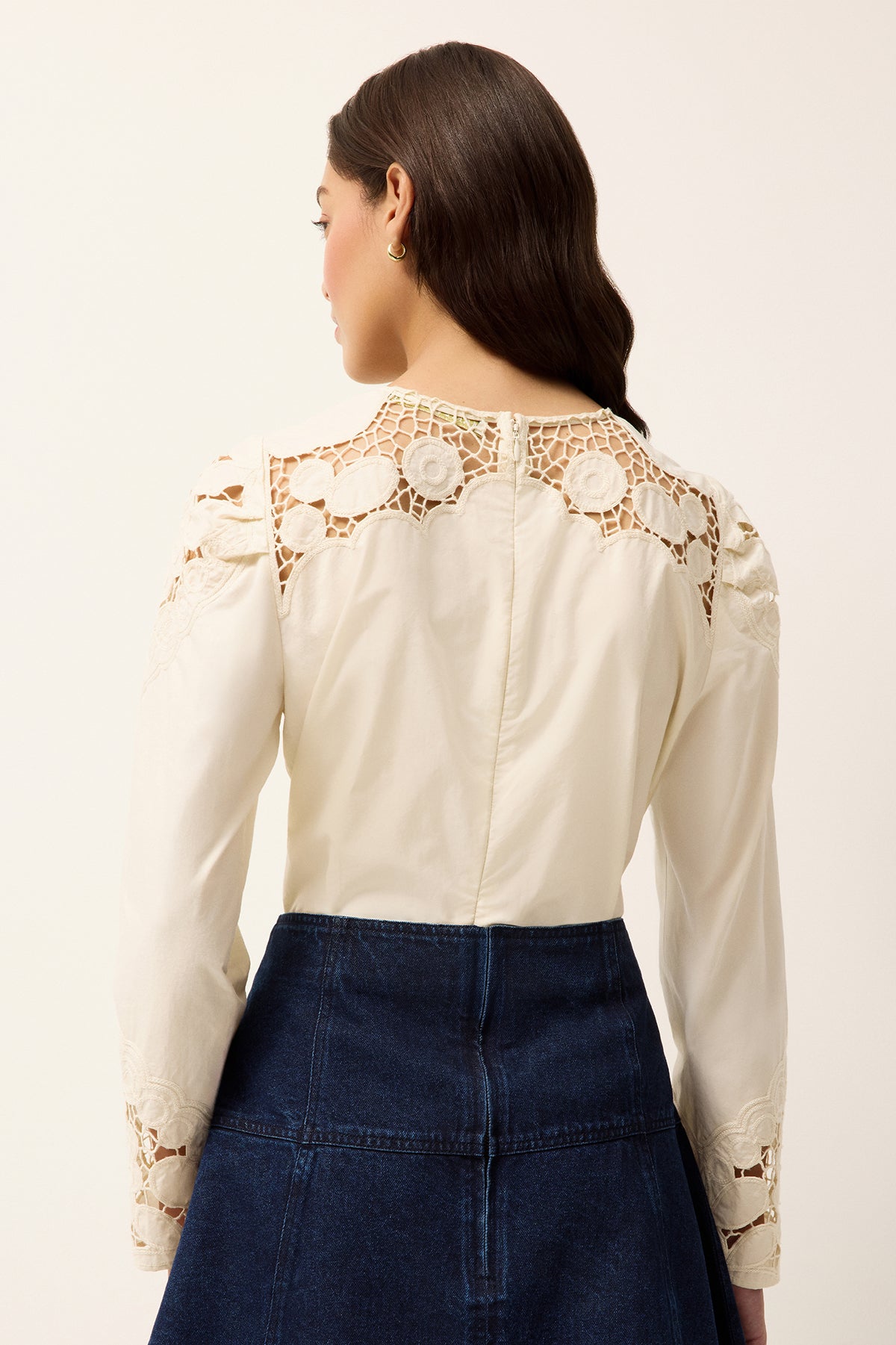 The Dori Top combines effortless elegance with delicate feminine details. This cream-colored piece features intricate lace cutout detailing that frames the collar and sleeve hems, creating a sophisticated silhouette perfect for layering or wearing solo.
