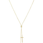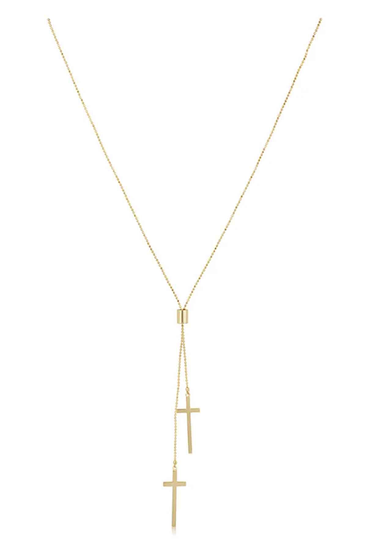 The Double Cross Lariat is a stylish necklace featuring a unique double cross design. It’s perfect for adding a modern, elegant touch to any outfit, whether worn alone or layered.