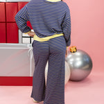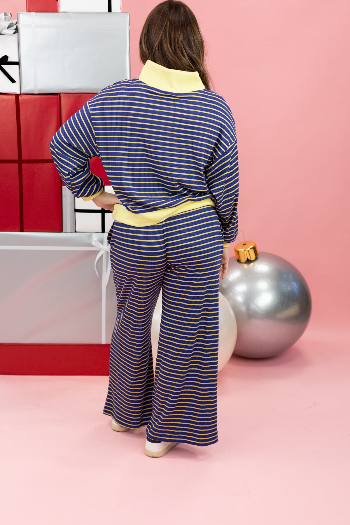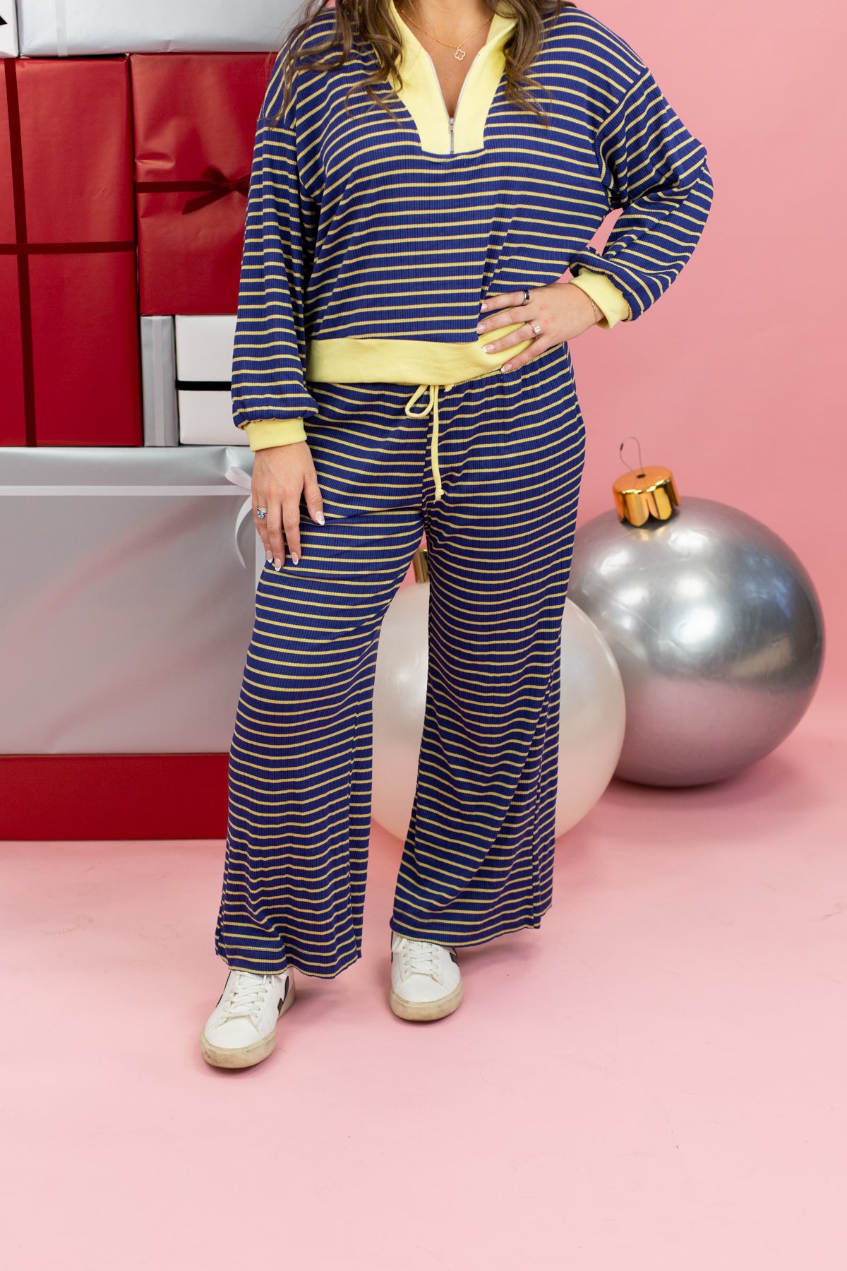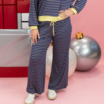 Soft ribbed sweatpants with striped print and an adjustable drawstring waist. Comfortable enough for lounging, stylish enough for everyday wear.