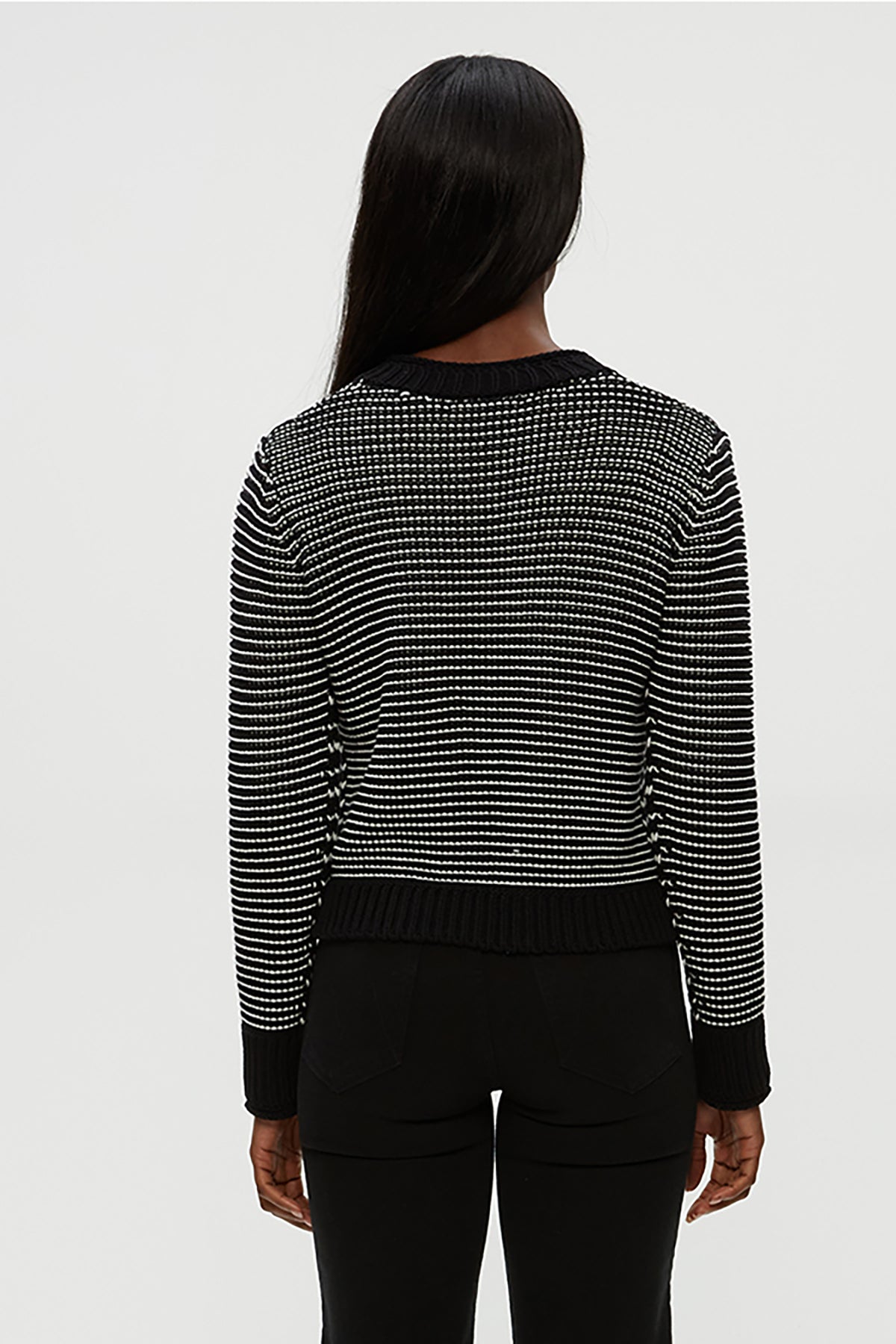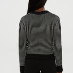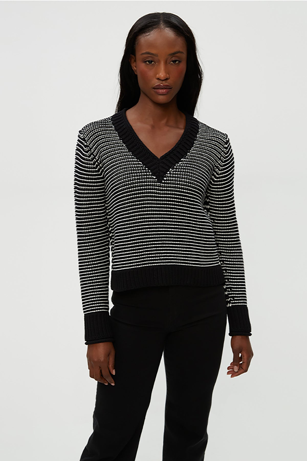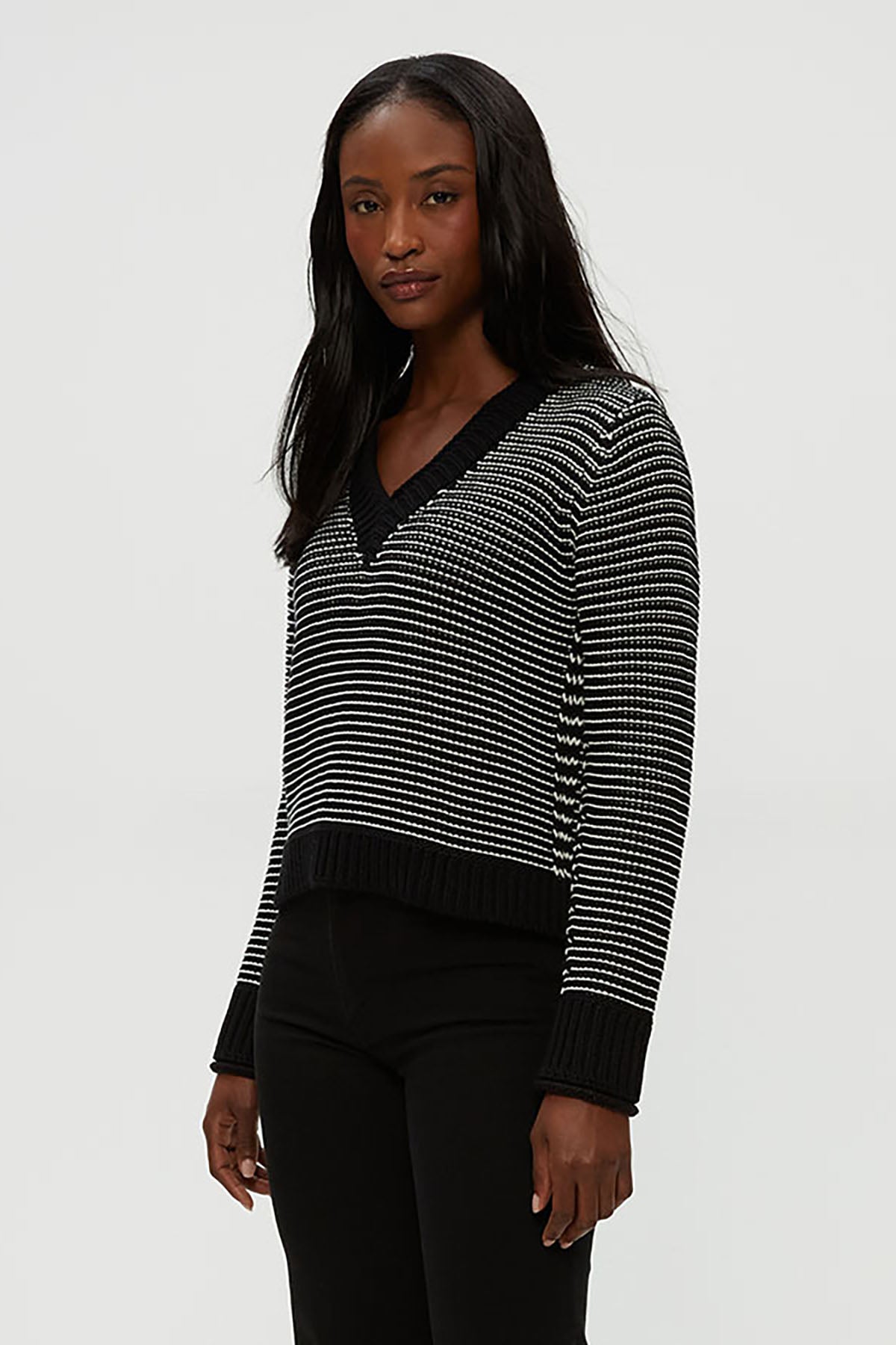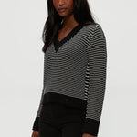 The Linda V Neck Pullover features black and ivory stripes and a flattering V neckline. Made from soft fabric, it's perfect for layering or wearing alone for a stylish, versatile look.