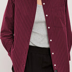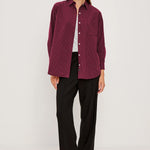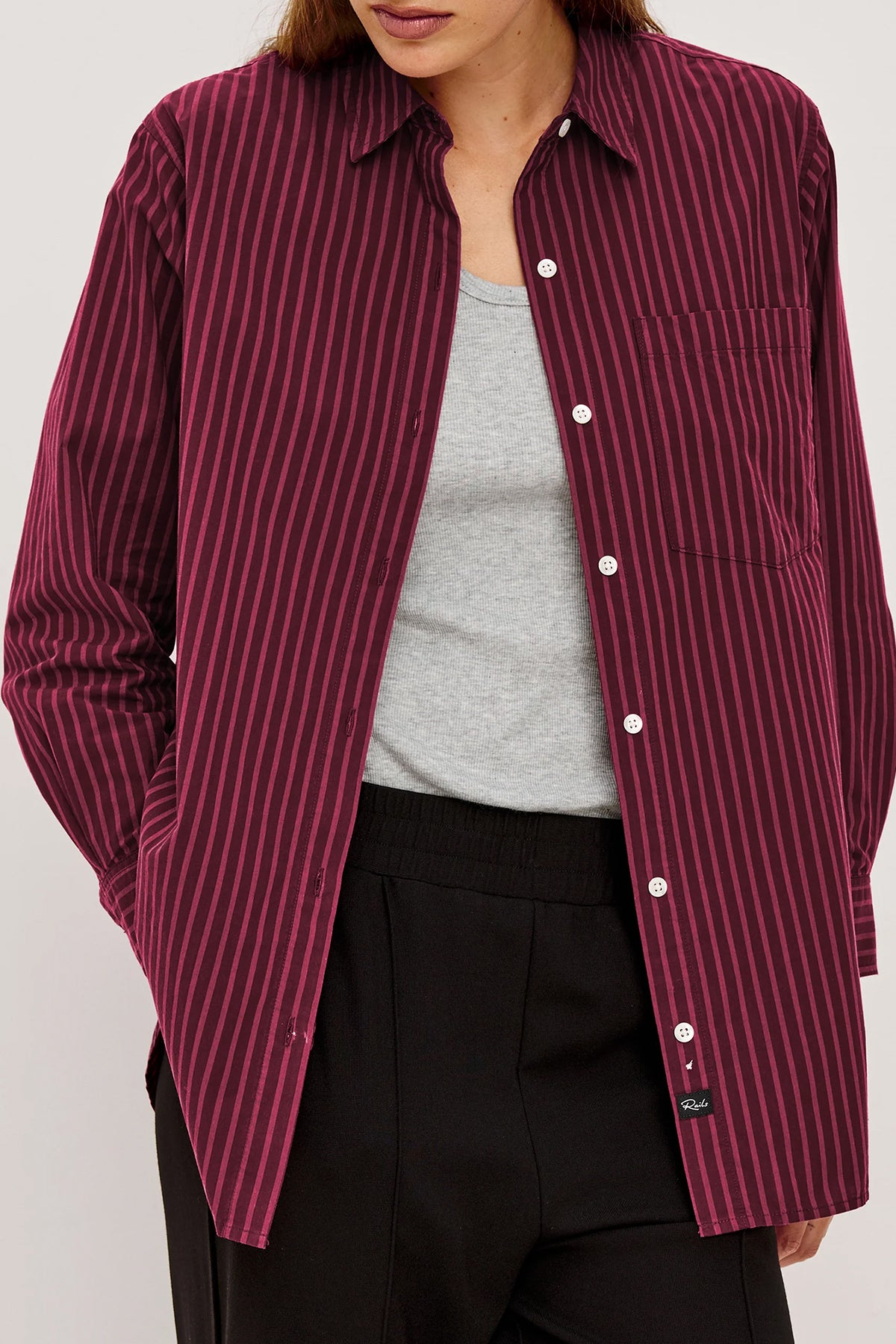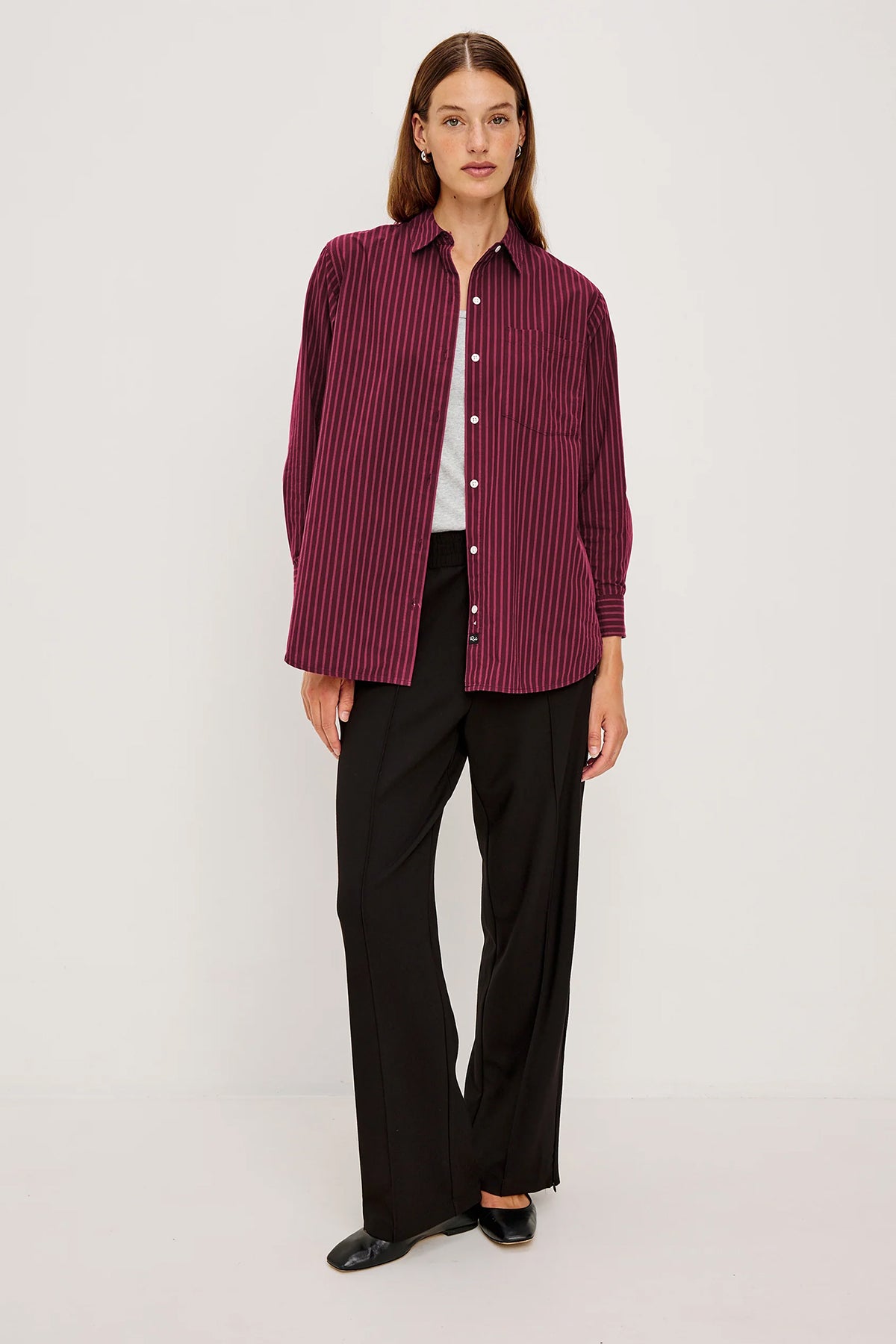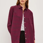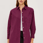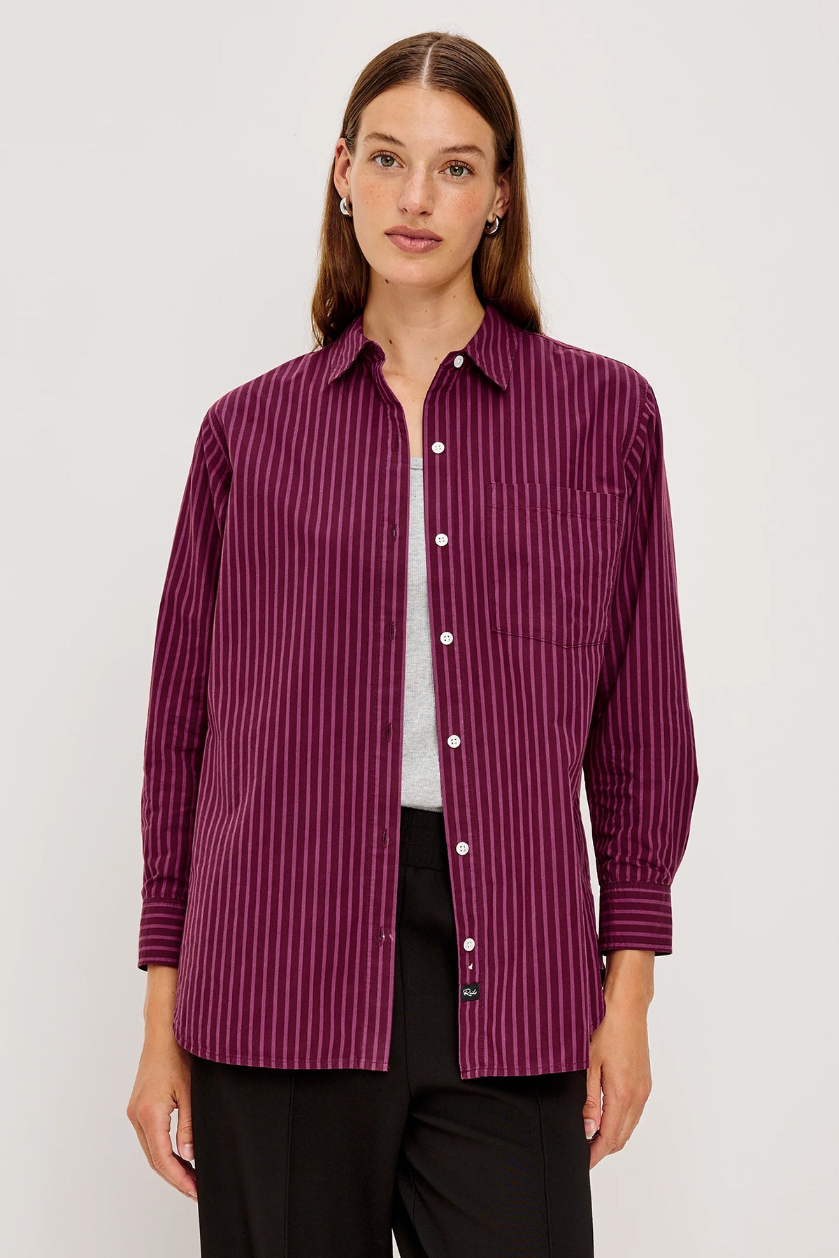 The Elsa Top is a mulberry-striped button-down shirt with a classic fit, perfect for stylish everyday wear.