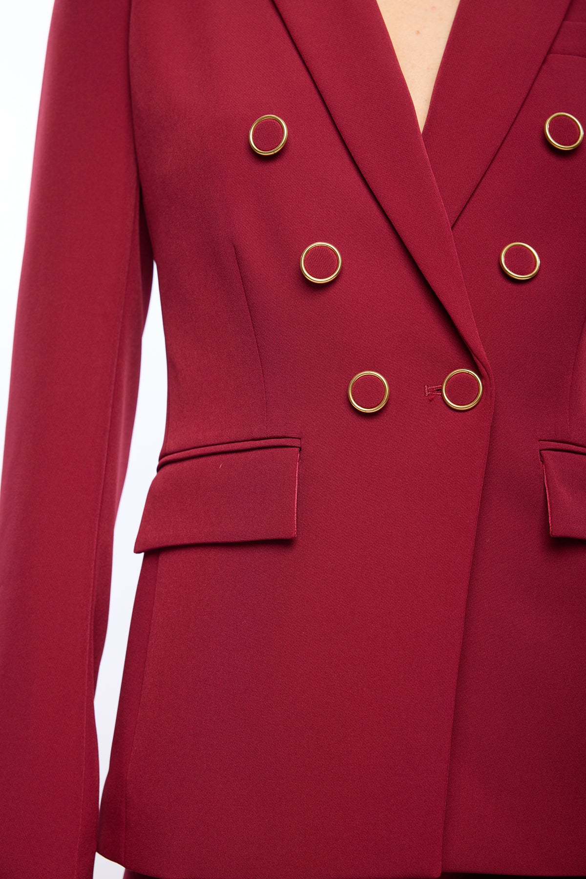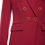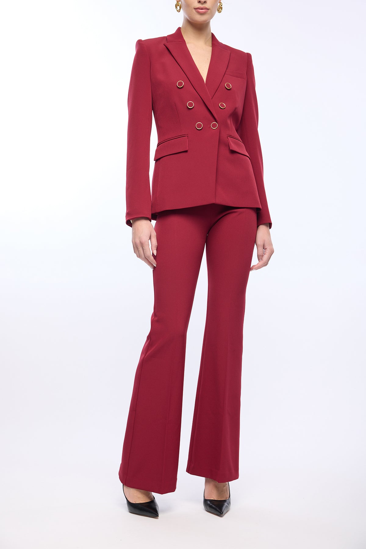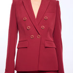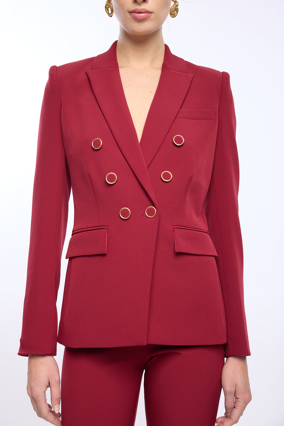 The Emilio Crepe Blazer brings refined sophistication to your wardrobe with its striking crimson red crepe fabric and gleaming gold-accented buttons. This elevated piece transcends seasonal trends, offering timeless elegance that transitions effortlessly from boardroom to evening occasions. The structured silhouette and luxurious crepe create a polished foundation for countless styling possibilities, whether layered over silk camisoles or paired with tailored trousers!