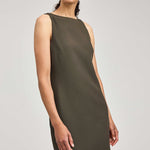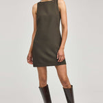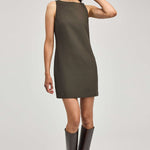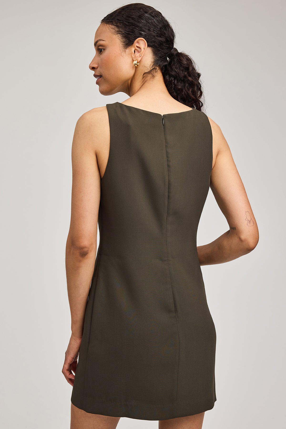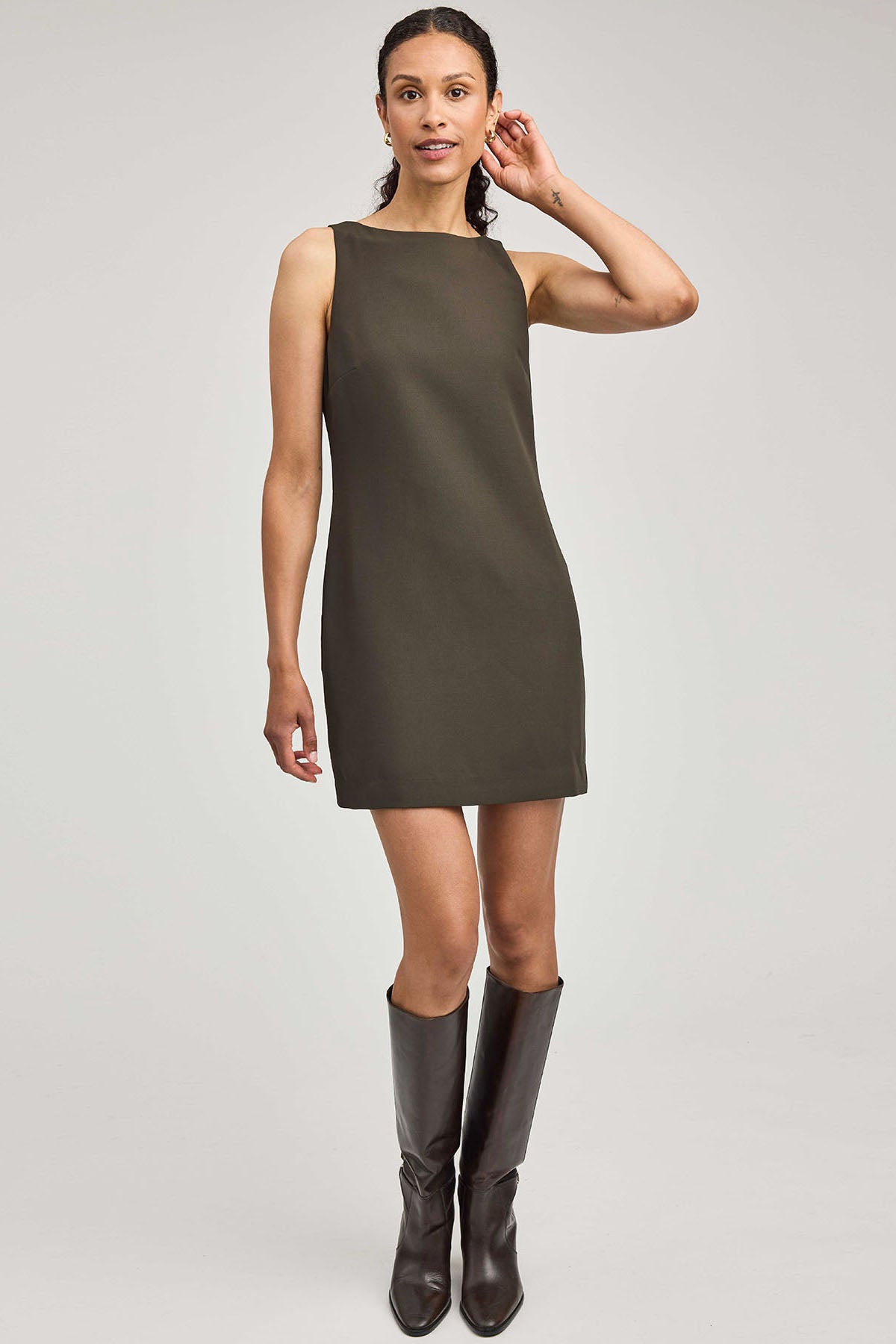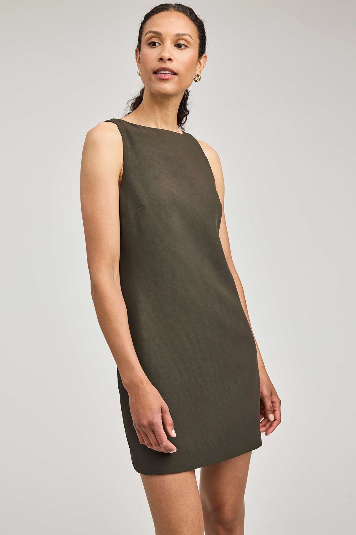The Etta sleeveless mini shift dress in olive is a simple, stylish choice. Its clean design and flattering fit make it perfect for warm weather or layering, with a classic olive color that suits many occasions.