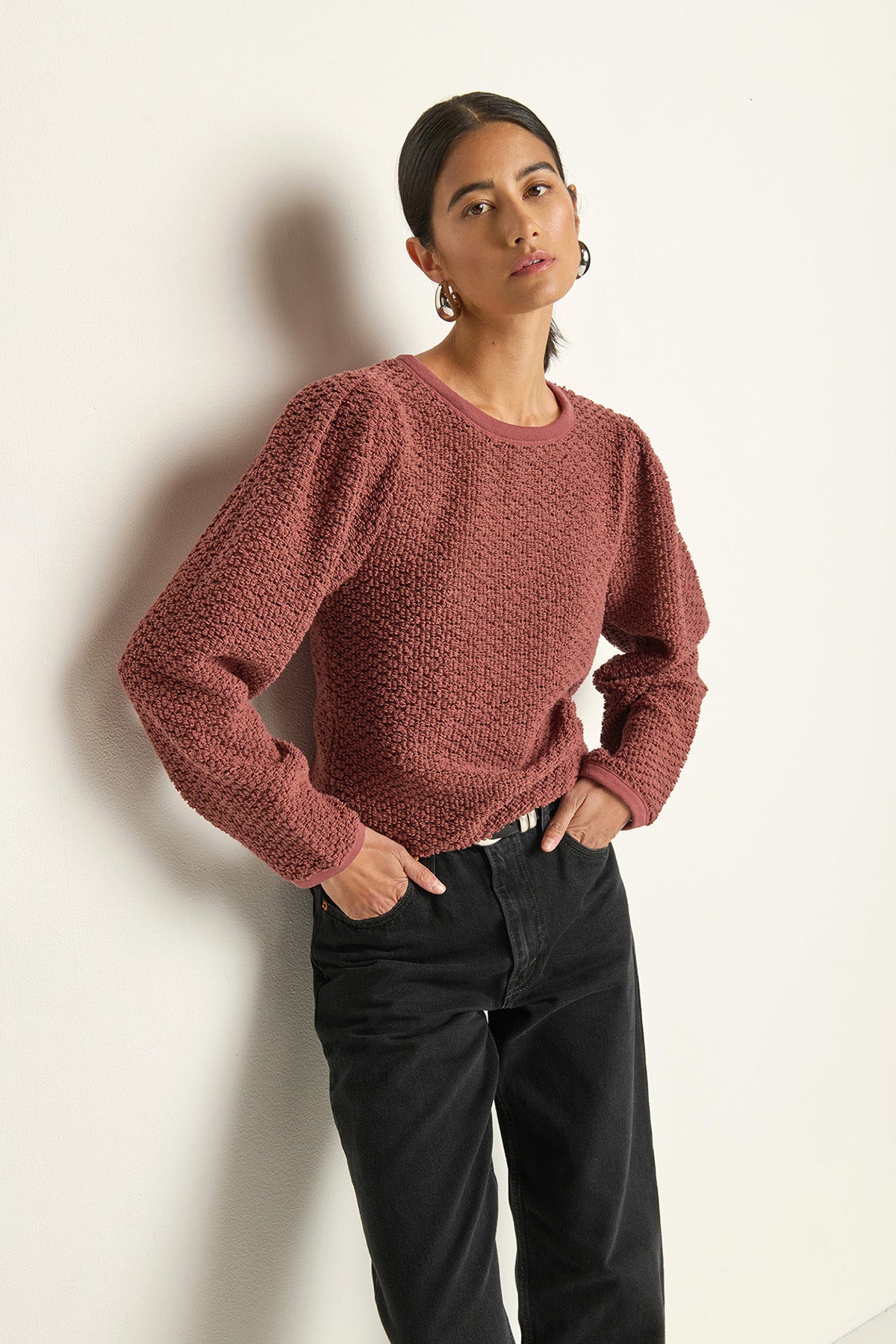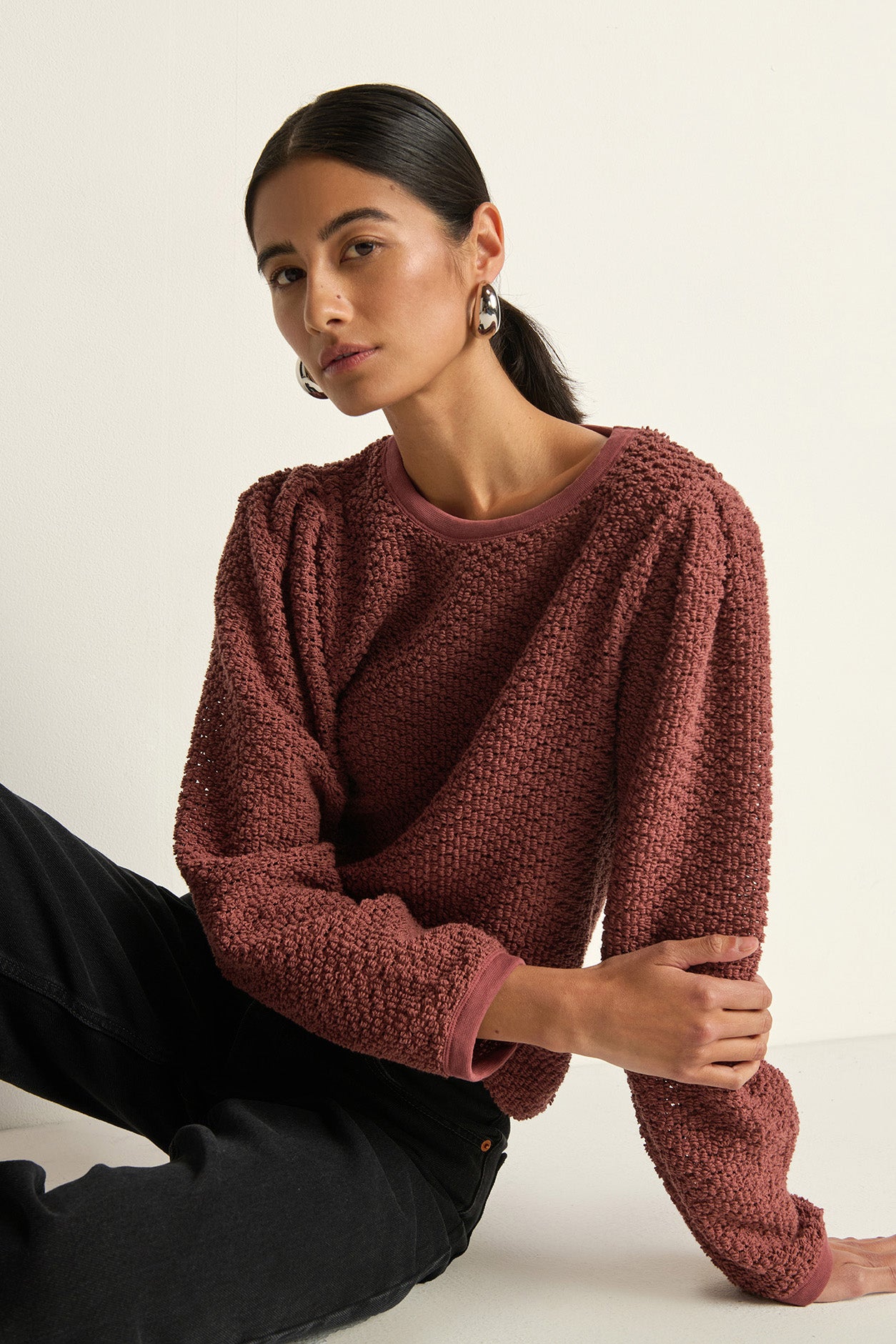 A textured crewneck sweater in stallion with delicate lace detailing. Versatile enough to layer or wear alone, this piece pairs seamlessly with your existing wardrobe and works from day to evening.