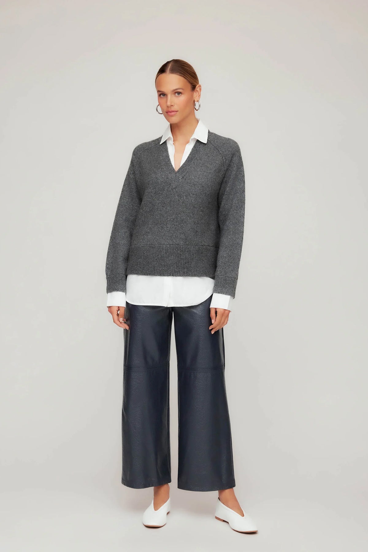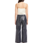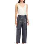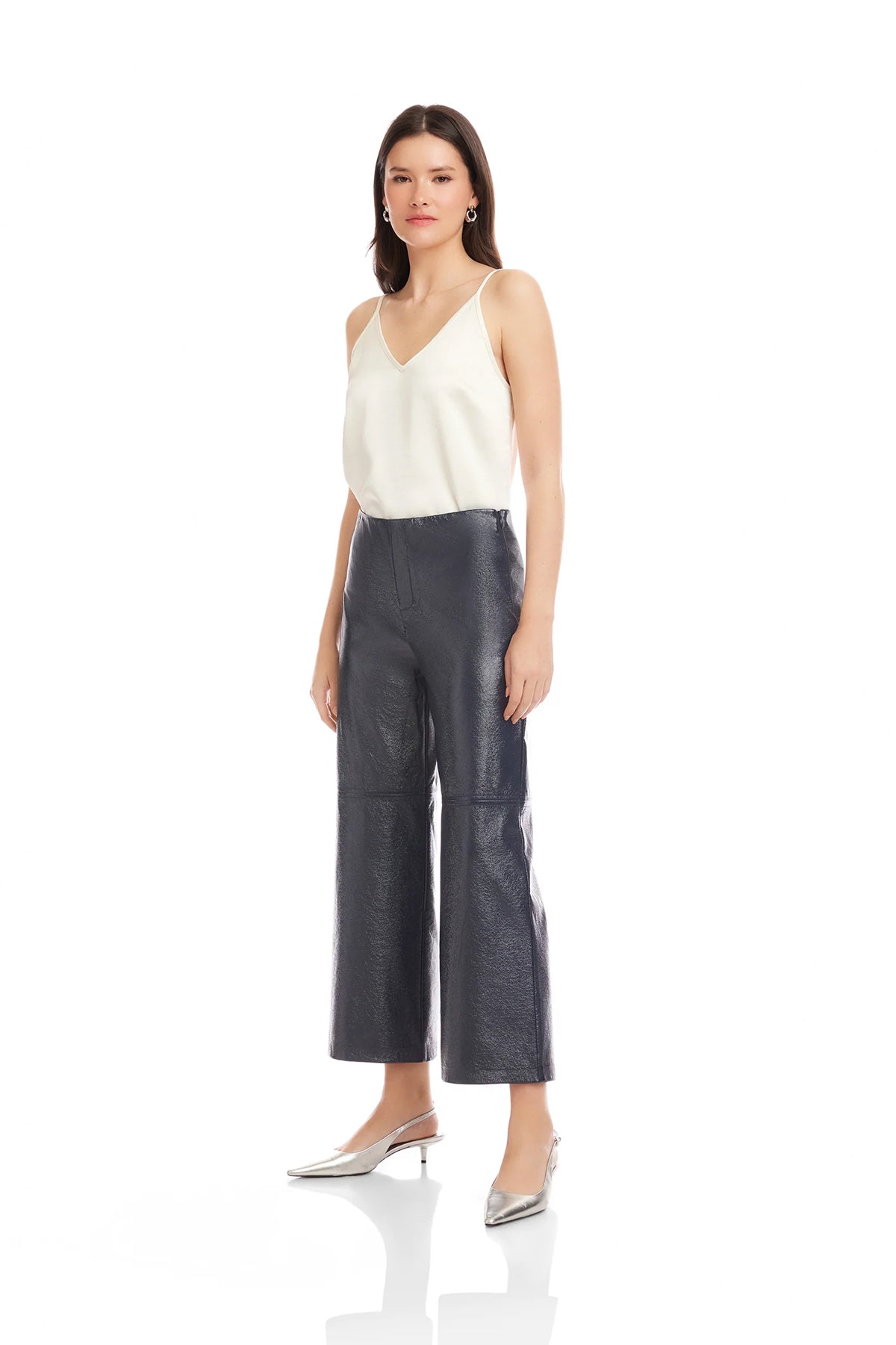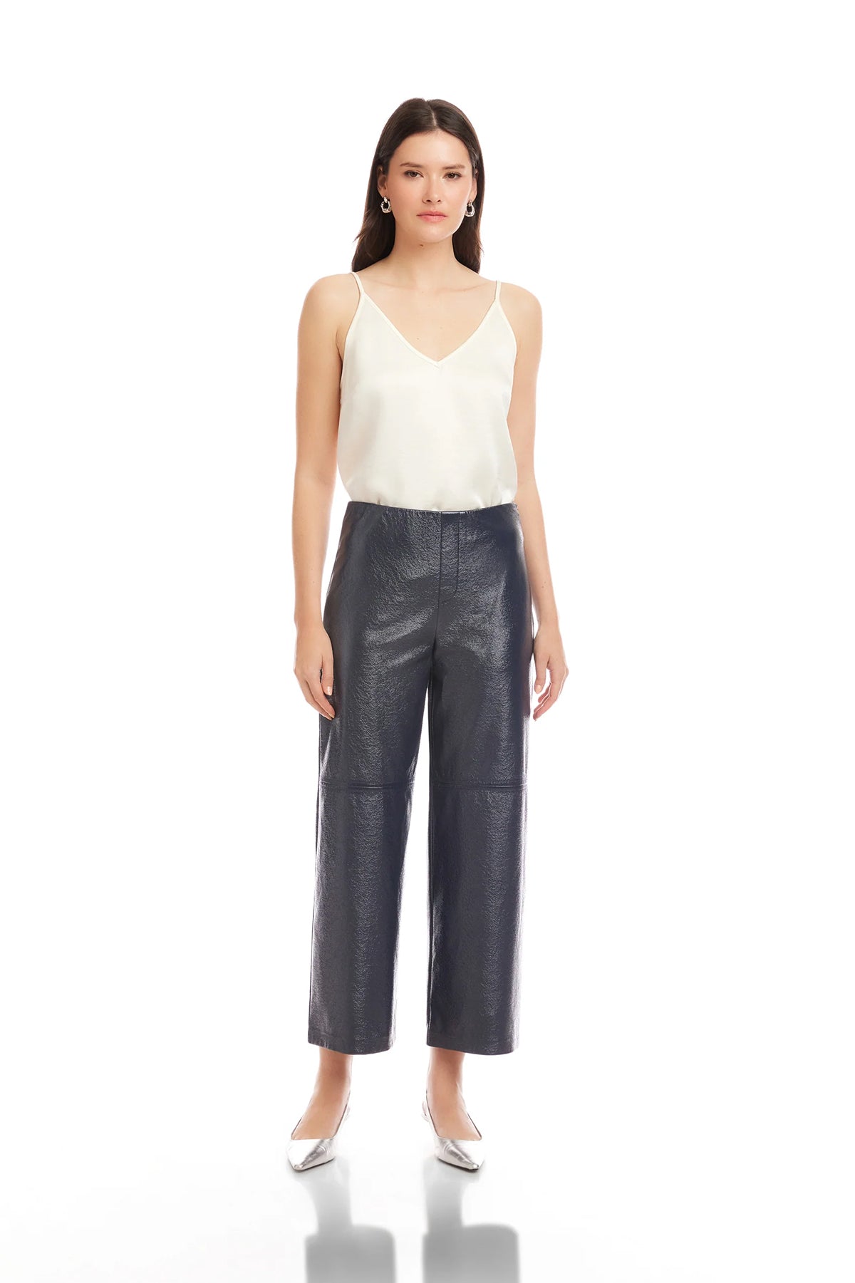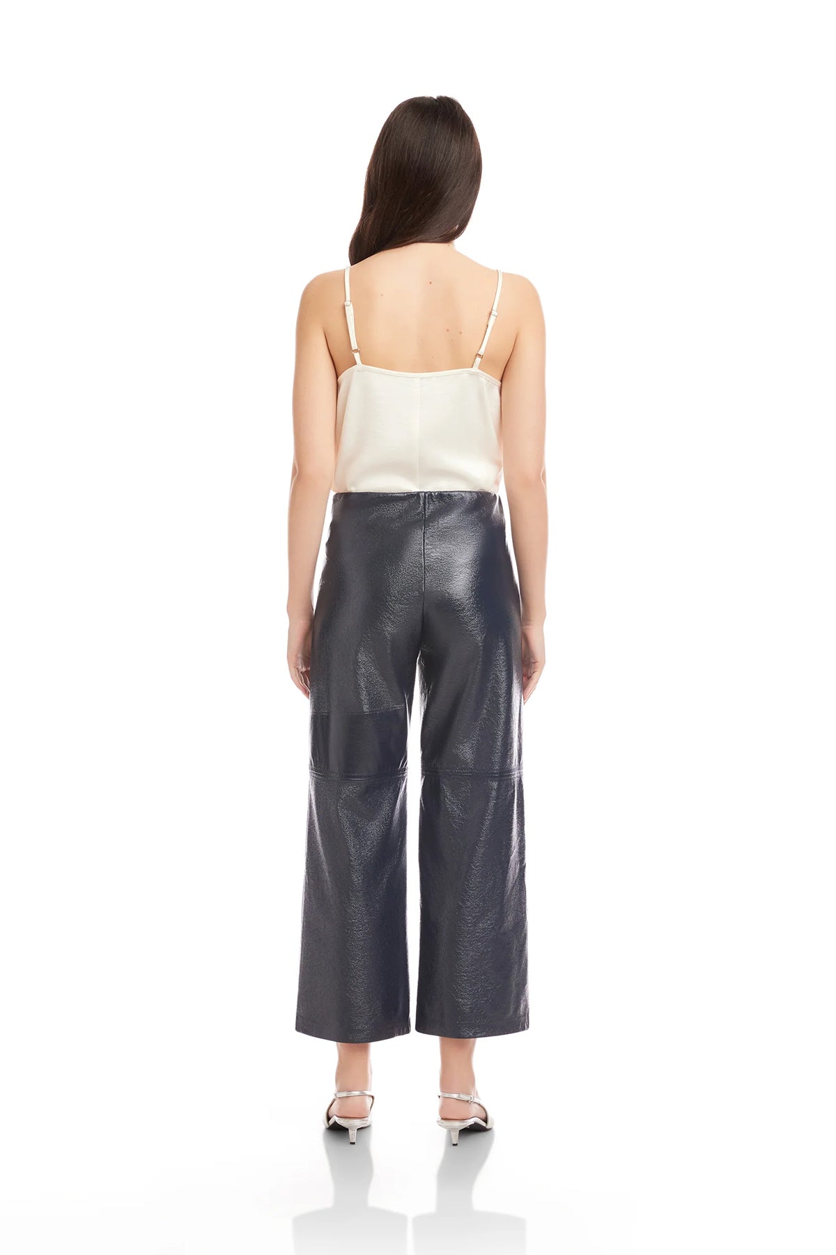 - Straight-leg cropped silhouette in structured faux patent leather with a side zip closure.