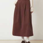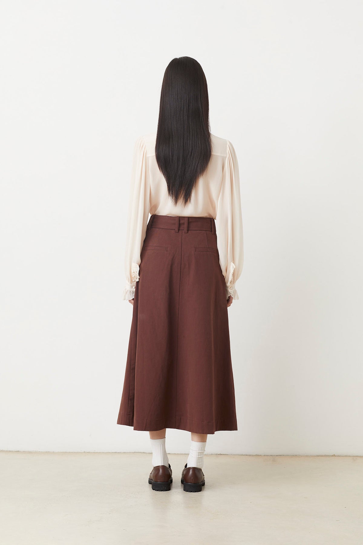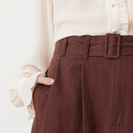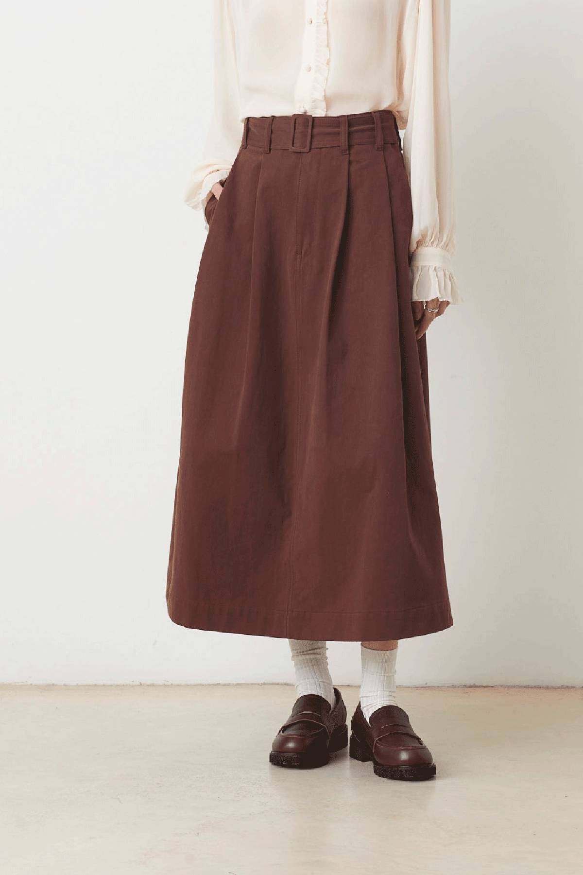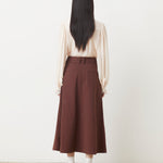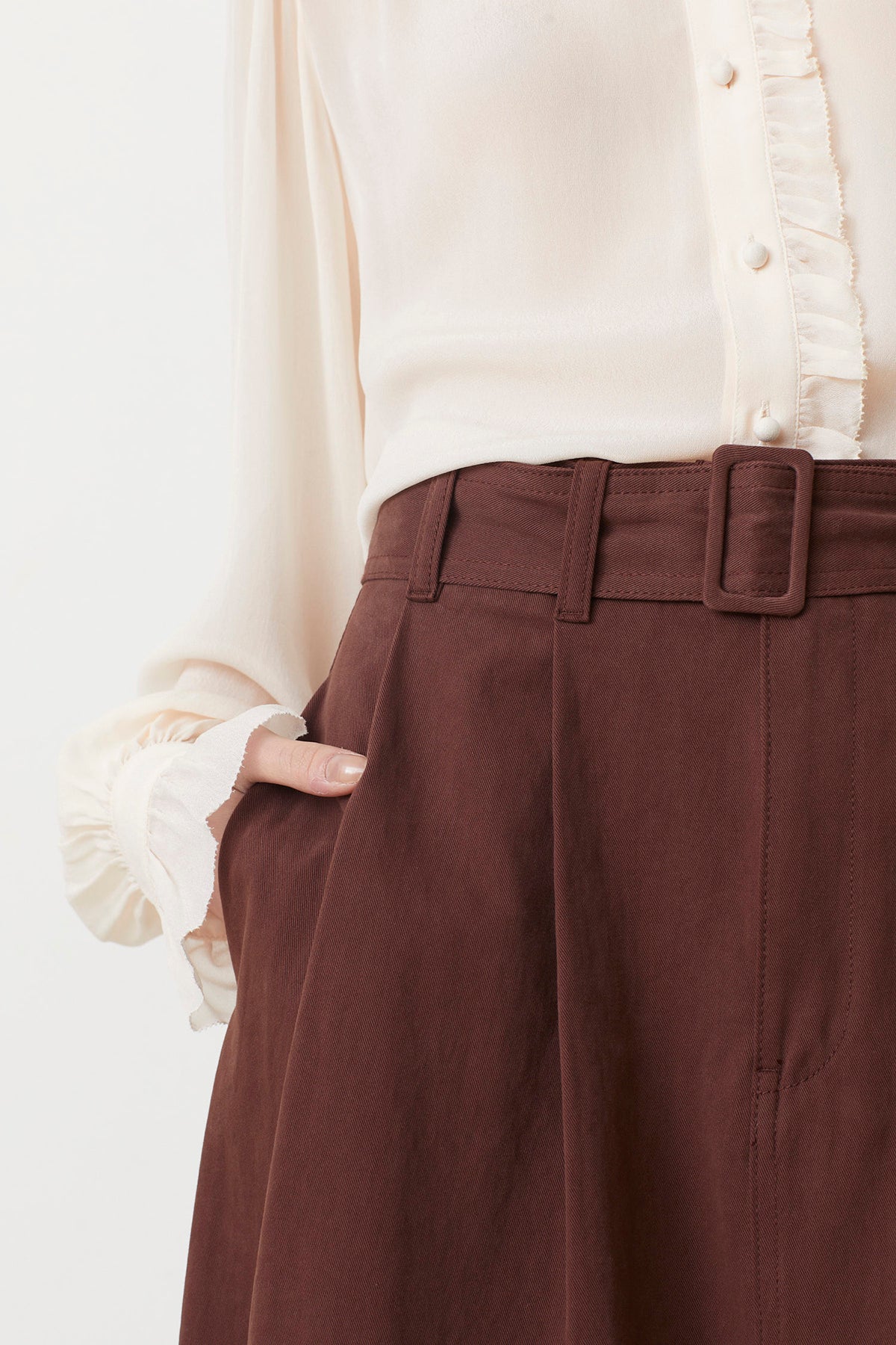 The Filly skirt is a prune-colored midi with a matching belt, combining elegant color and flattering fit for a polished, fashion-forward look.