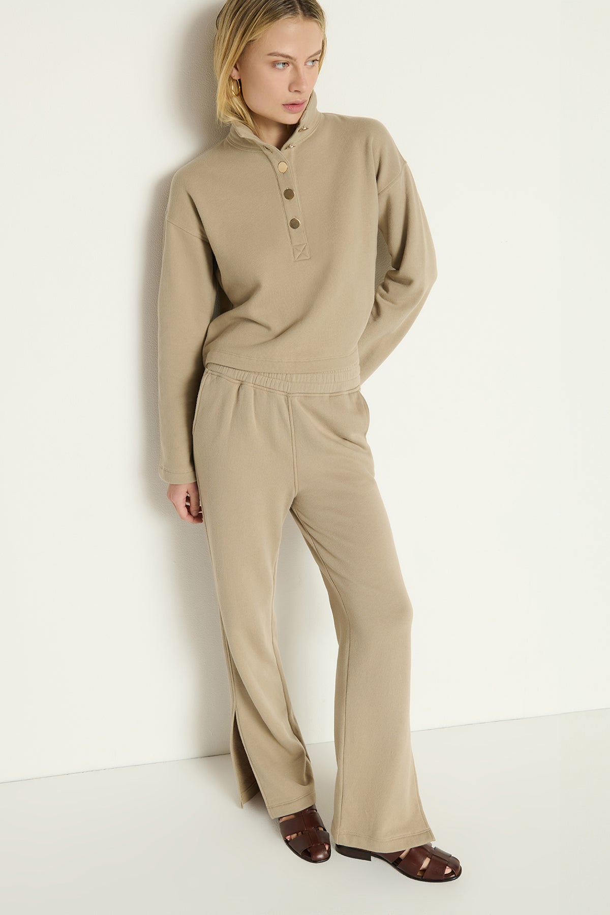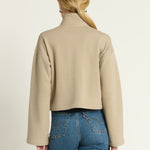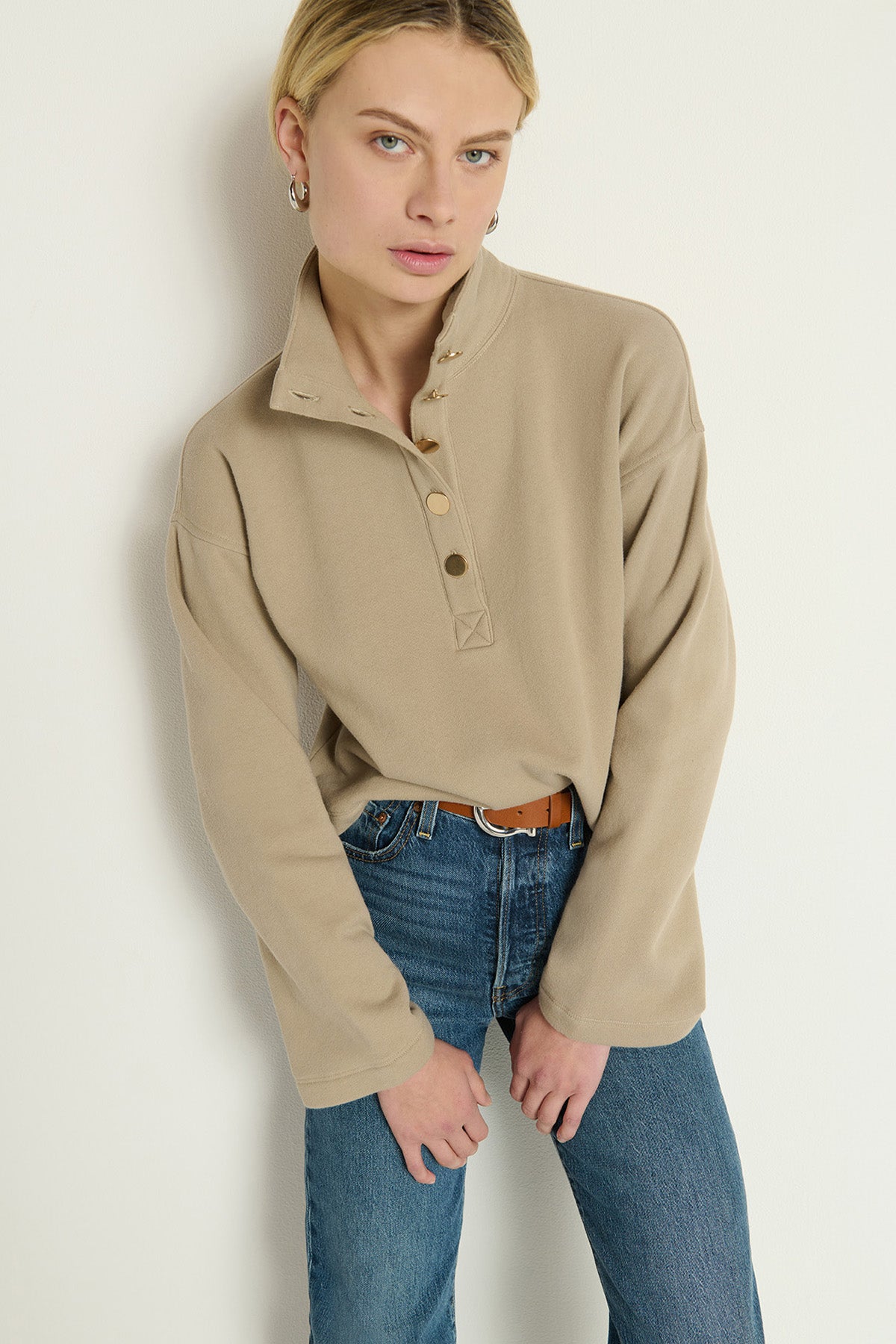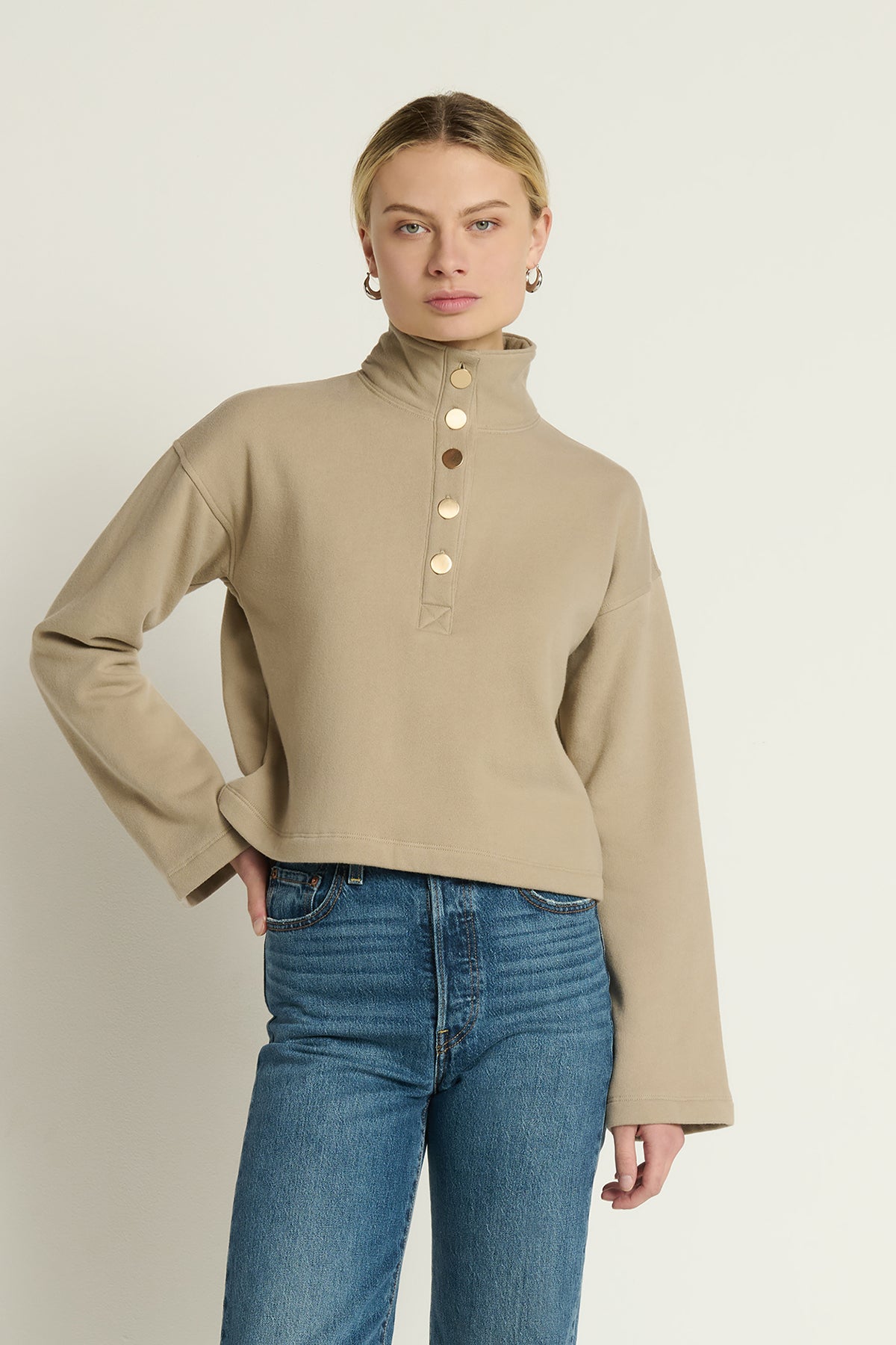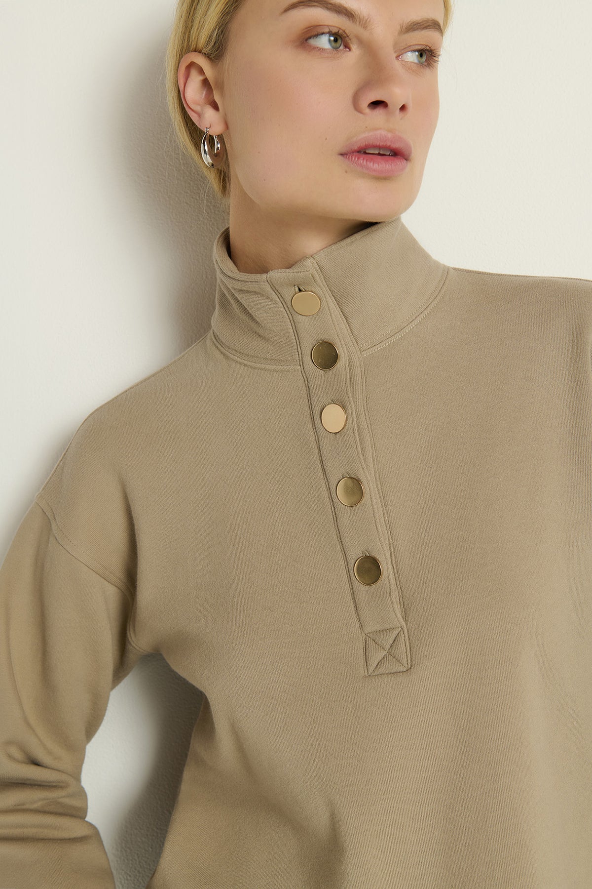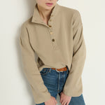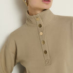 The Franz Sweatshirt features a cozy funnel neck accented with elegant gold button details. This pullover combines comfort and sophistication, making it a stylish choice for cooler days.