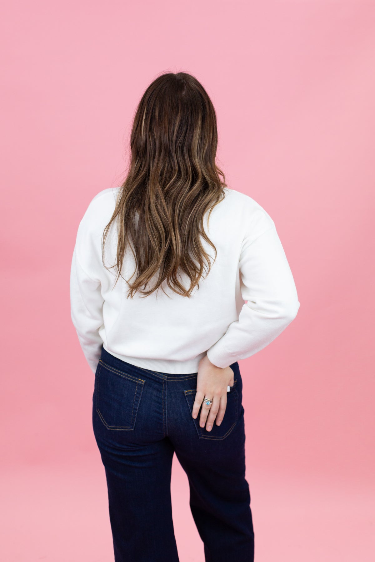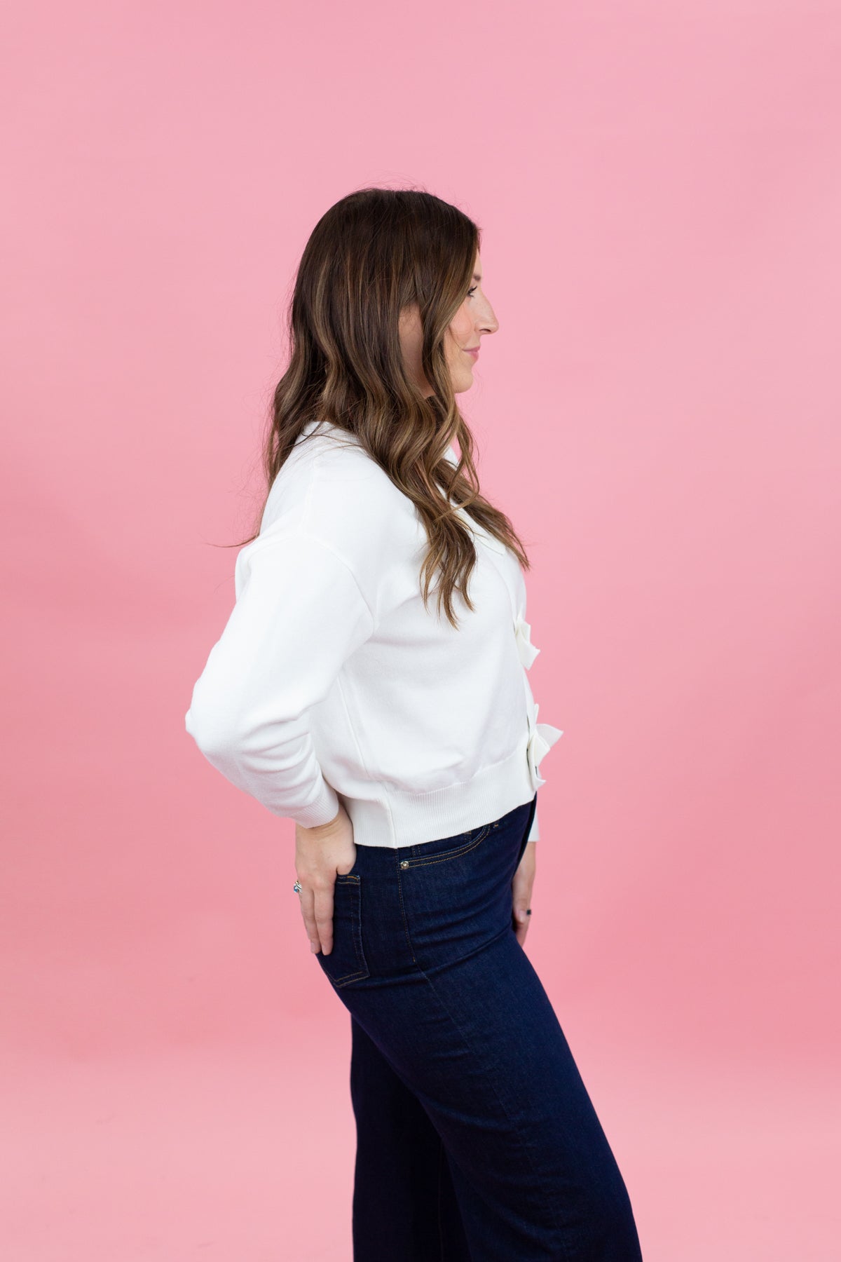 Featuring delicate ribbon detailing along the front placket, this piece combines timeless elegance with modern charm. The soft, neutral ivory tone pairs effortlessly with any outfit, making it a versatile layering essential. Perfect for adding a polished touch to casual looks or dressing up your favorite ensemble.