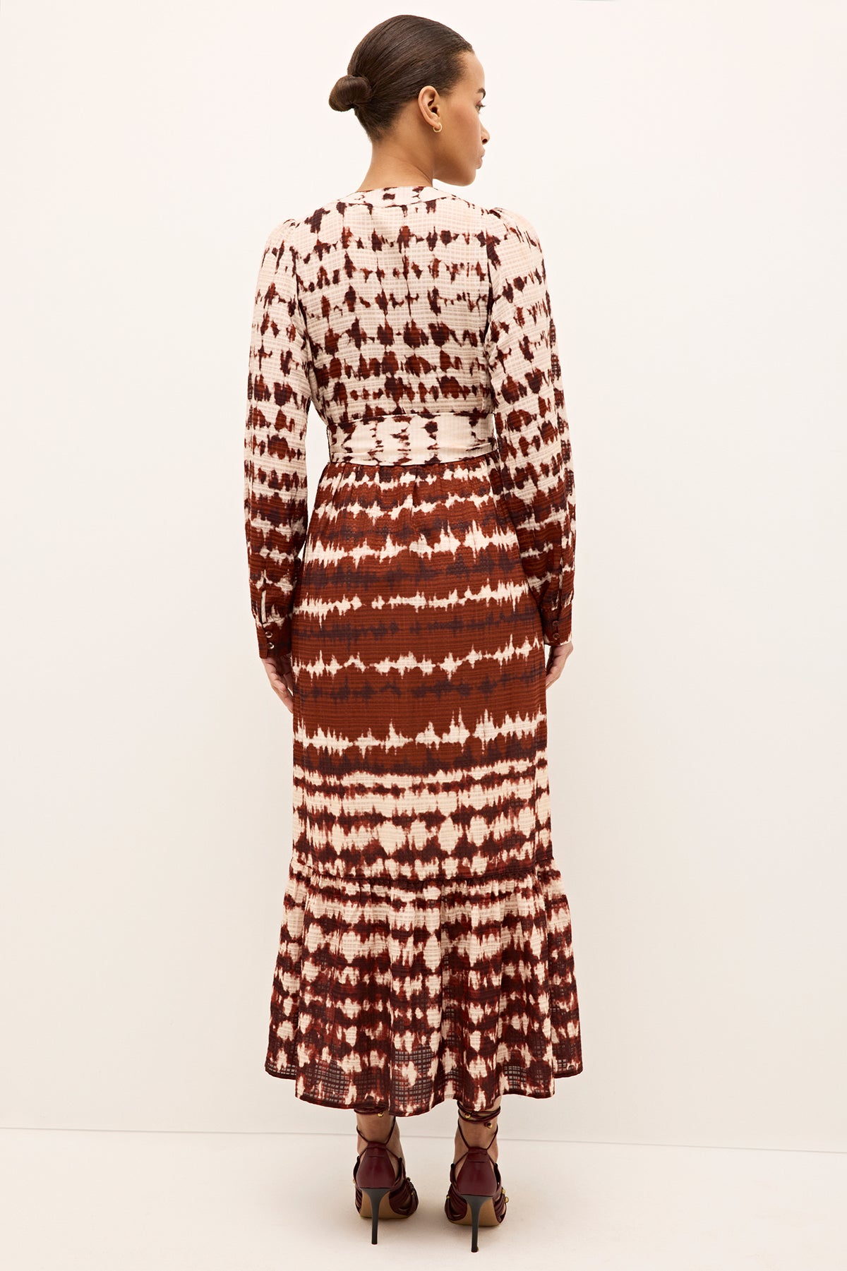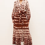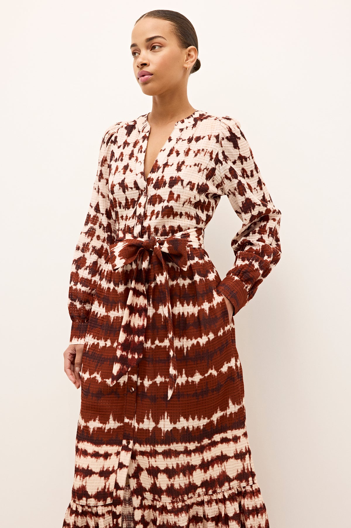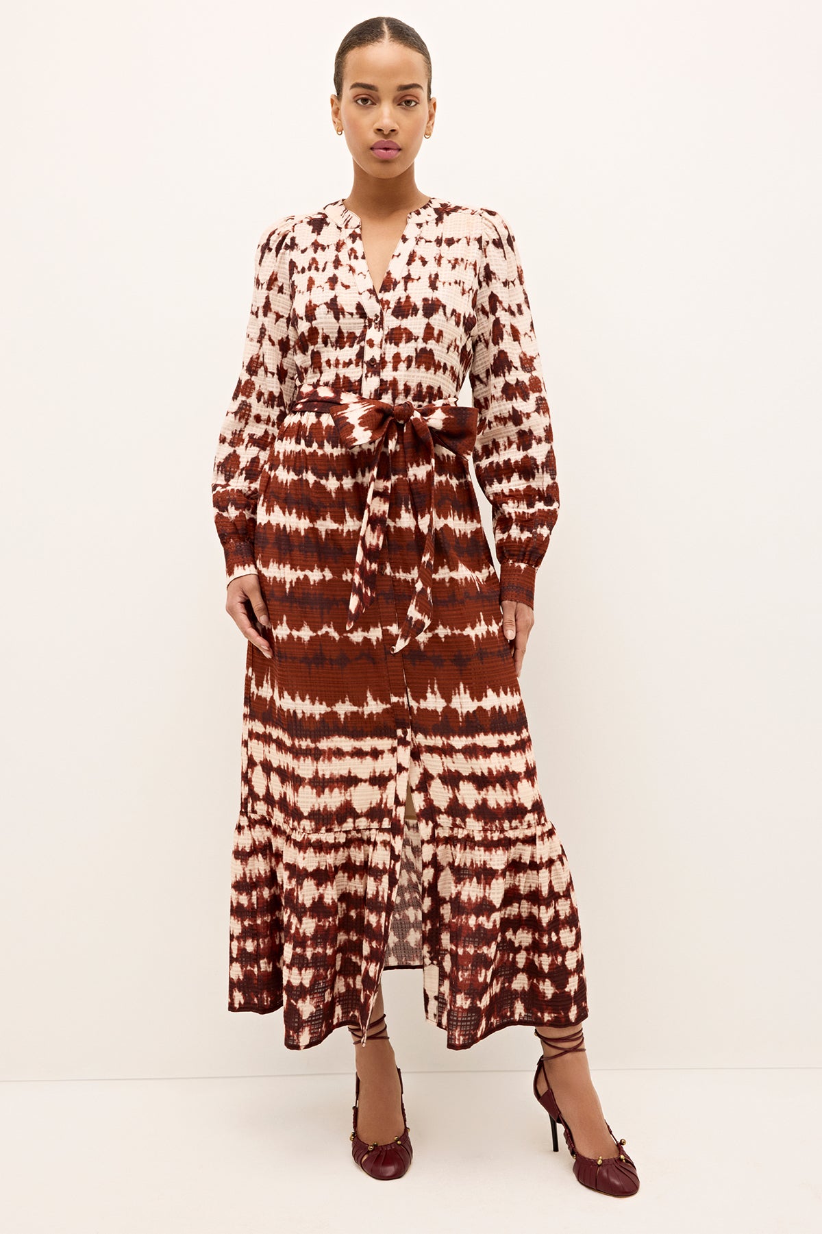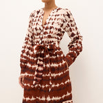 The Hannon Dress features long sleeves and a flattering midi length with a colorful tie-dye print. Its adjustable waist tie belt lets you customize the fit for easy comfort and style, making it perfect for any occasion.