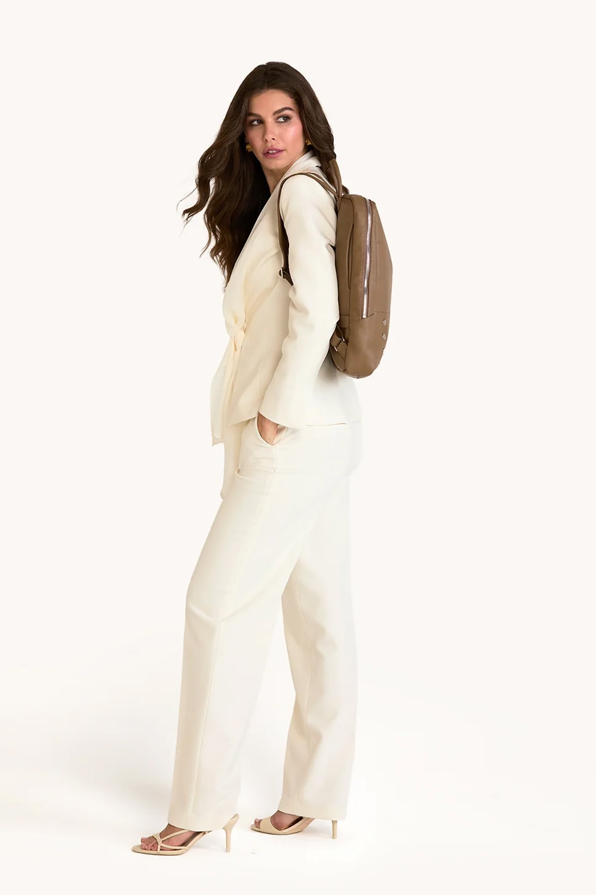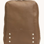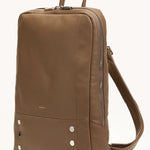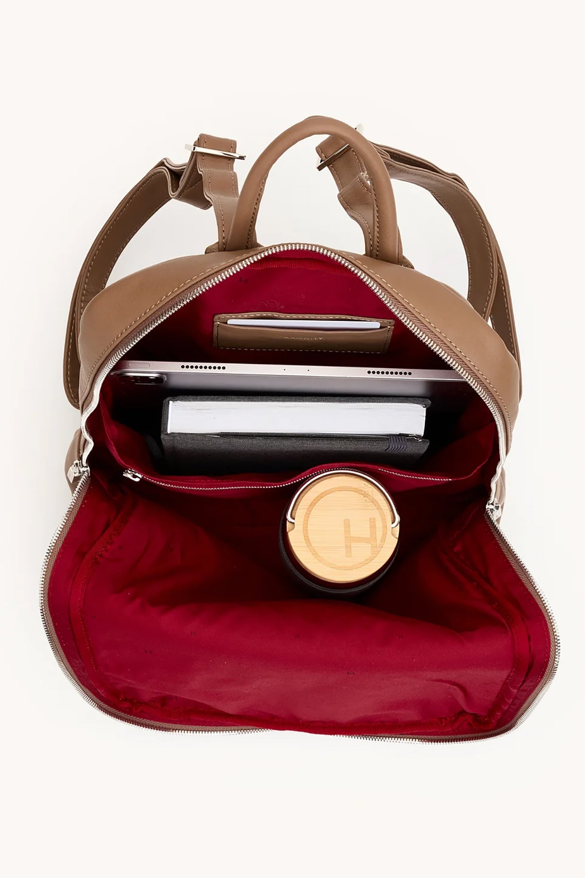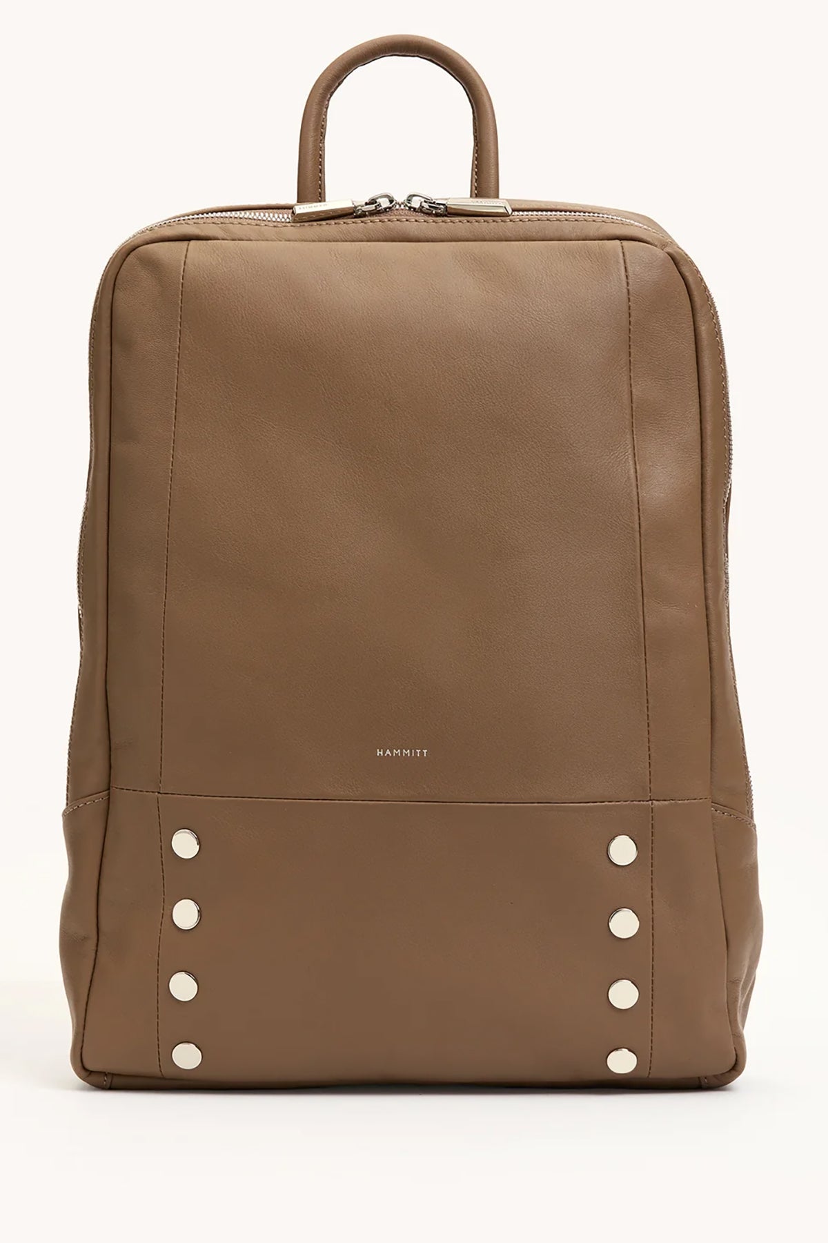 The Hunter Backpack features smooth brown leather with silver hardware and a red logo lining. It’s built for style and long-lasting use.