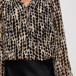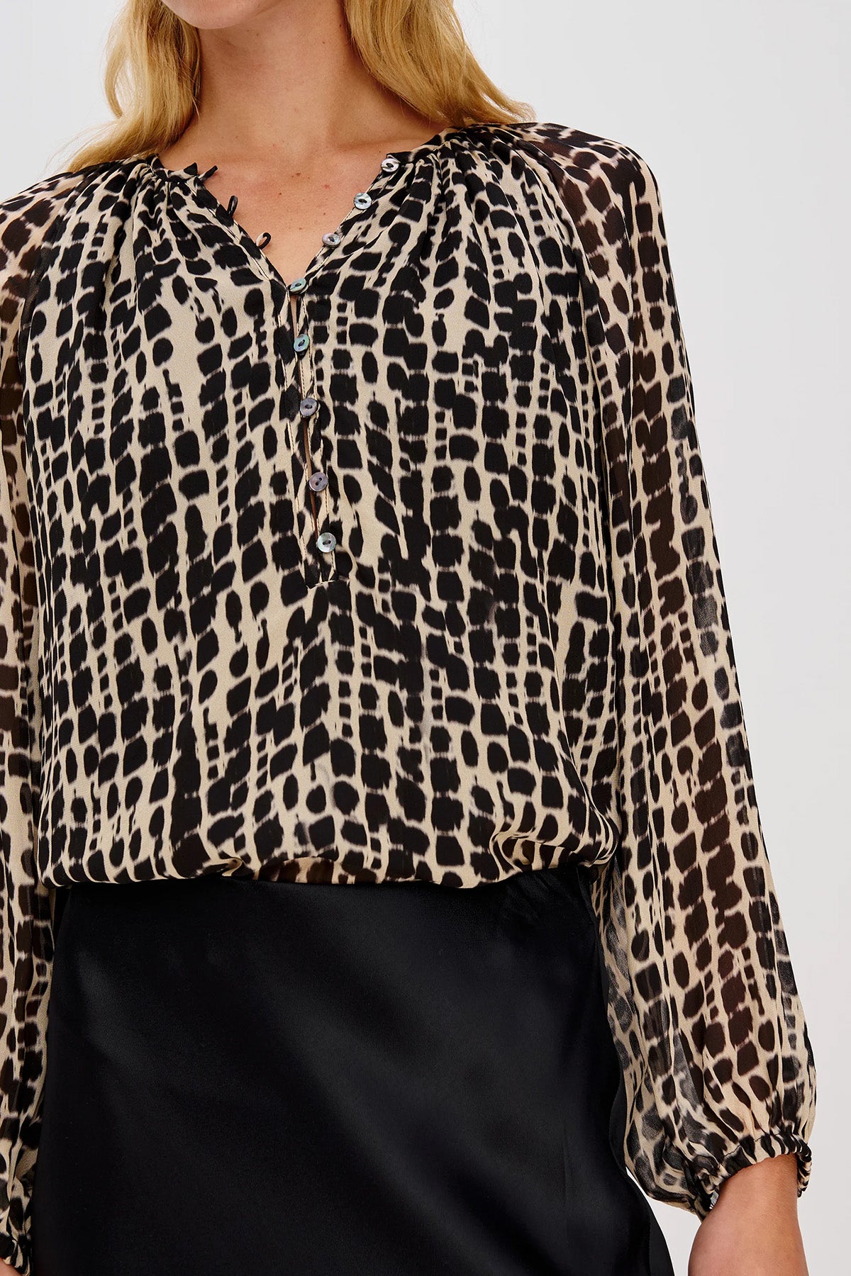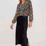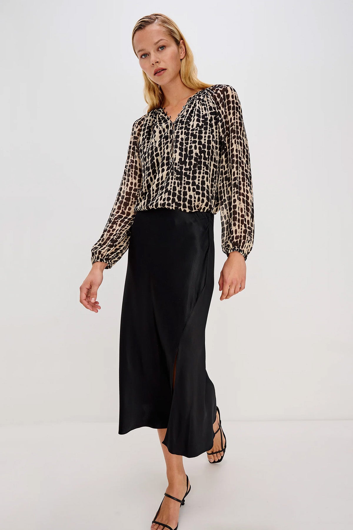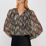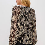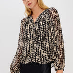 The Indi Top is a light, flowy blouse with a printed long sleeve design. It offers comfort and style, perfect for everyday wear or dressy occasions.