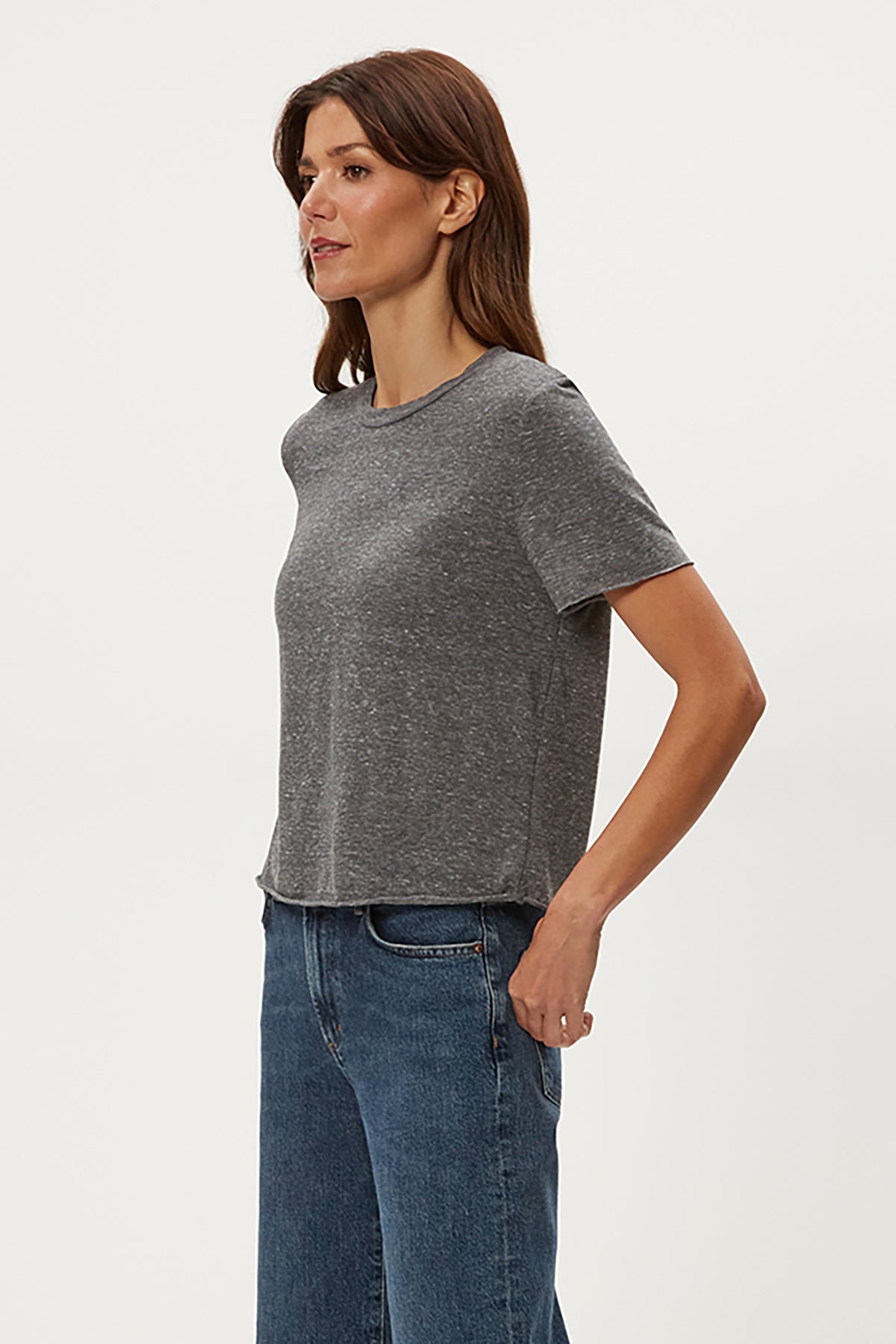 A relaxed crew neck tee with raw edge detailing for an effortlessly cool look. Versatile enough to pair with anything in your closet, the Jackie is the everyday essential that works hard in any outfit.