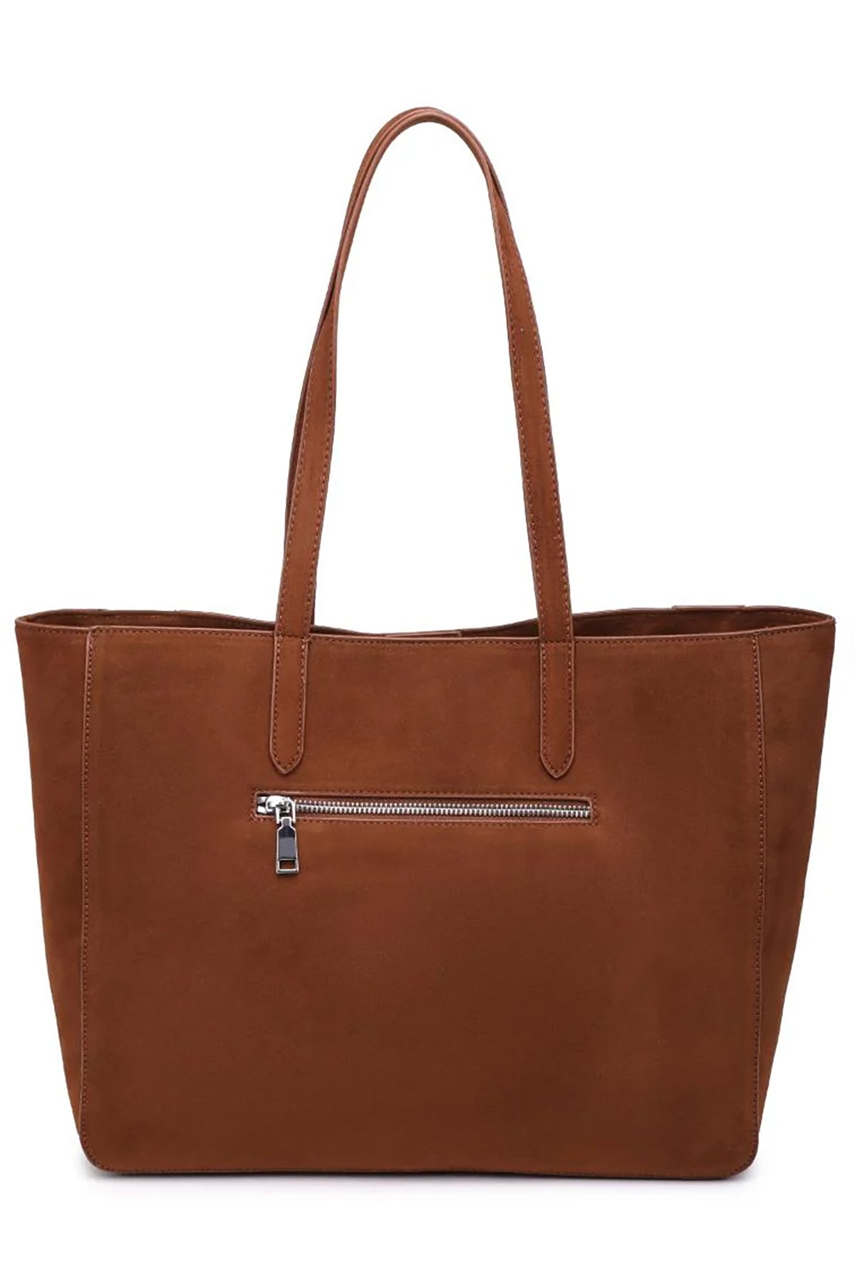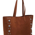 The Karli Tote features soft suede with silver studs for a stylish, modern look. It’s roomy enough for your essentials and perfect for daily wear.