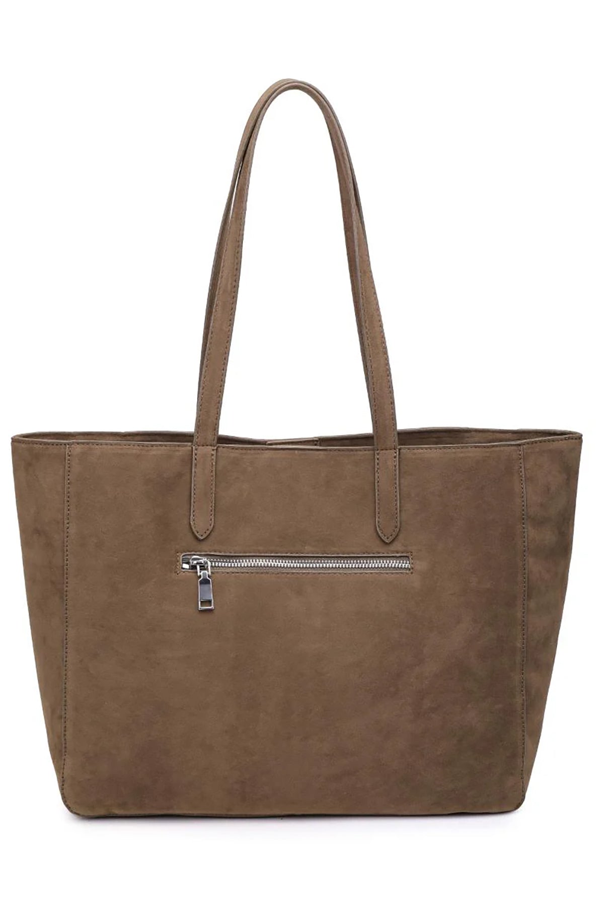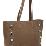 The Karli Tote features soft suede with silver studs for a stylish, modern look. It’s roomy enough for your essentials and perfect for daily wear.