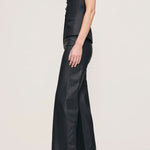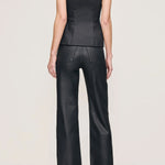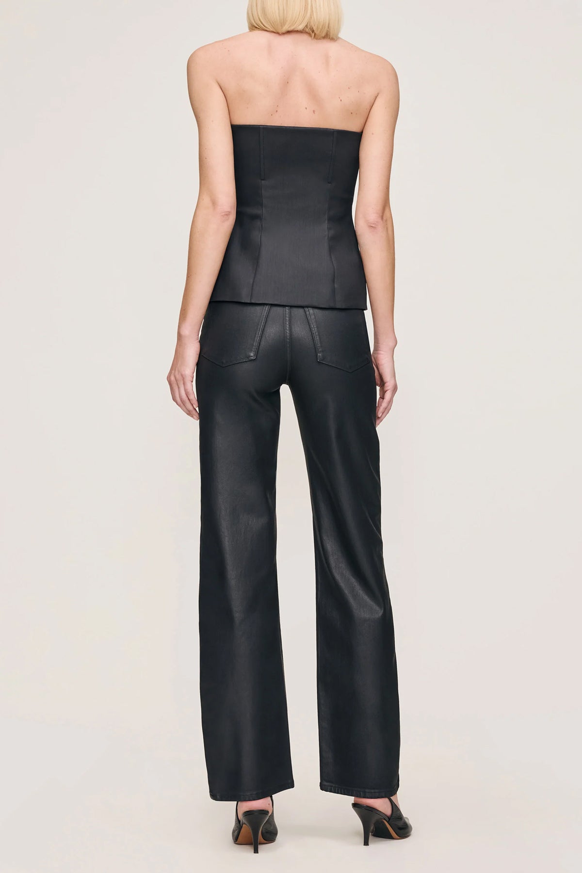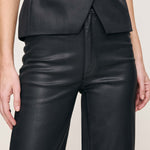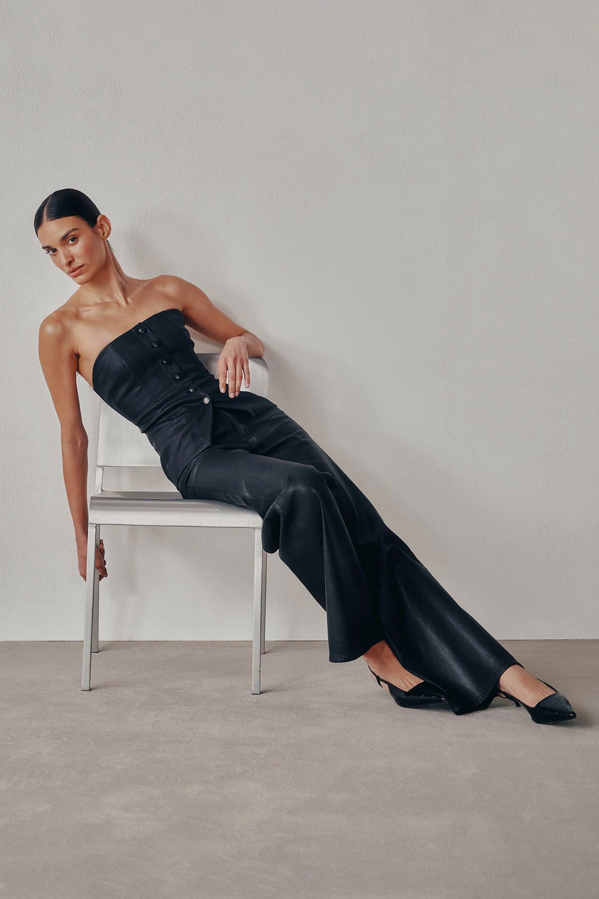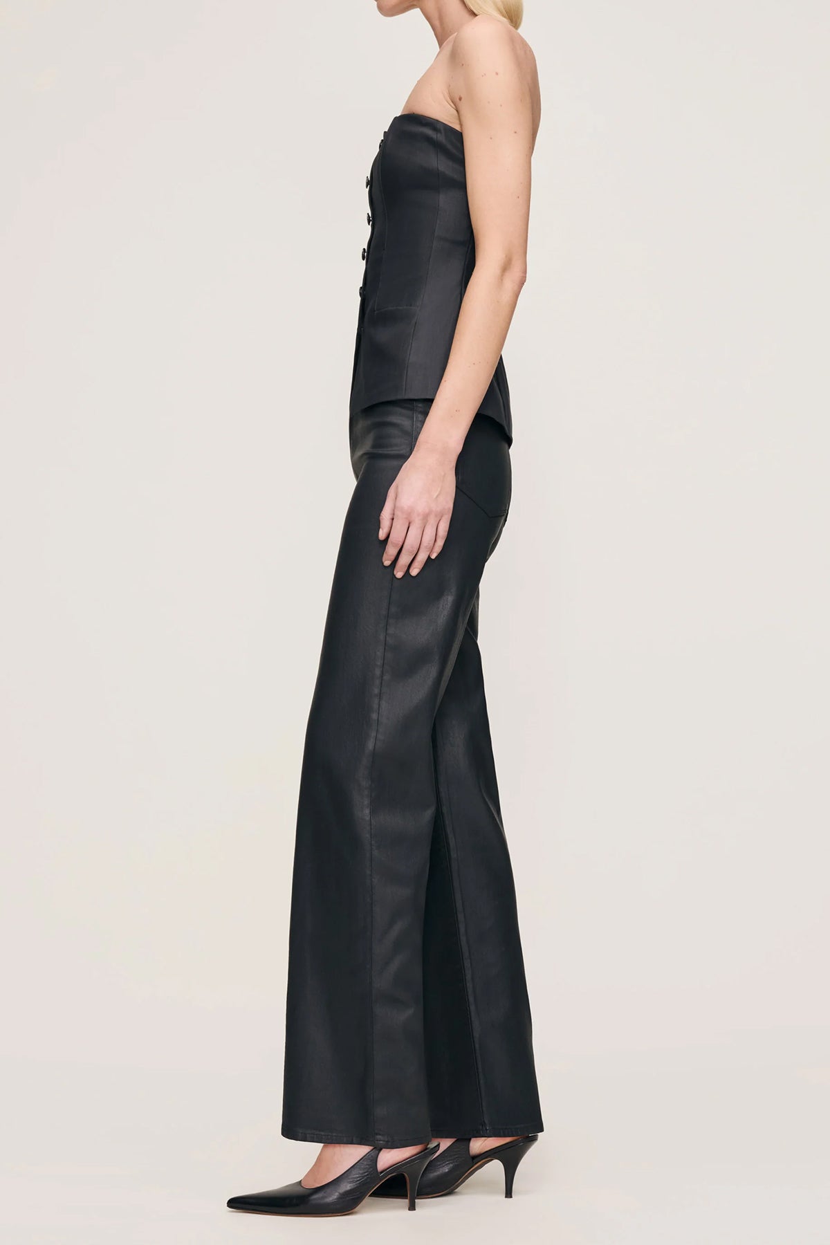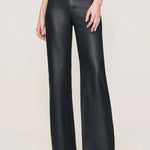 Meet Karmine, our refined wide-leg silhouette with a commanding high rise and 31" inseam that delivers effortless polish. Rendered in Black Coated—a luxurious wax-treated denim with a leather-like finish—it's appointed with black oxide hardware, coordinating tonal stitching, a pristine hem, and black back patch for a cohesive, sophisticated look.
