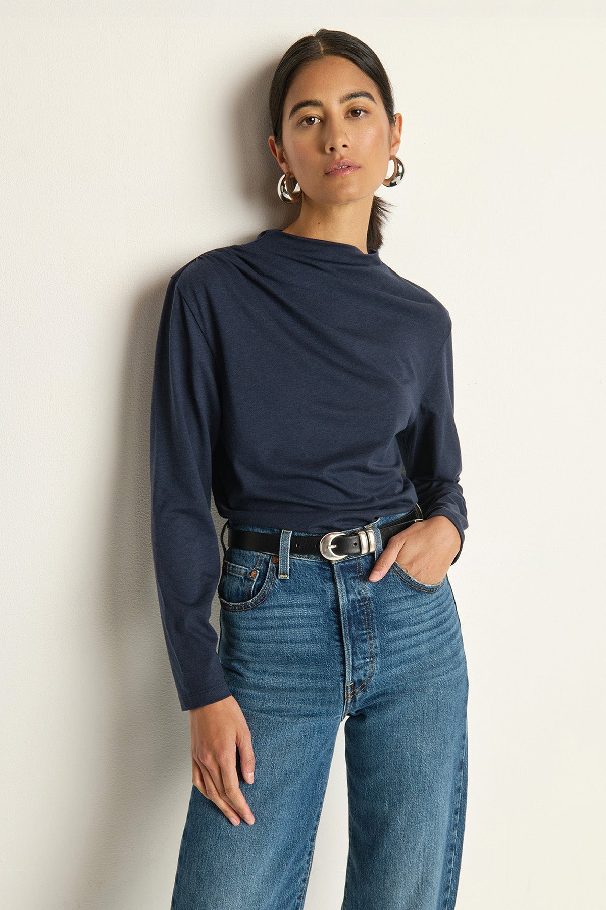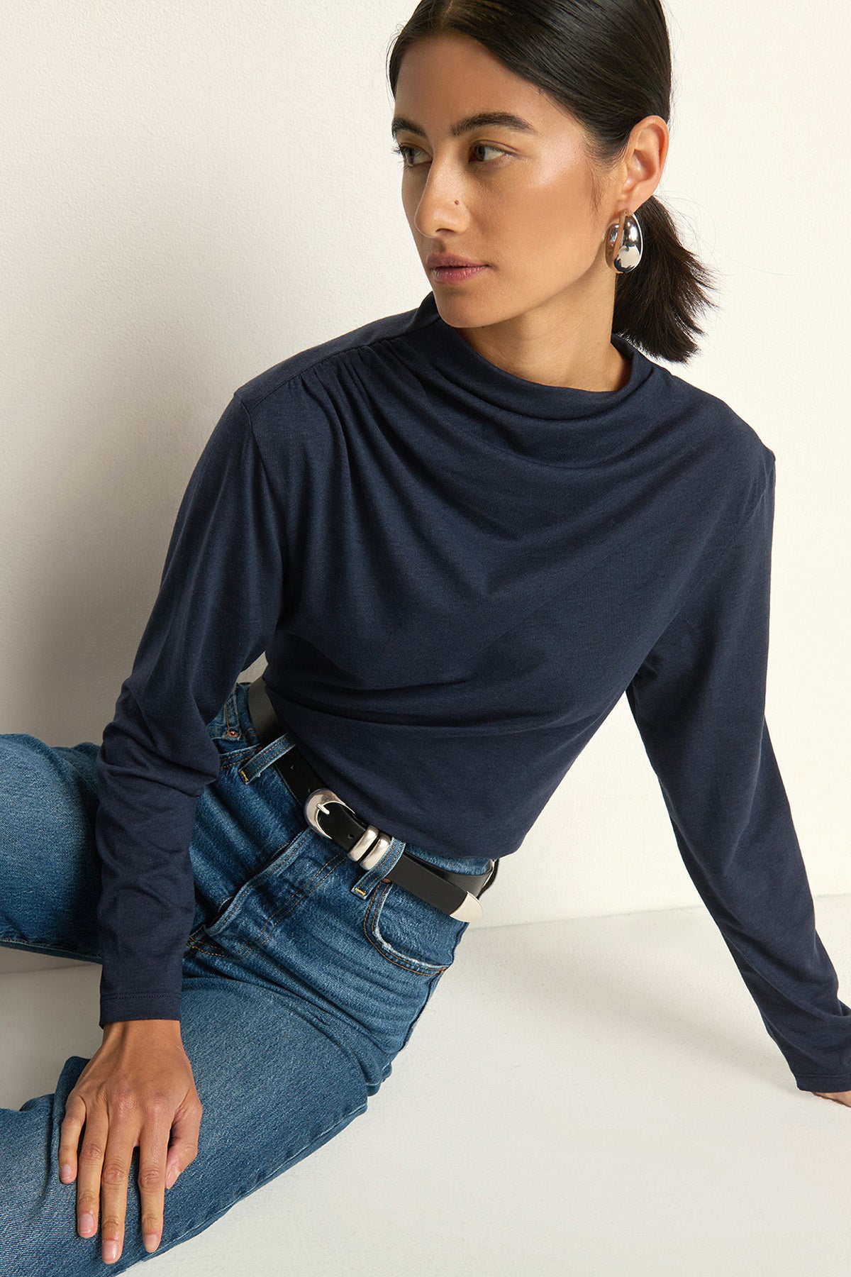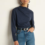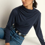 Navy mock neck long sleeve with elegant draping. Versatile and polished for any occasion, from office to evening wear.