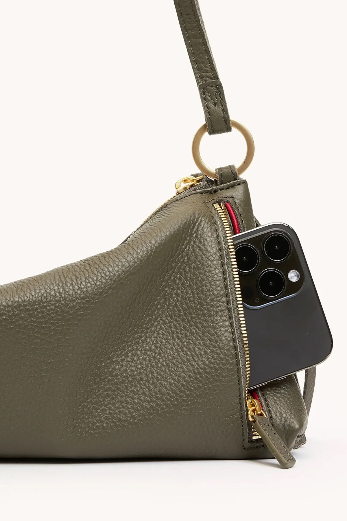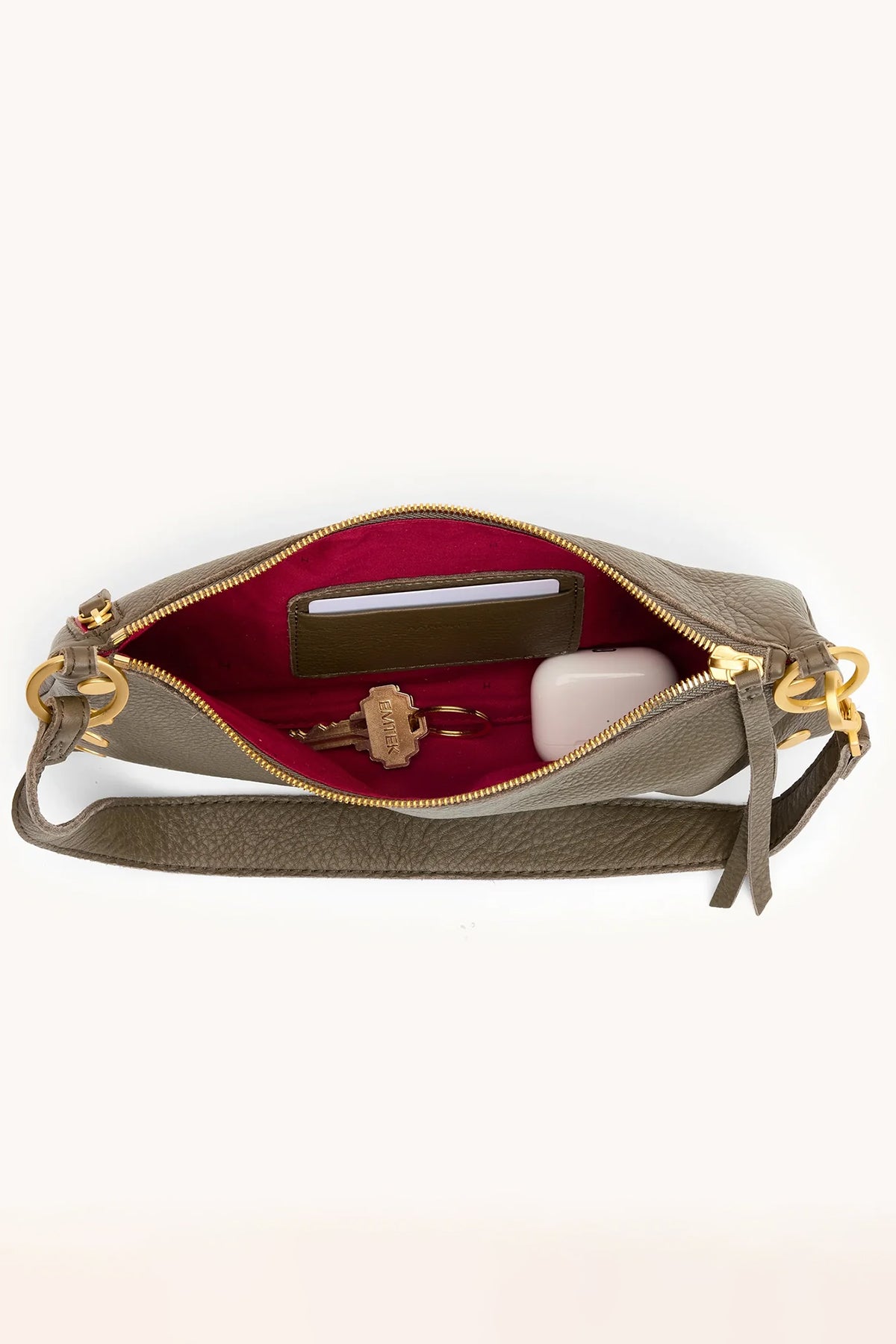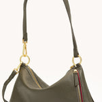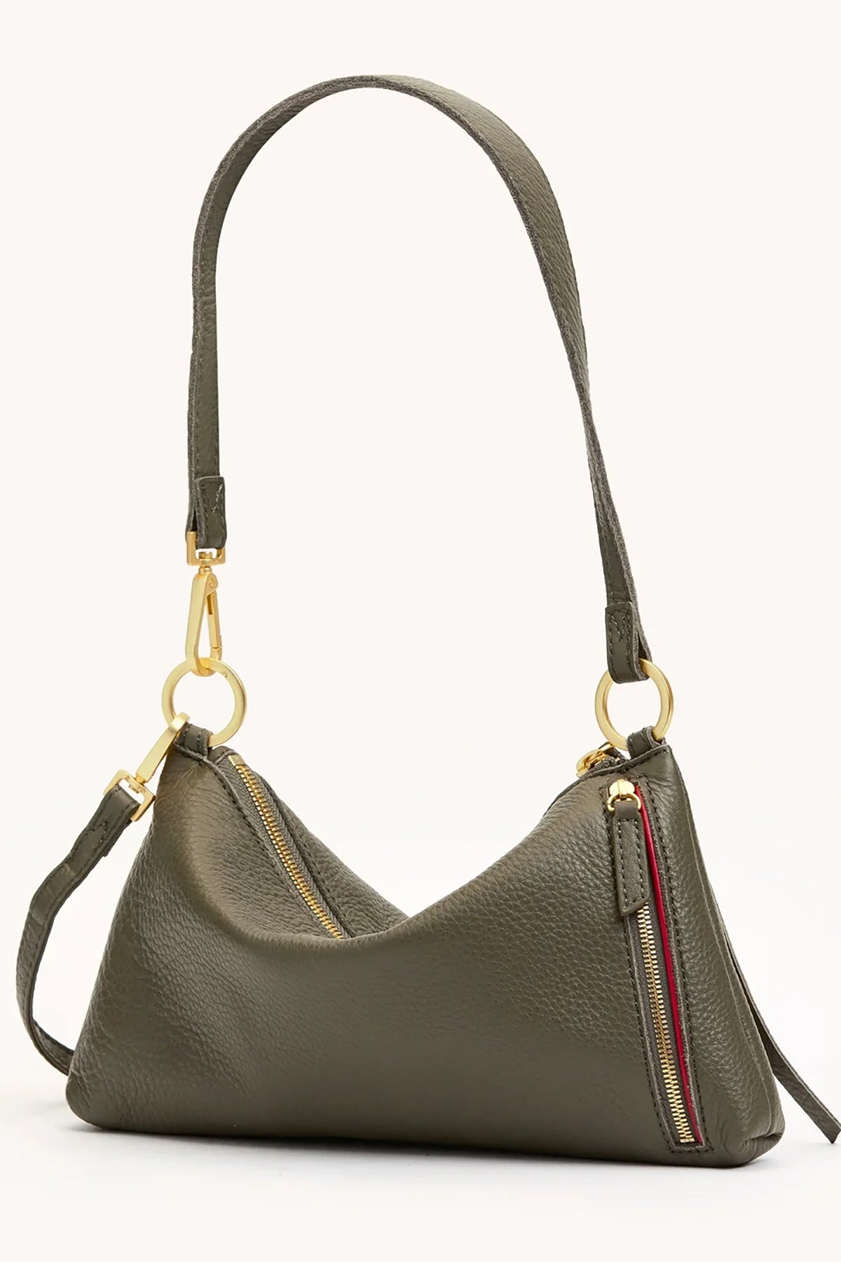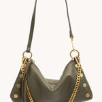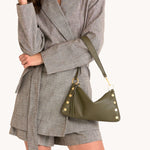 The Kyle is a sage green shoulder bag with gold details and a crossbody strap for easy, stylish wear.