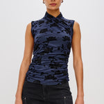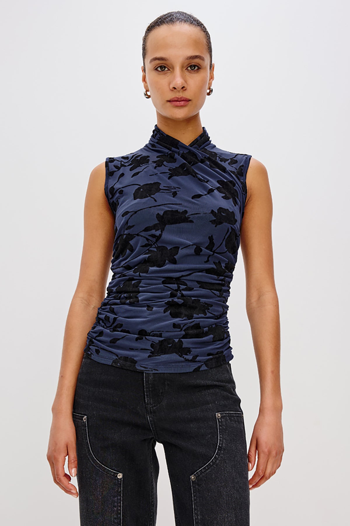 Lauris is a sleek mock neck wrap top with a sleeveless design that works beautifully layered or worn alone. The structured neckline adds sophistication while the wrap silhouette offers flattering versatility for any occasion.
