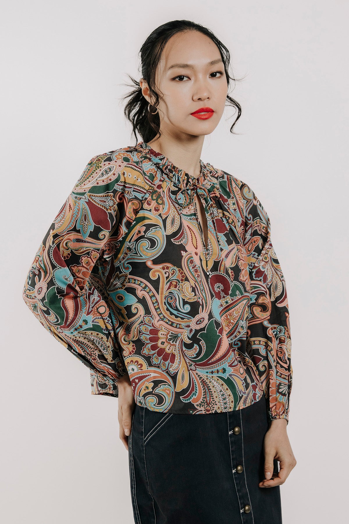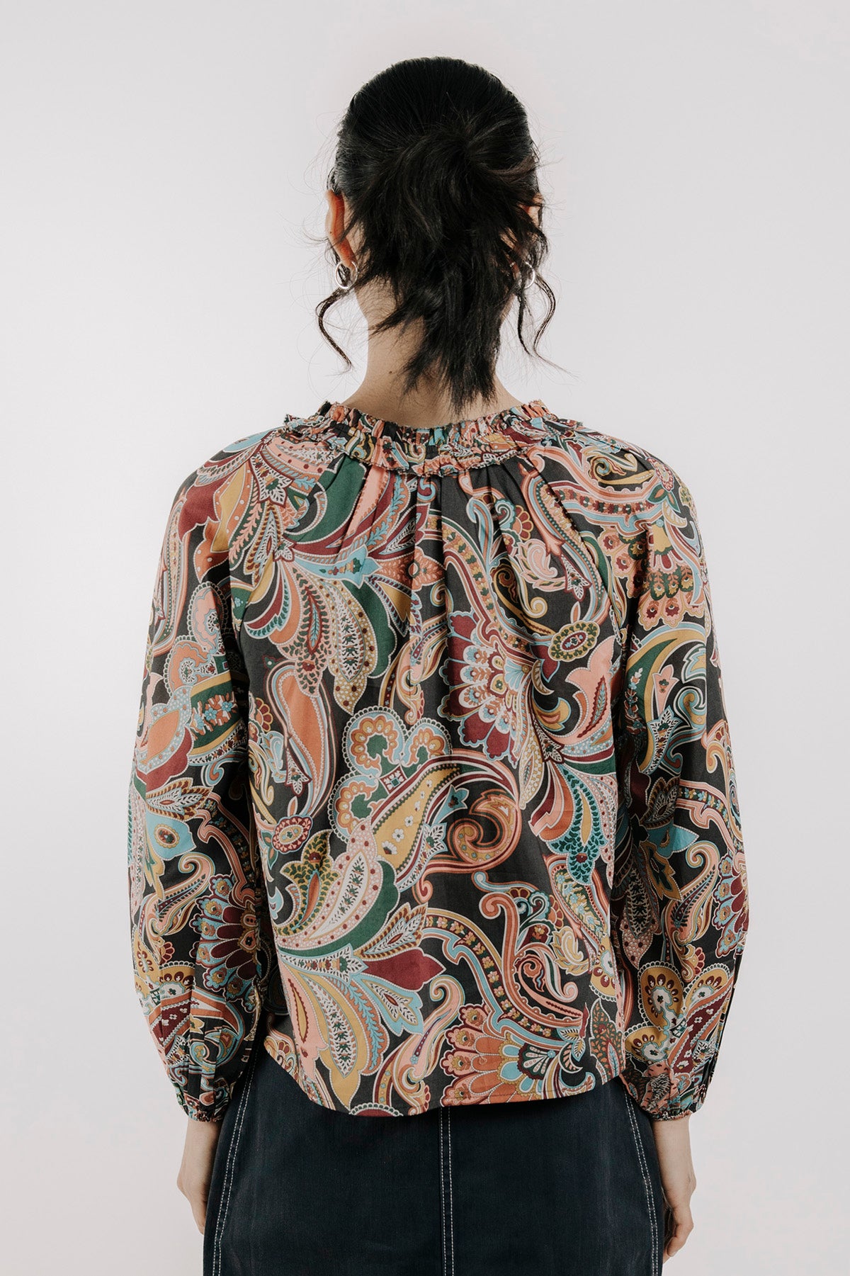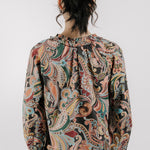 The Libby Top is a stylish long-sleeve blouse with a classic paisley print. Its comfortable fit and elegant design make it perfect for everyday wear or special occasions. Pair it with jeans or dress pants for a polished look.