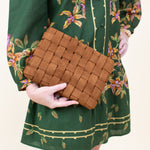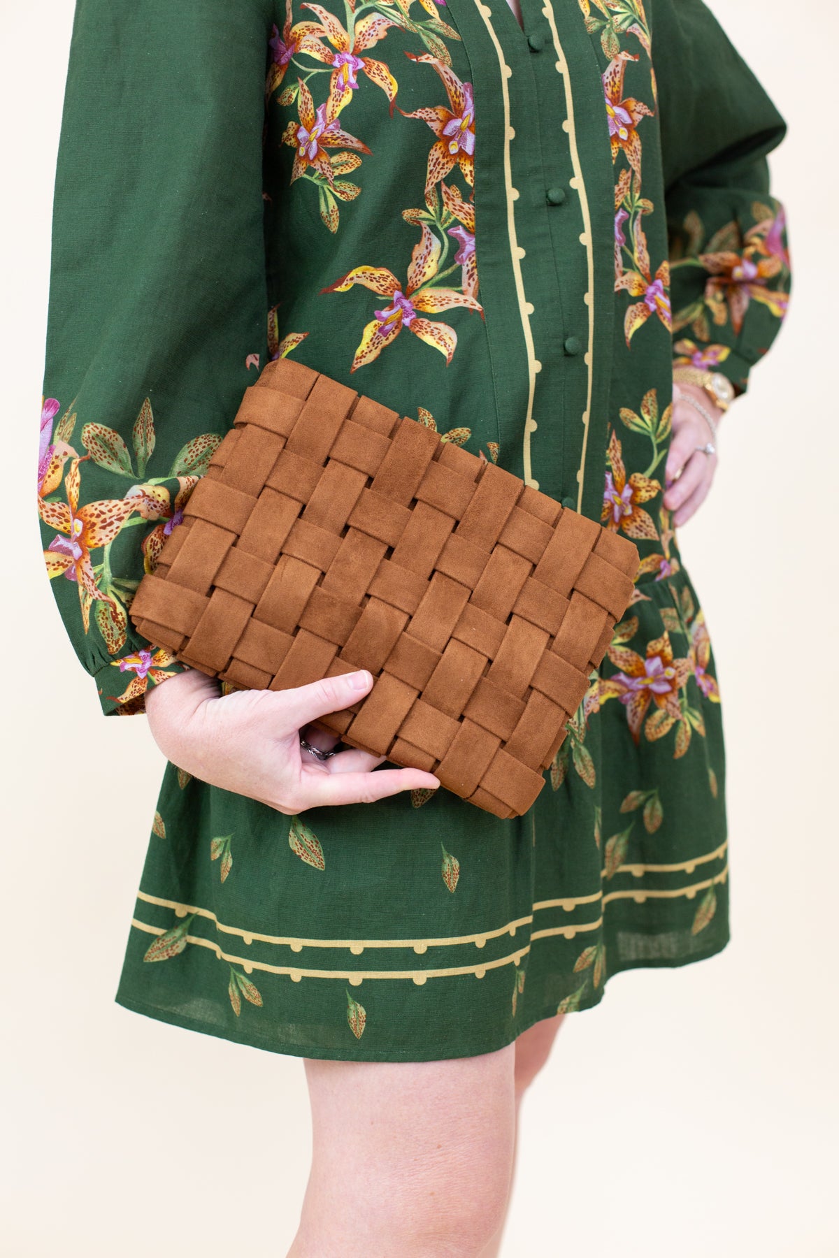 The Lindy Woven Large Faux Suede bag is soft and roomy with a trendy woven look. It’s lightweight and fits both day and night styles.