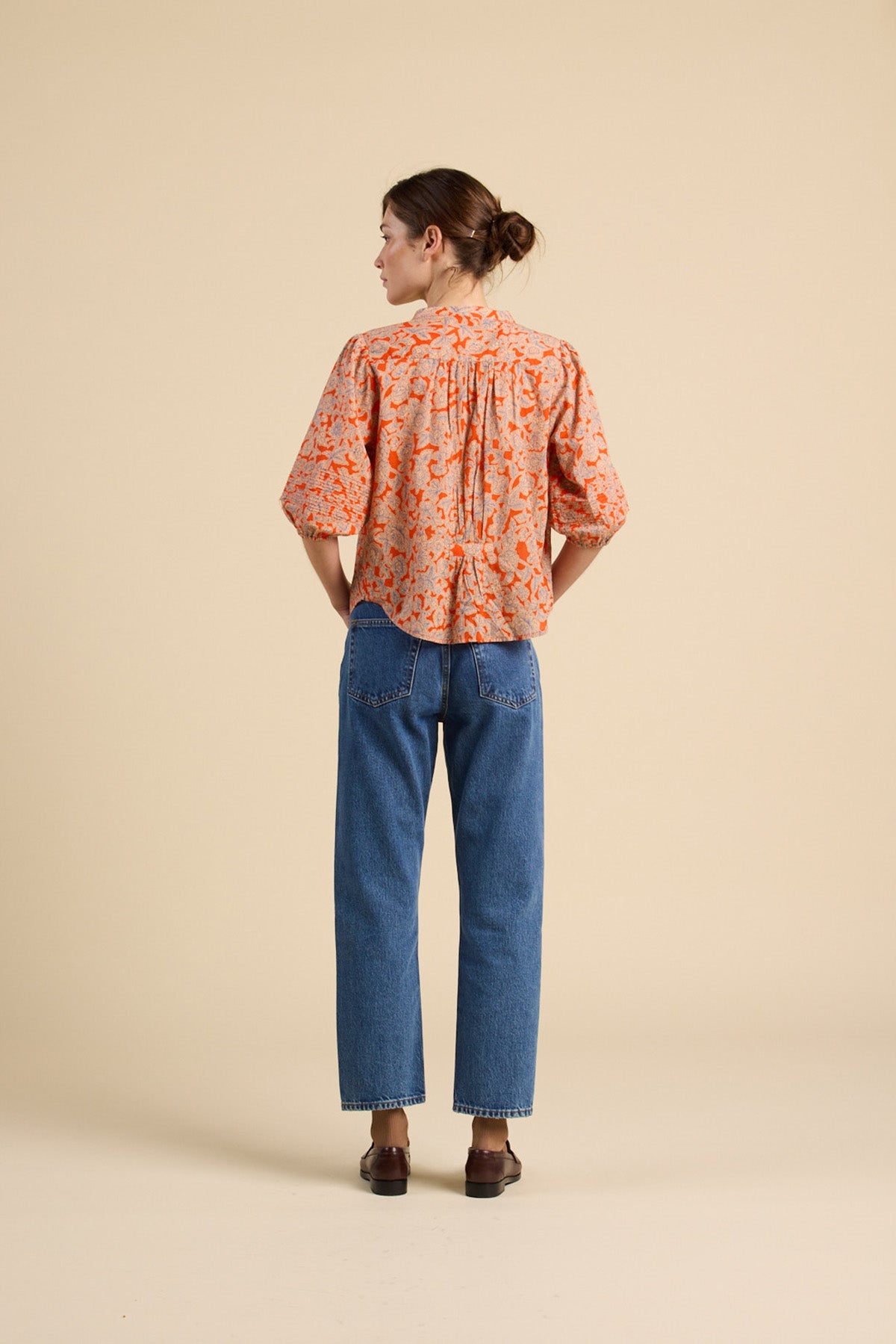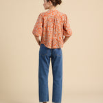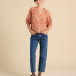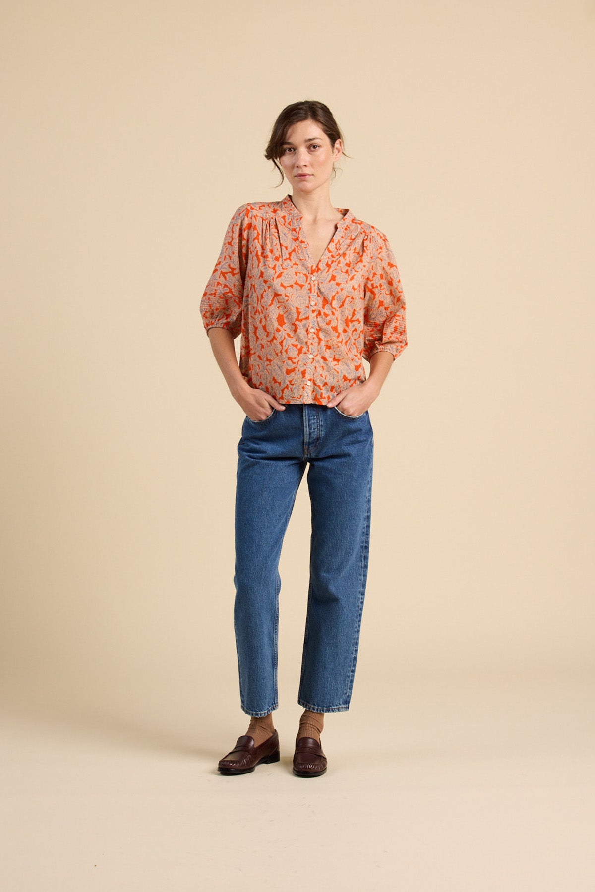 The Loren Blouse showcases a bright vermillion vine print on lightweight fabric, offering comfort and style for any occasion.