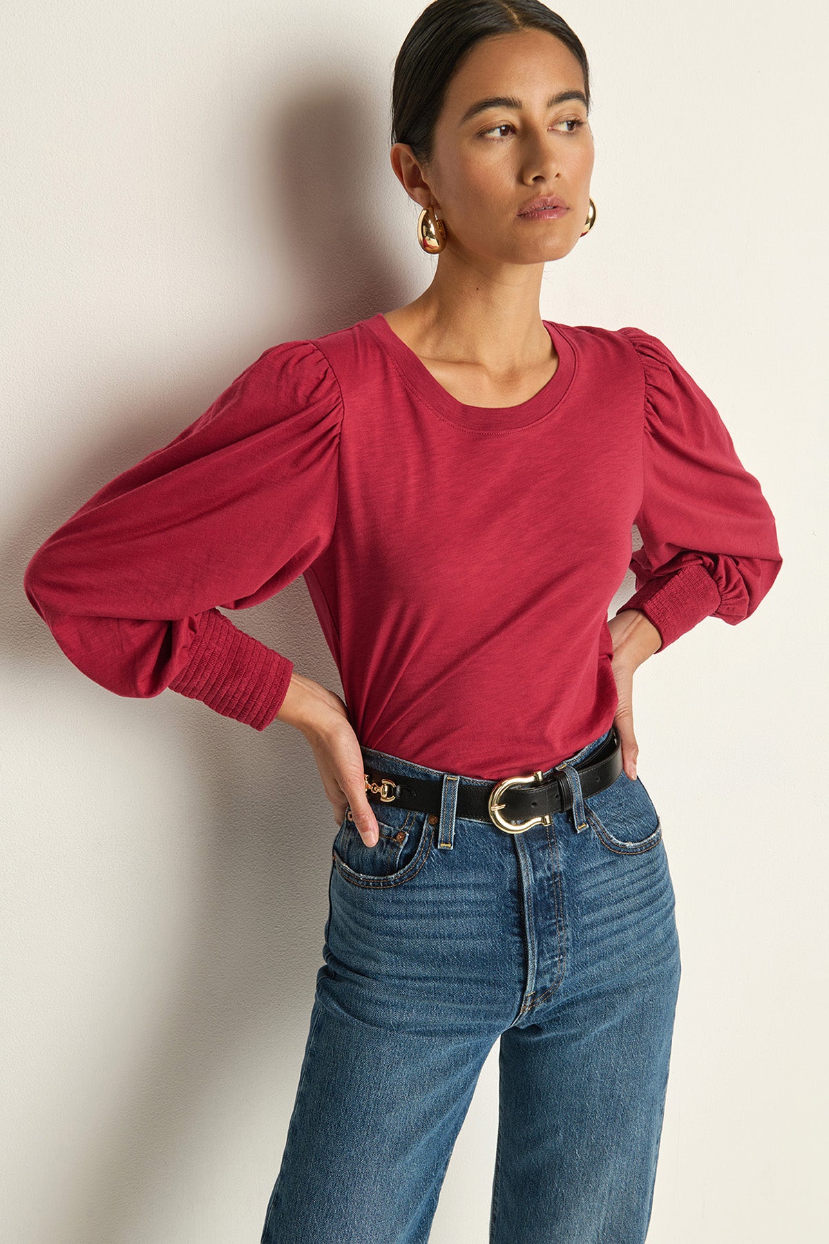 The Loren Peasant Tee in sangria is a romantic, versatile essential with vintage charm. Its relaxed fit and rich color work beautifully for any occasion, from casual yet elevated looks.