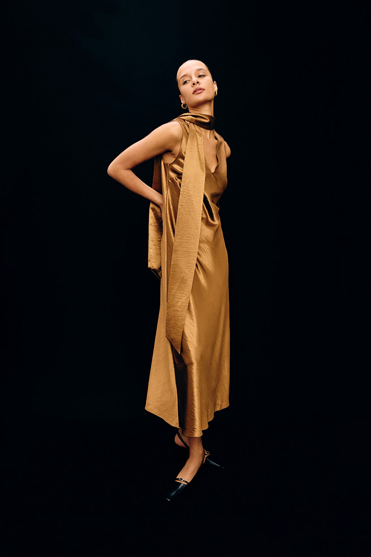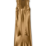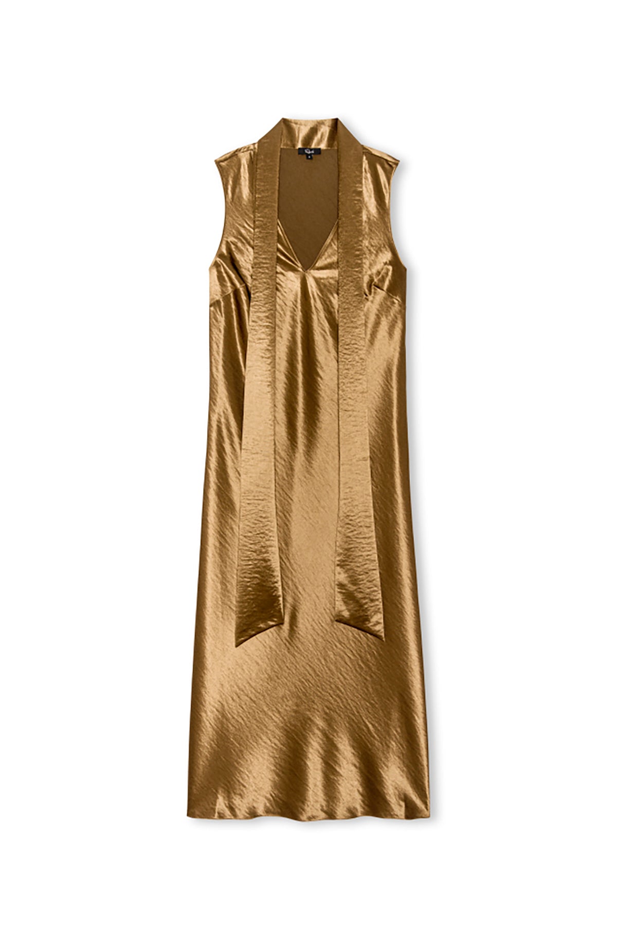 Lorenza is a ginger maxi dress with a sleeveless design and attached scarf for effortless styling versatility. The flowing silhouette and warm tone create an elegant look perfect for any occasion.
