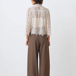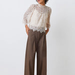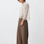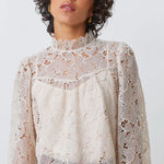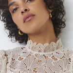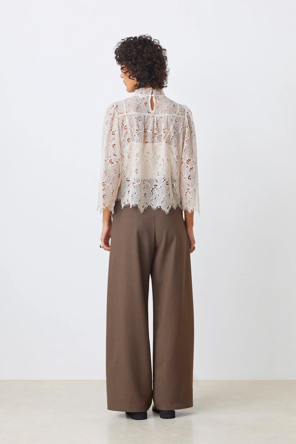 The Lucia blouse offers a high lace collar, three-quarter sleeves, and a lined design. It closes with two buttons at the back, combining elegance with comfort.