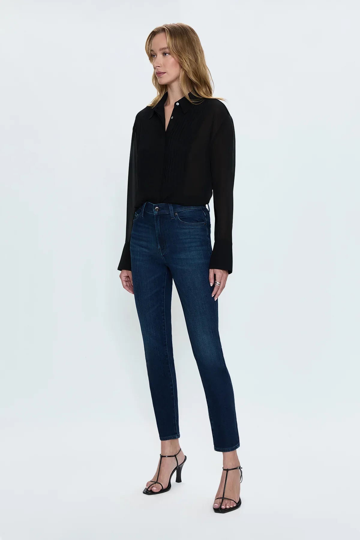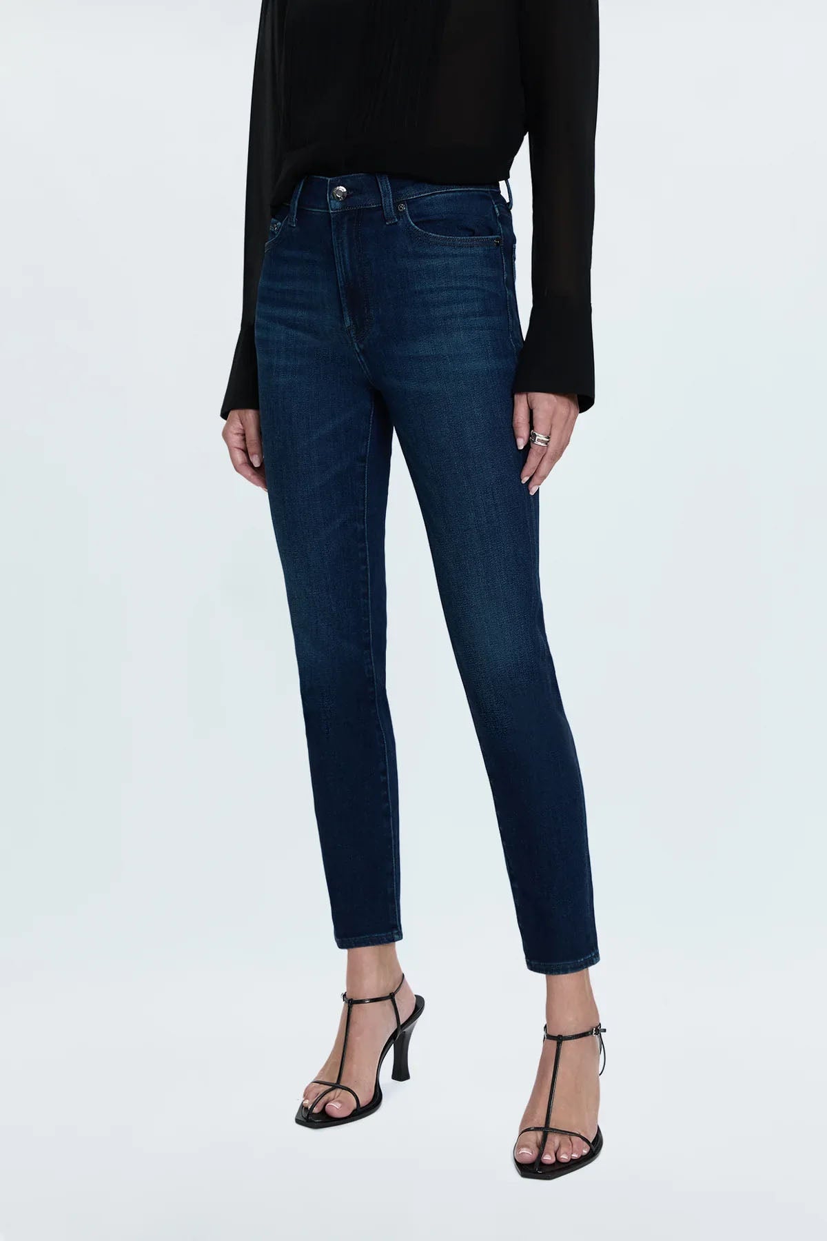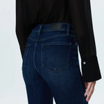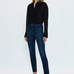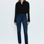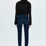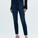 The Madi dark wash denim features a slim, straight-leg fit and a deep indigo color, perfect for any casual or dressy outfit.