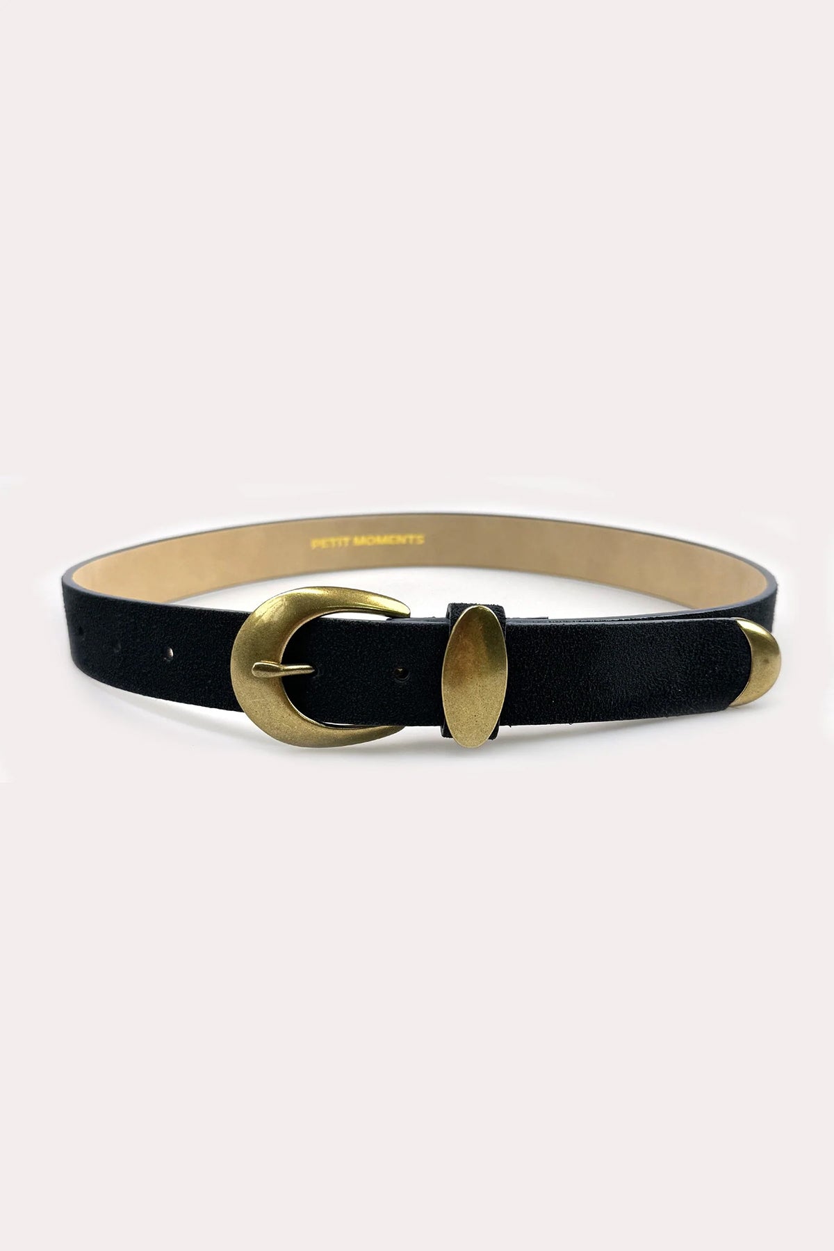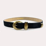 A sleek black belt with a striking gold buckle that instantly elevates any outfit. Cinch dresses, define your waist, or add polish to casual looks with this versatile accessory.