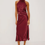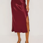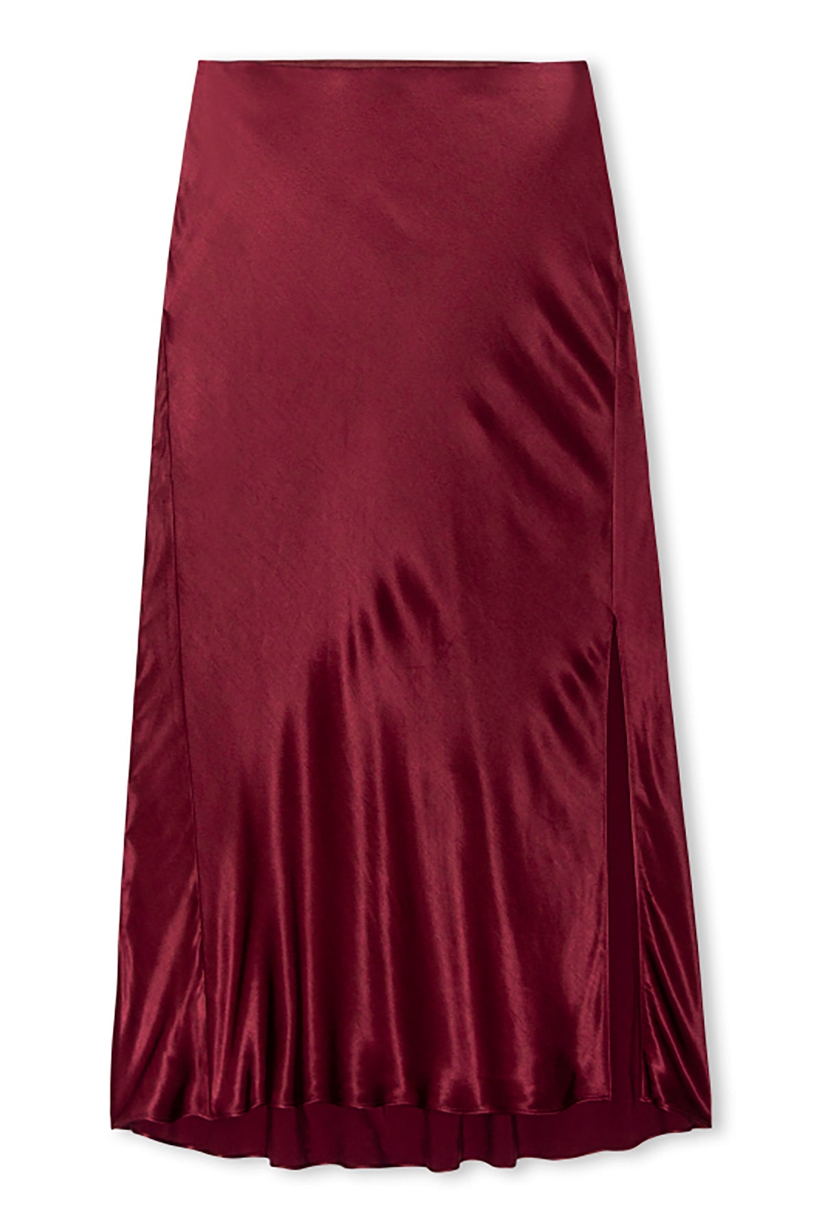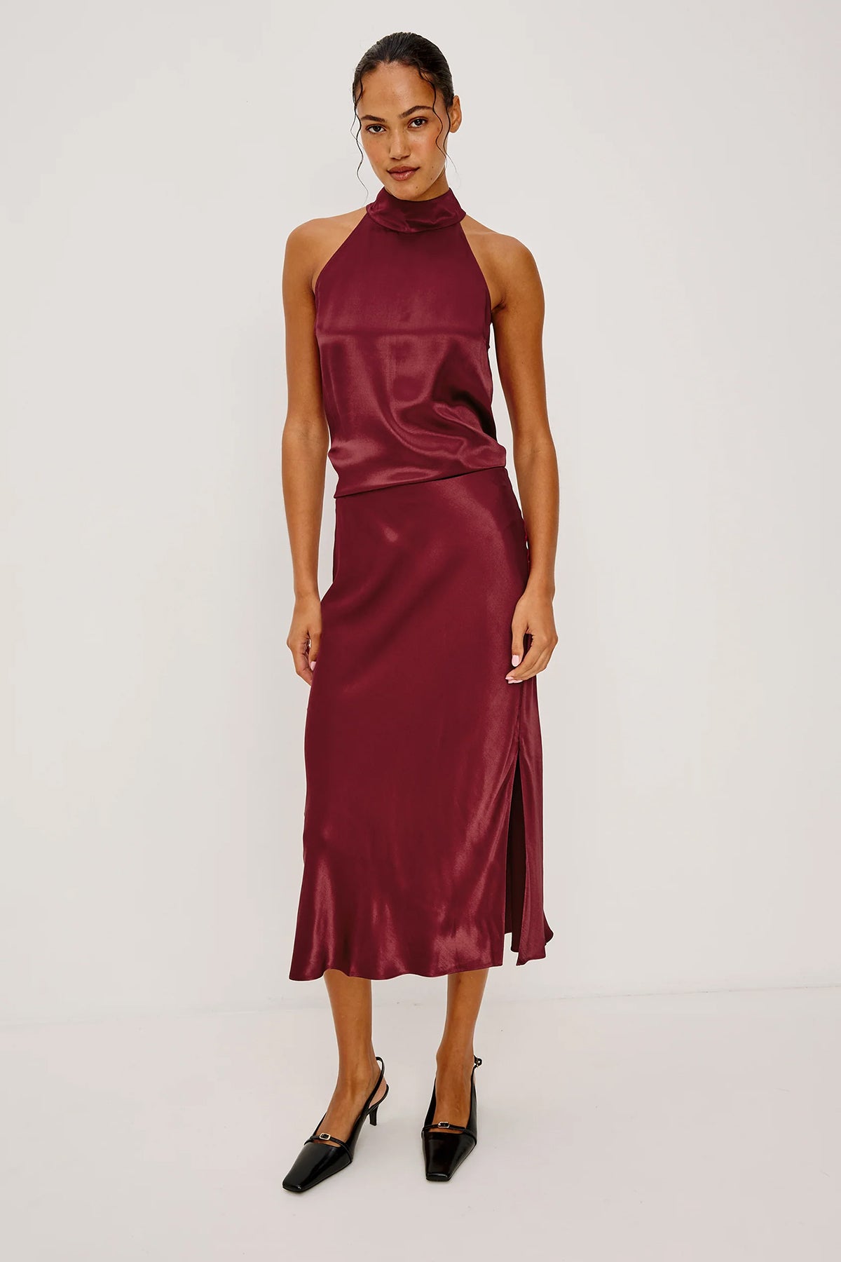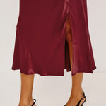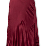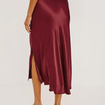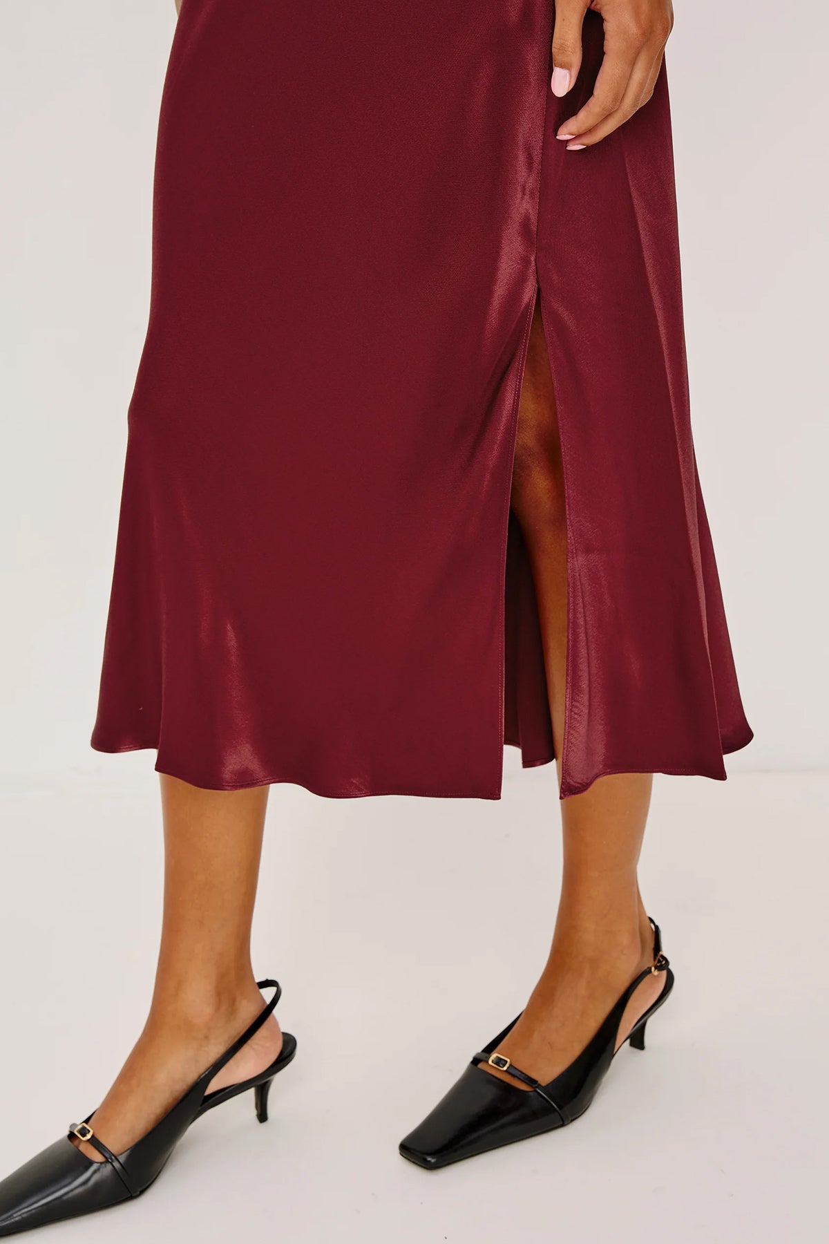 The Maya midi skirt in garnet has a smooth, silky feel and flows beautifully. Its rich color adds a stylish, elegant touch to any look.