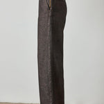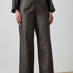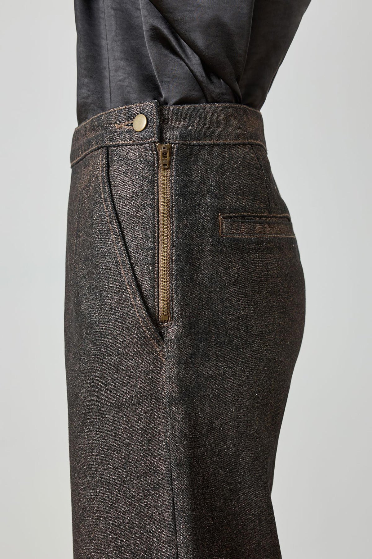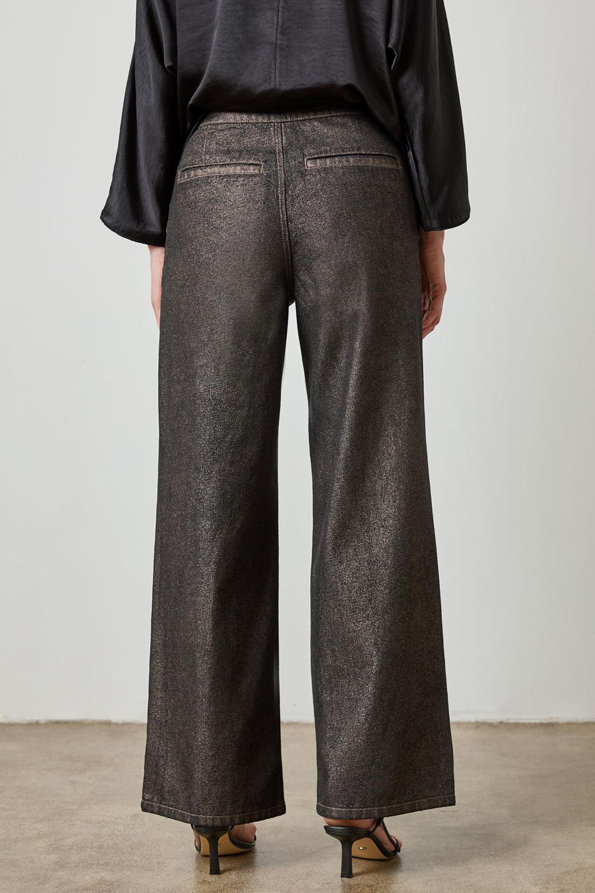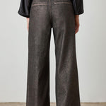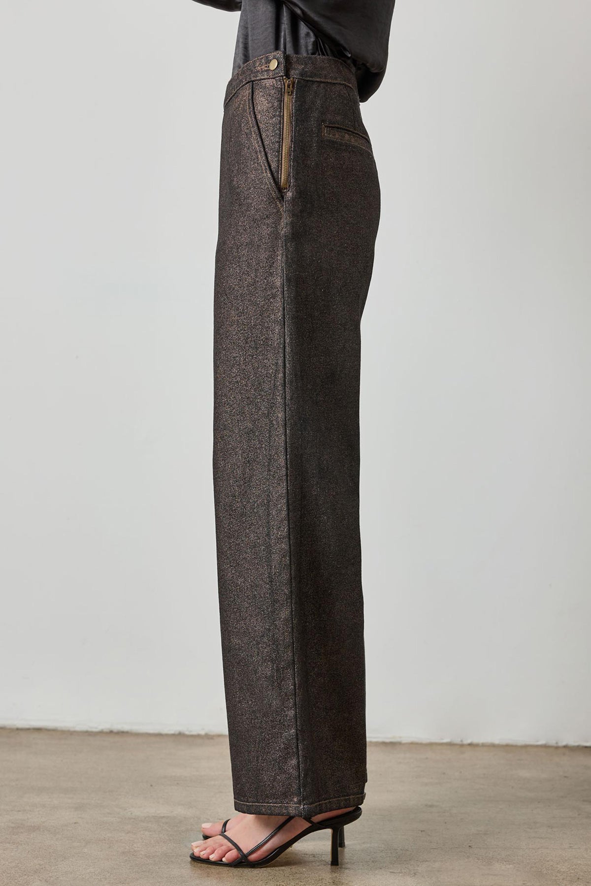 These metallic denim wide-leg pants combine classic denim with a shiny finish for a sleek, modern look. They create a flattering silhouette and add a touch of sparkle to any outfit.