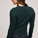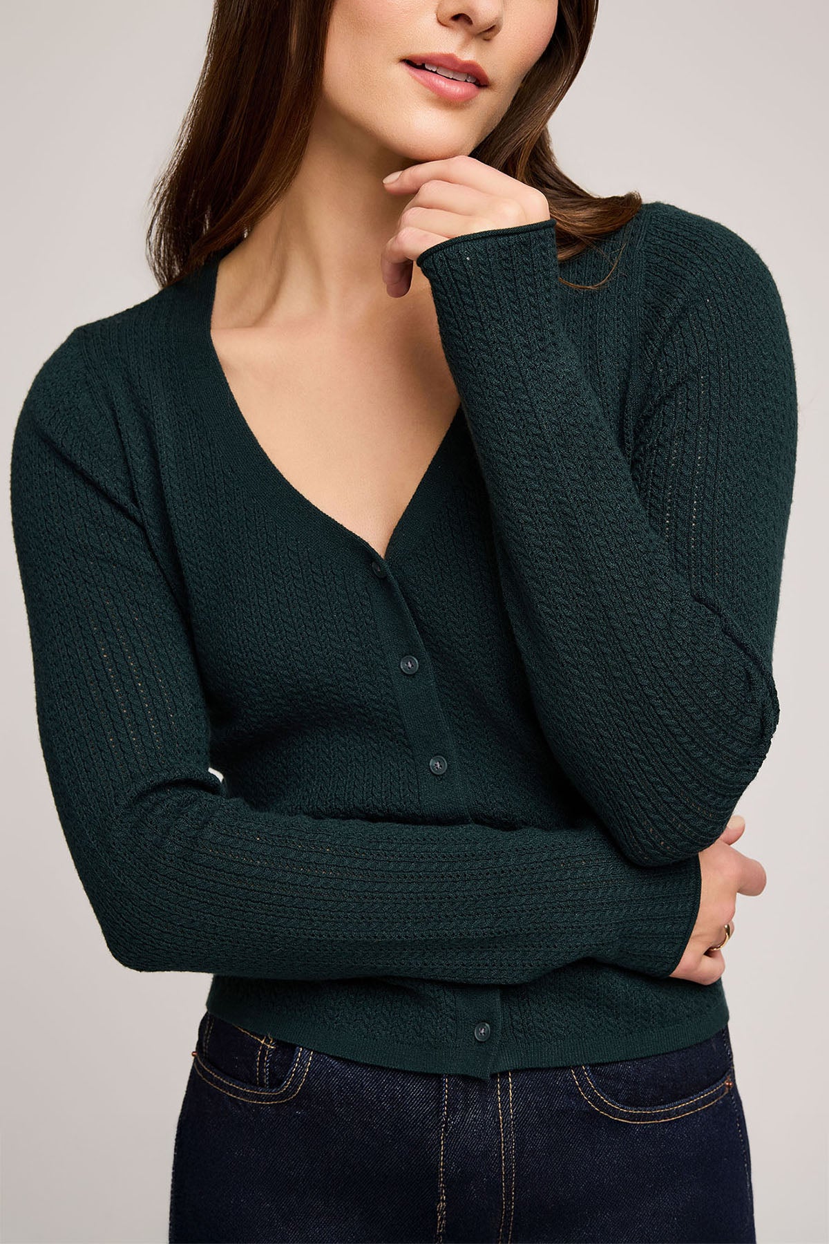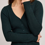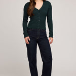 The Mia V-neck Wintergreen Cardigan offers a stylish fit and rich color, perfect for layering and adding a chic touch to your winter outfits.